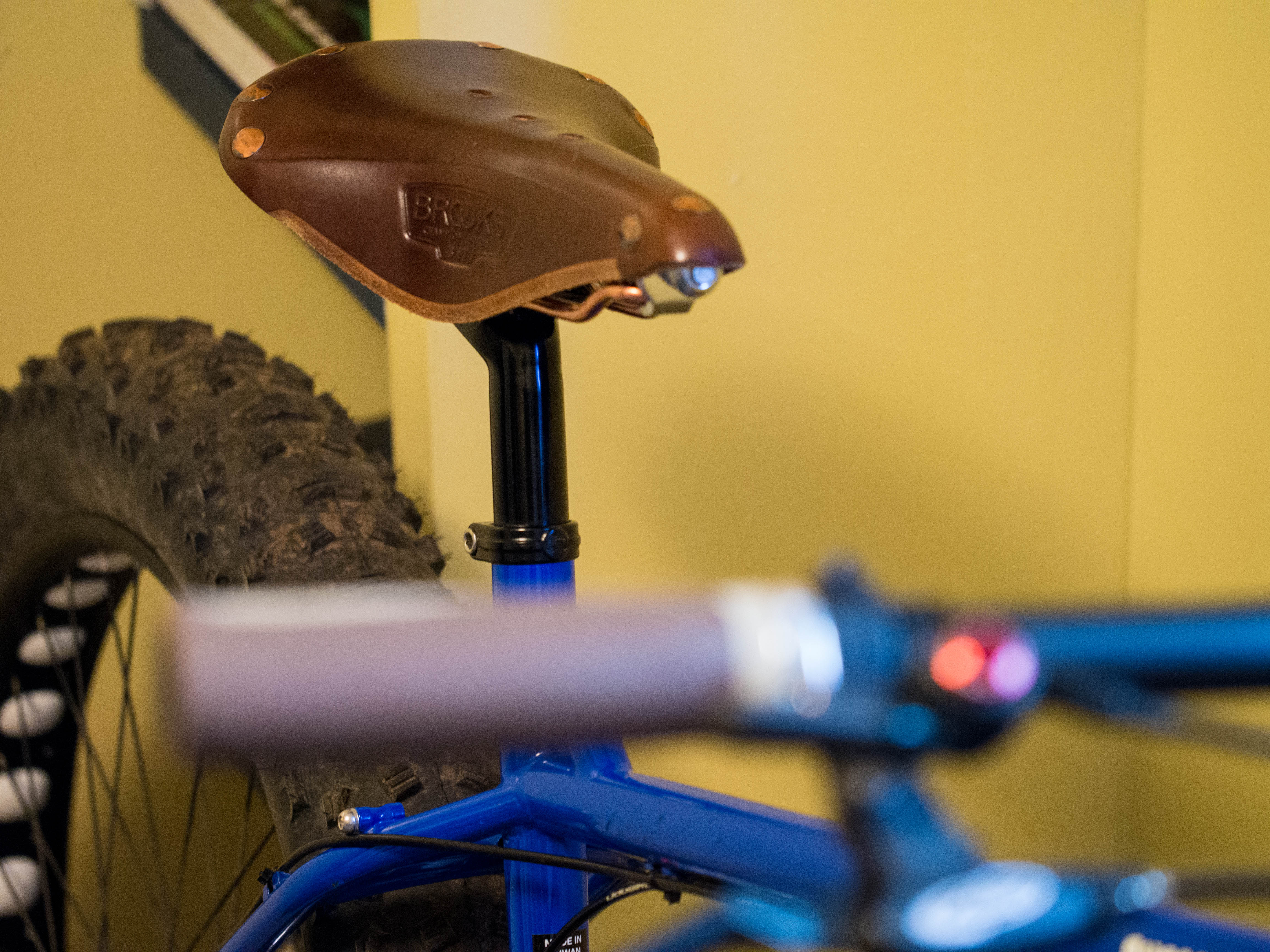 A couple rides on the stock seat felt like straddling an axe head. I knew the seat had to go. I’m a big fan of Brooks saddles and have them on two of my other bikes. I took the Brooks saddle off my commuter and put it on the Pugsley to try it out. Perfect. Yeah it’s heavy, it has no padding, and it is leather and takes a bit of care, but Brooks saddles are supremely comfortable. So, I bought a nice brown B17 saddle for the Pugsley and I am very happy with it. It seems to suit the bike very well.