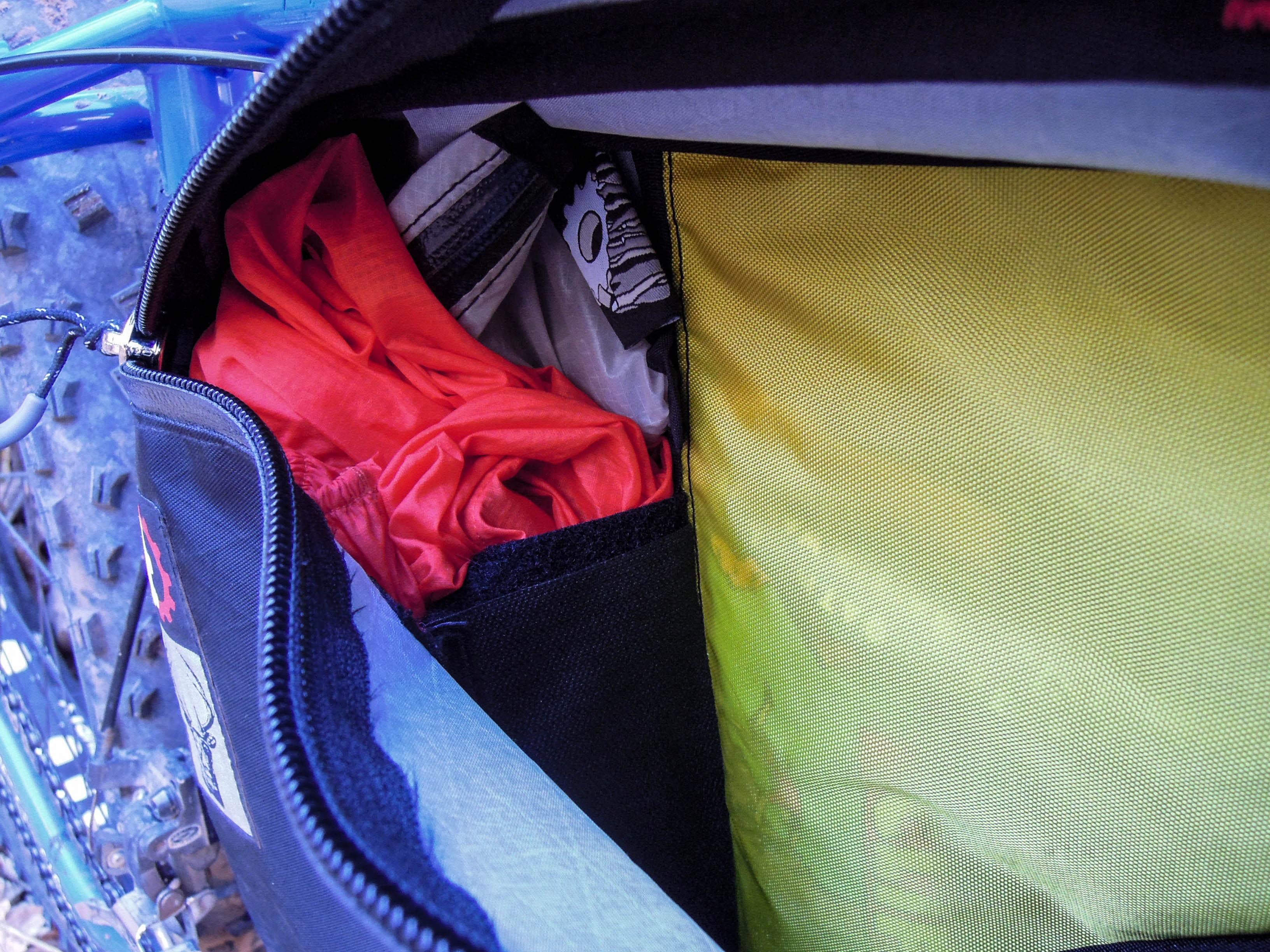 The main compartment, on the right side of the bike, with all the gear mentioned above except the camera and tripod. Still room for more gear. Notice the waterproof zipper “garages” as well, where the zipper stores when it is zipped up all the way.