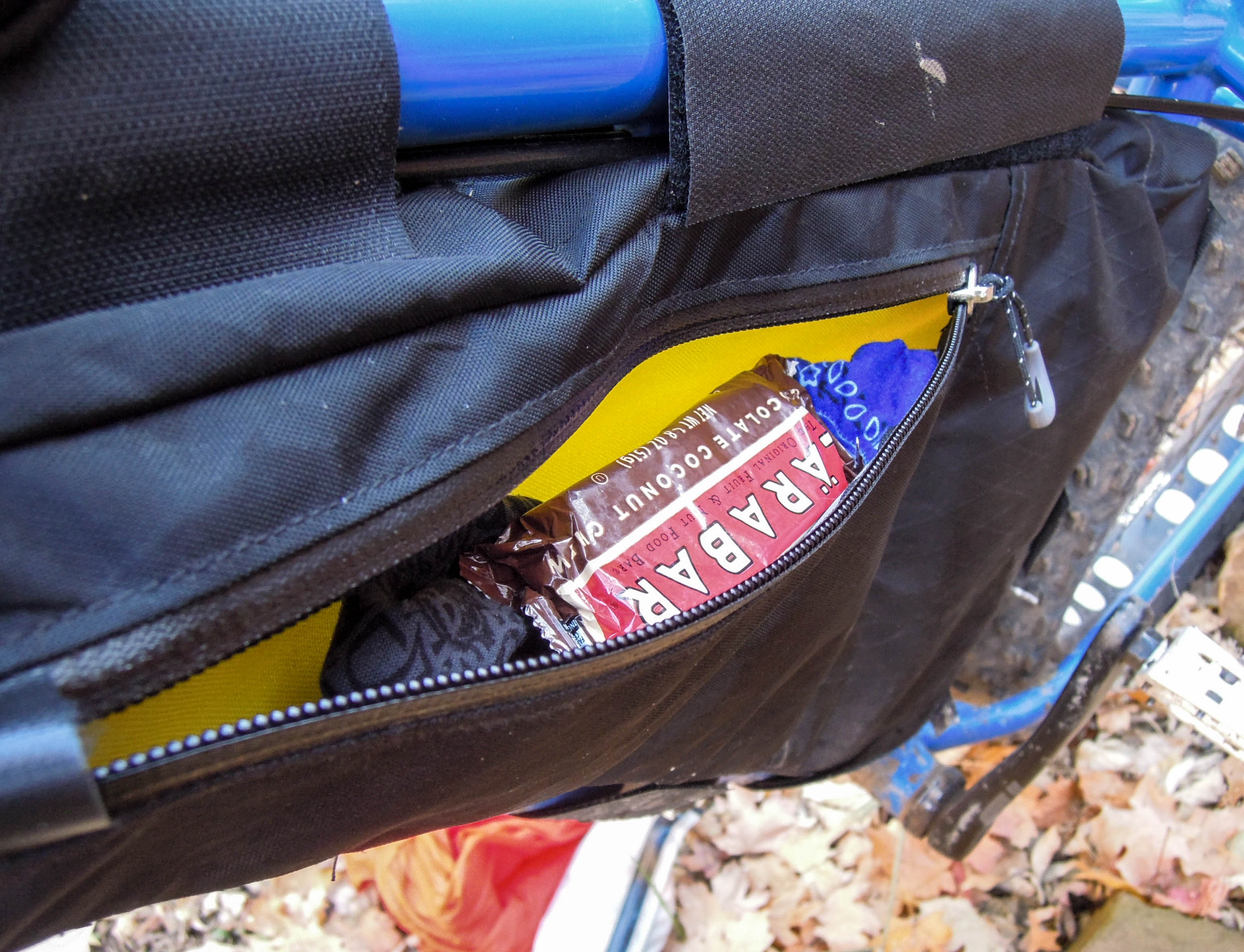 When I first started using the frame bag I was surprised how much I could fit in it. For a longer ride away from civilization I can easily fit the following in it: