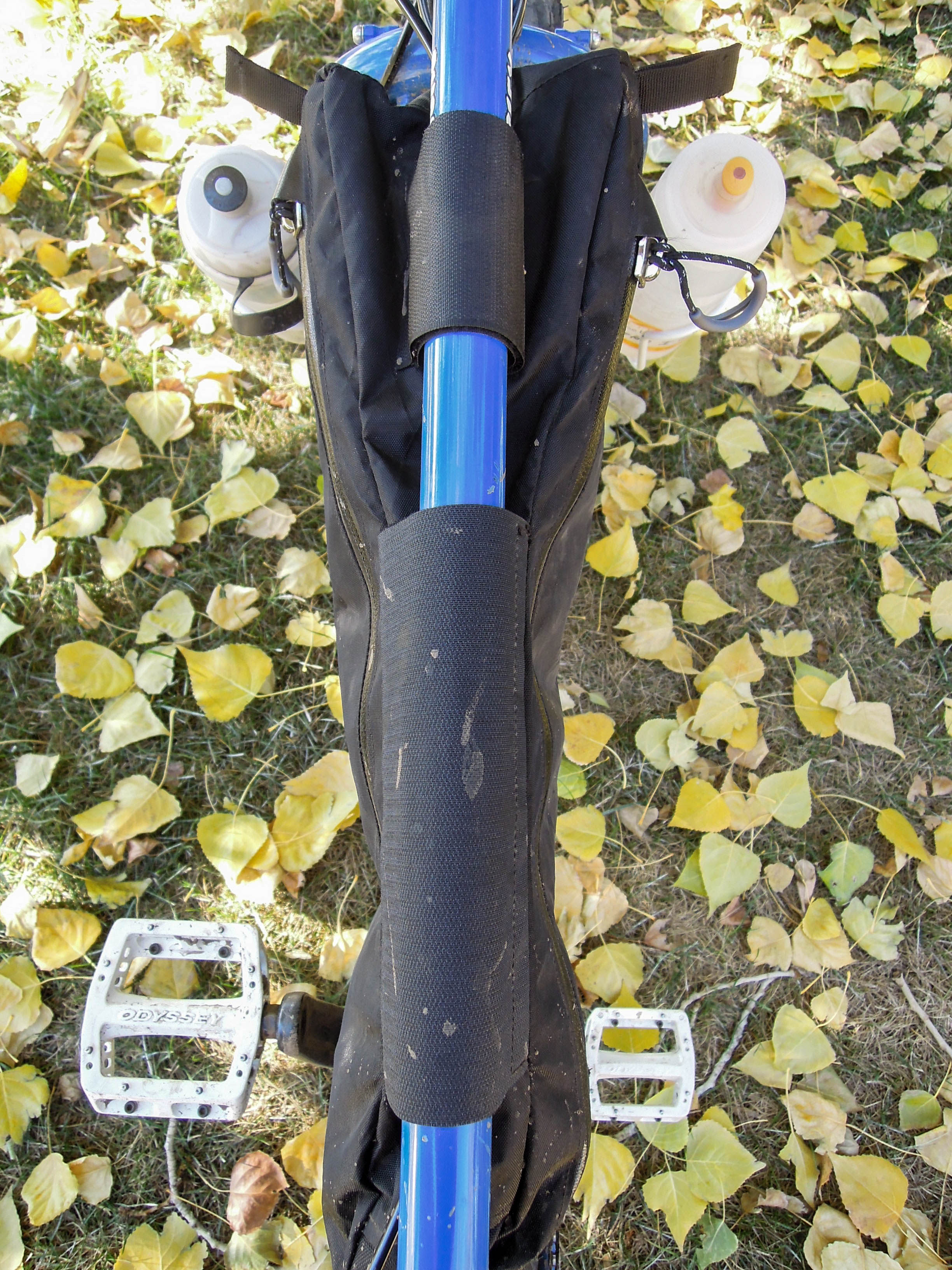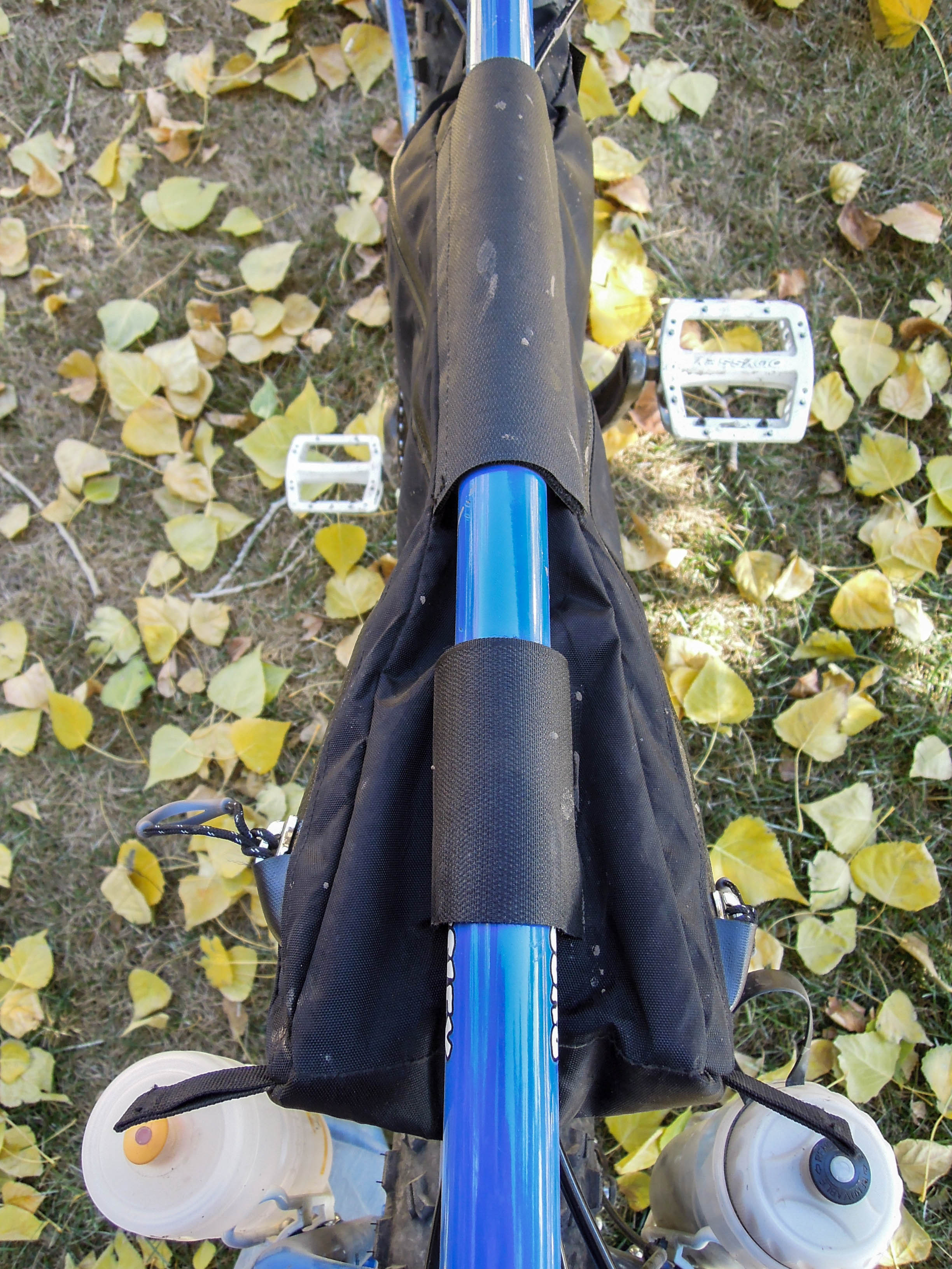 I don’t like to wear a pack on my back, when I can help it, when I am riding off road, so the frame pack works great for me. The main frame of a bike is also an ideal place to carry gear. One thing to consider is that with a frame pack you no longer have access to your water bottle cages. But you do have a few options. You can store your water bottles inside the pack, or put a bladder in the pack and run the tube up and out. Or, since most fat bikes have bottle cages on the forks, you can simply put your bottles there. That is what I do and find that they are easy to access and I don’t notice the extra weight up front at all.