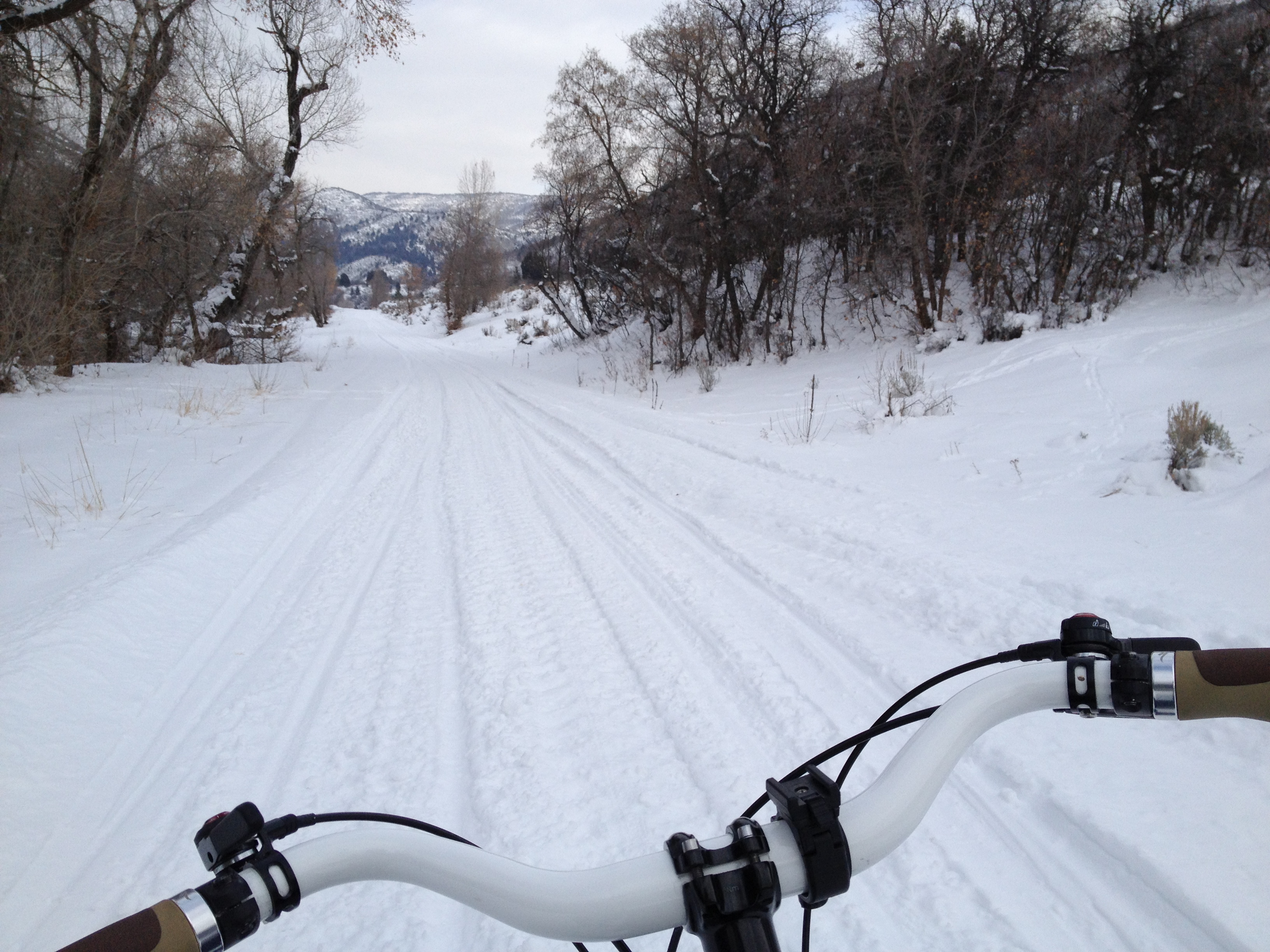 Friday afternoon I rode up Hobble Creek Right Fork from Jolly’s Ranch where they stop plowing up to the Wardsworth Canyon trailhead. Again, just some snowmobile tracks to follow. Conditions were okay but pretty soft at times and again, pretty hard work. I was able to follow some other fat bike tracks for the first five miles. If I was careful to stay right on those tracks it was much smoother. If I varied at all the snow got pretty deep pretty fast, especially on the edge of the road. The snowmobile tracks were okay but unreliable. Sometimes smooth, and other times I was wallowing. I managed to get in 14 miles in about 3 hours. I hope conditions get better as the Winter progresses. I have a lot of training in the snow ahead of me. But despite the challenge, I am really enjoying my first winter riding in the snow.