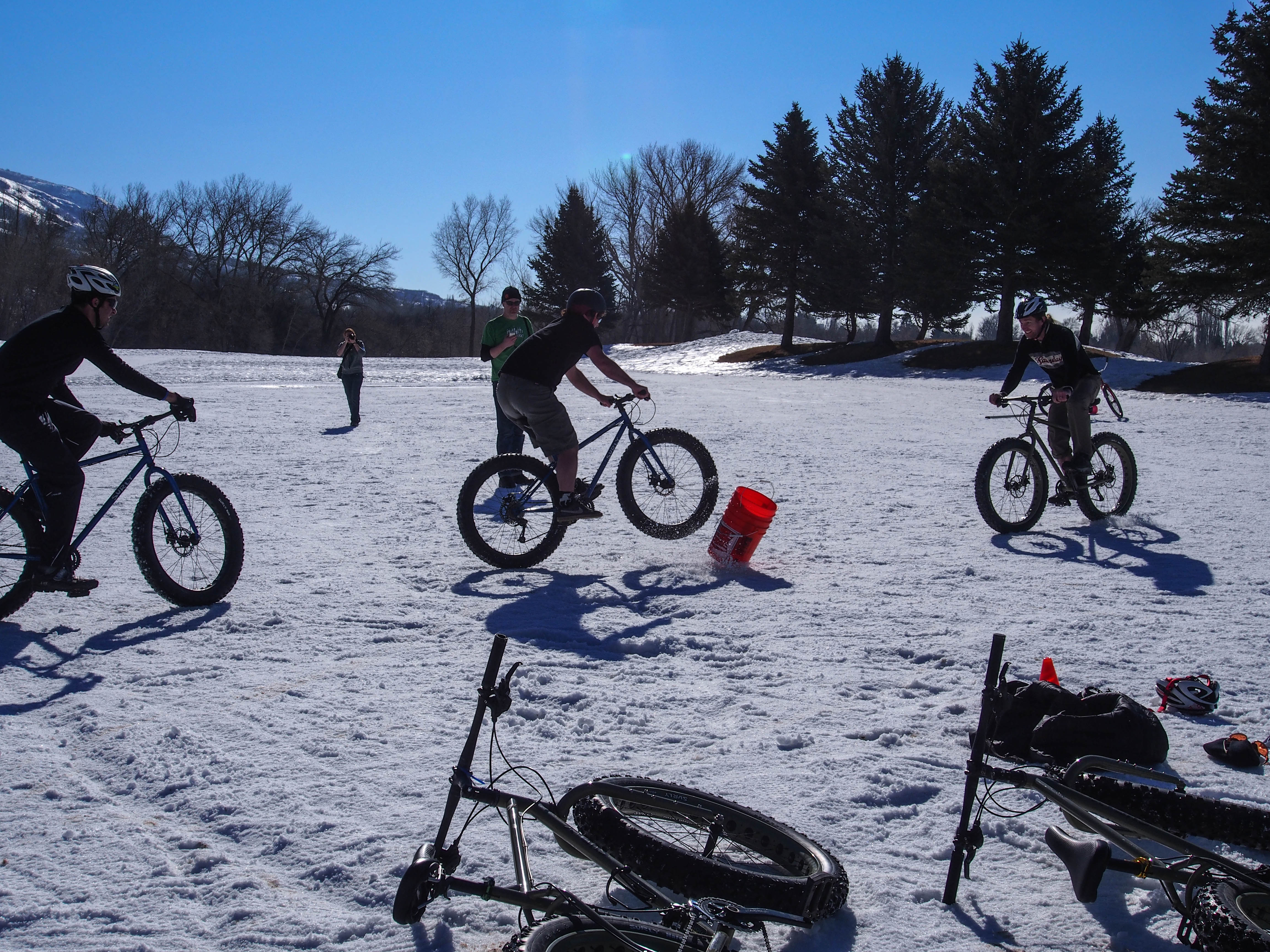 Other activities included bike jousting and a lively game of bucket ball. Two teams of cyclists on fat bikes line up on a field facing each other. A five gallon bucket serves as the ball. You can only touch the bucket with your bike. The object is to get the bucket across the goal line of the opposing team. If you touch down, you must ride off the field back to your goal line, then you can get back into the game. It was pretty entertaining to watch. Surly was sponsoring this event and provided Pugsleys for one team and Moonlanders for the other team.
