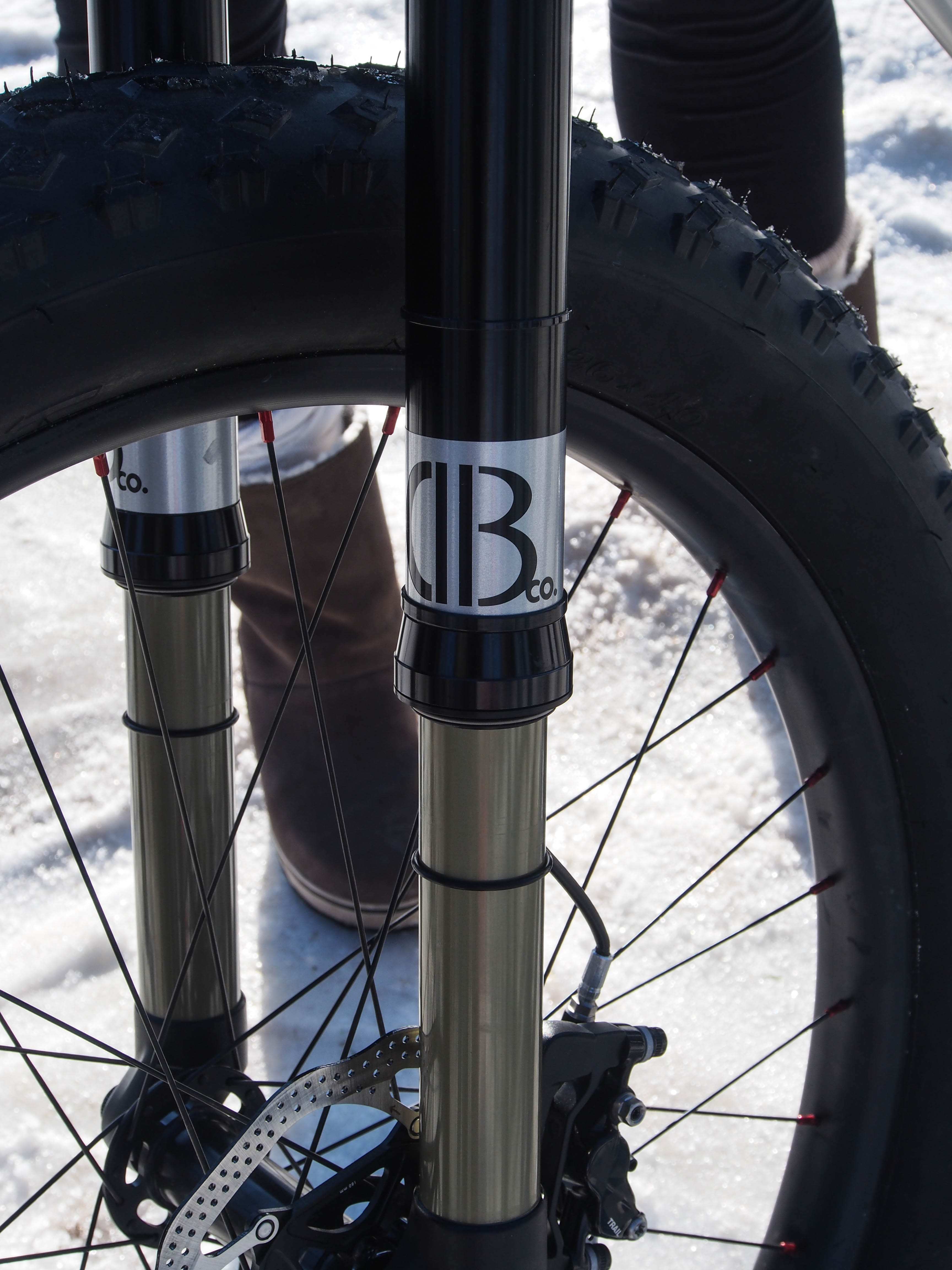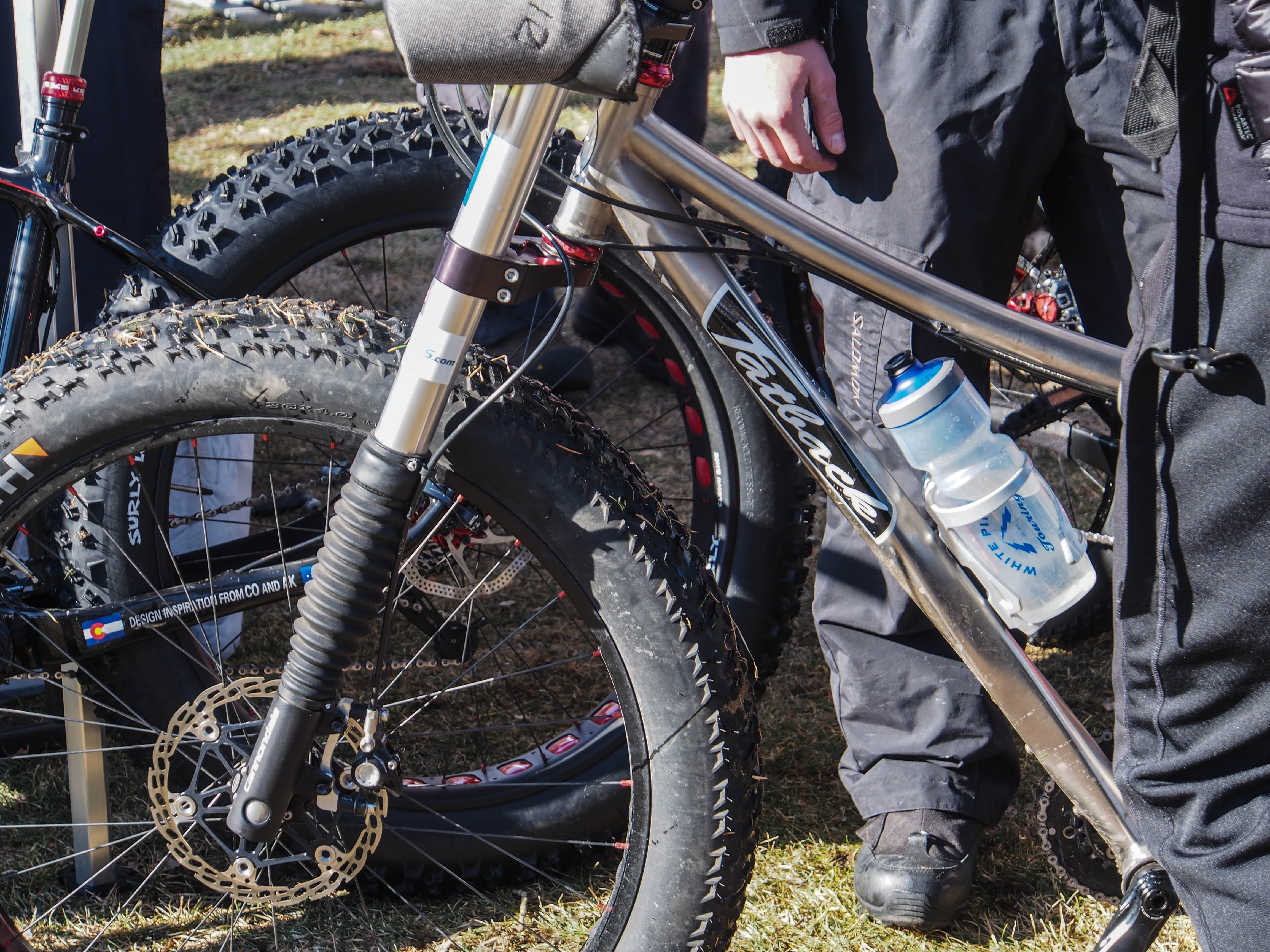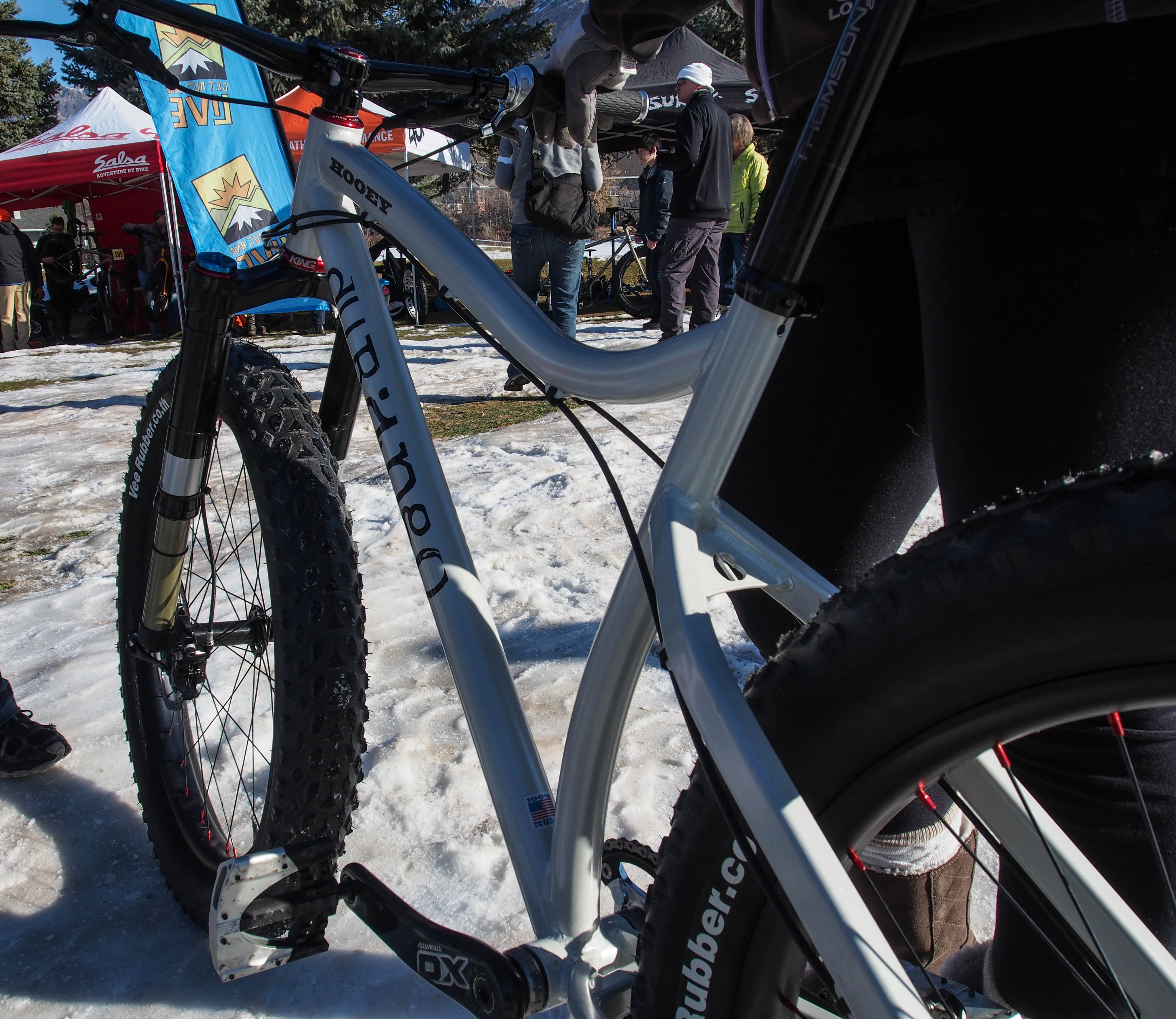 Perhaps the most beautiful fat bike we saw was a Durango Hooey. The Durango Bike Company is a small bike maker (husband and wife team) located in Durango, Colorado. They make mountain bikes and this aluminum fat bike. They are all hand-made in the U.S.A. The Hooey was an impressive bike. They even made the front shock on this bike.