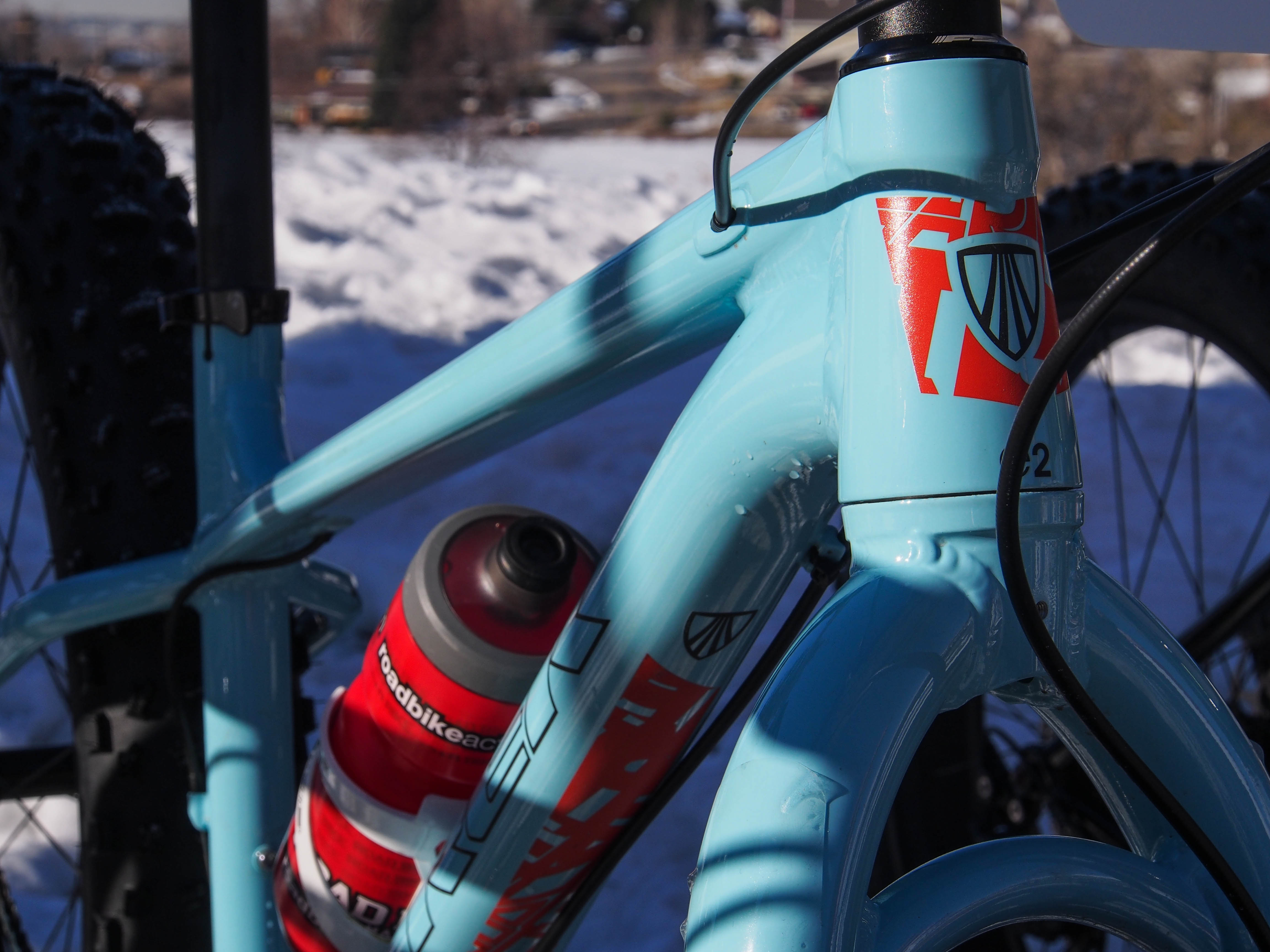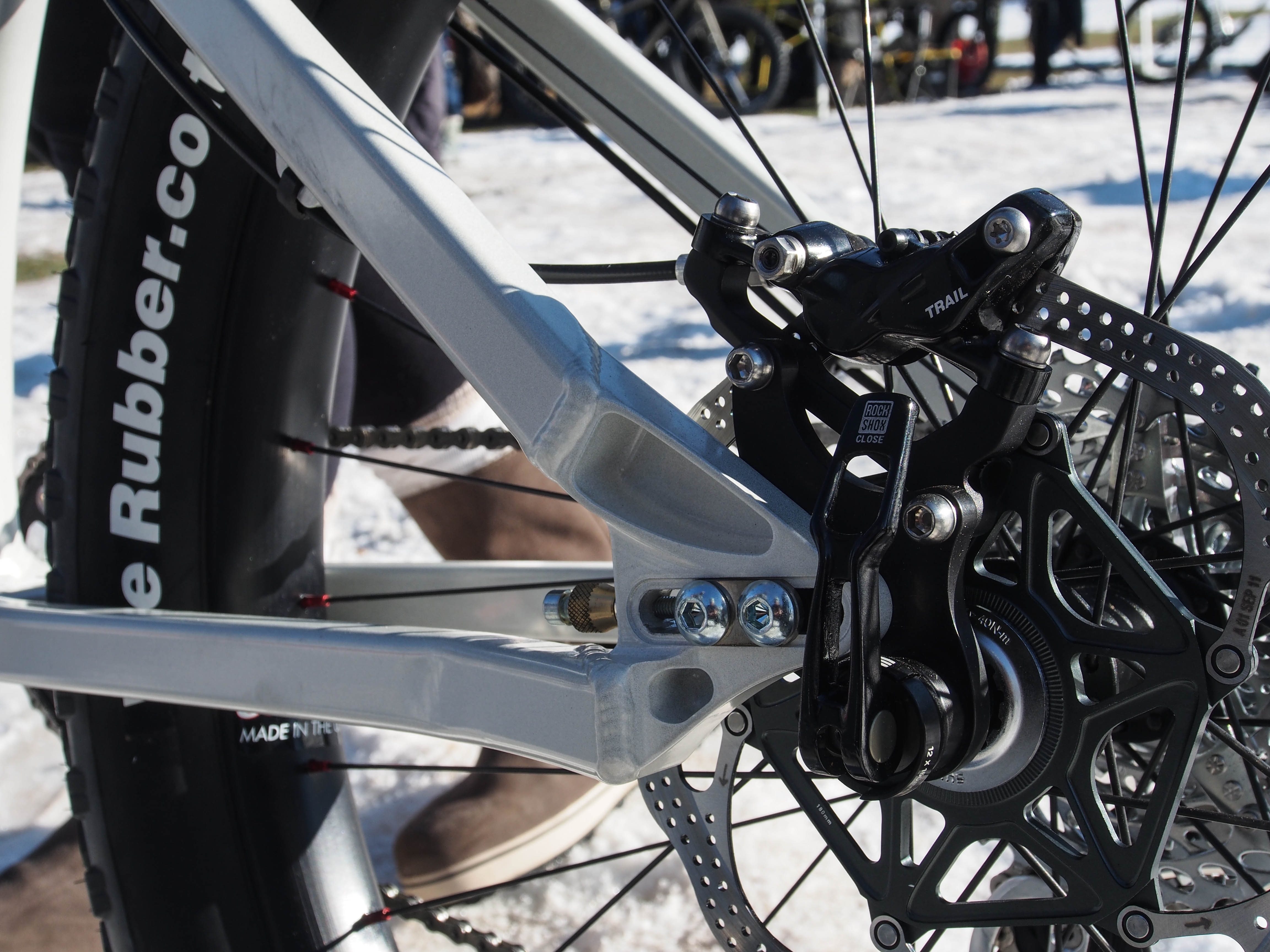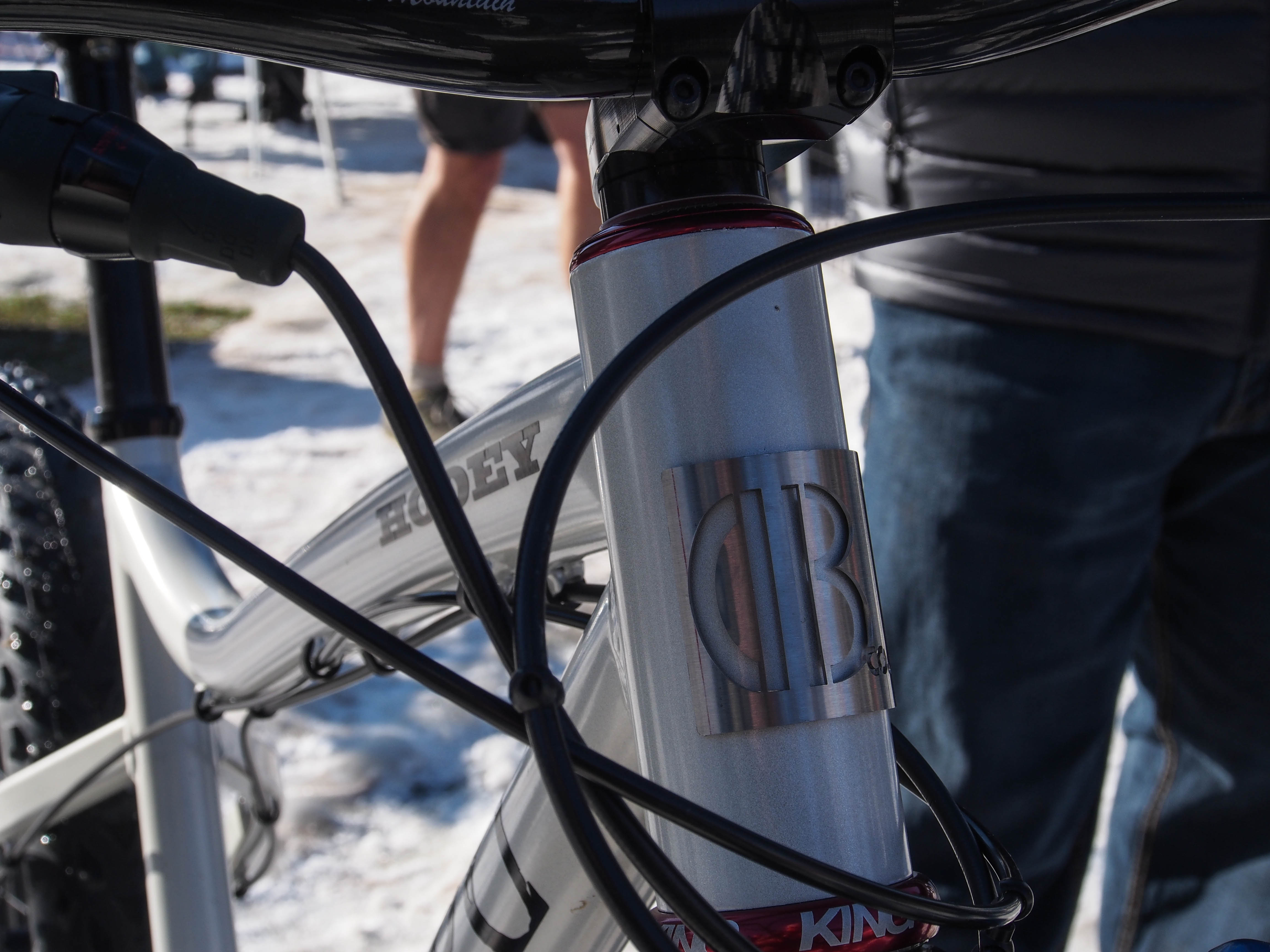 Perhaps the most beautiful fat bike we saw was a Durango Hooey. The Durango Bike Company is a small bike maker (husband and wife team) located in Durango, Colorado. They make mountain bikes and this aluminum fat bike. They are all hand-made in the U.S.A. The Hooey was an impressive bike. They even made the front shock on this bike.