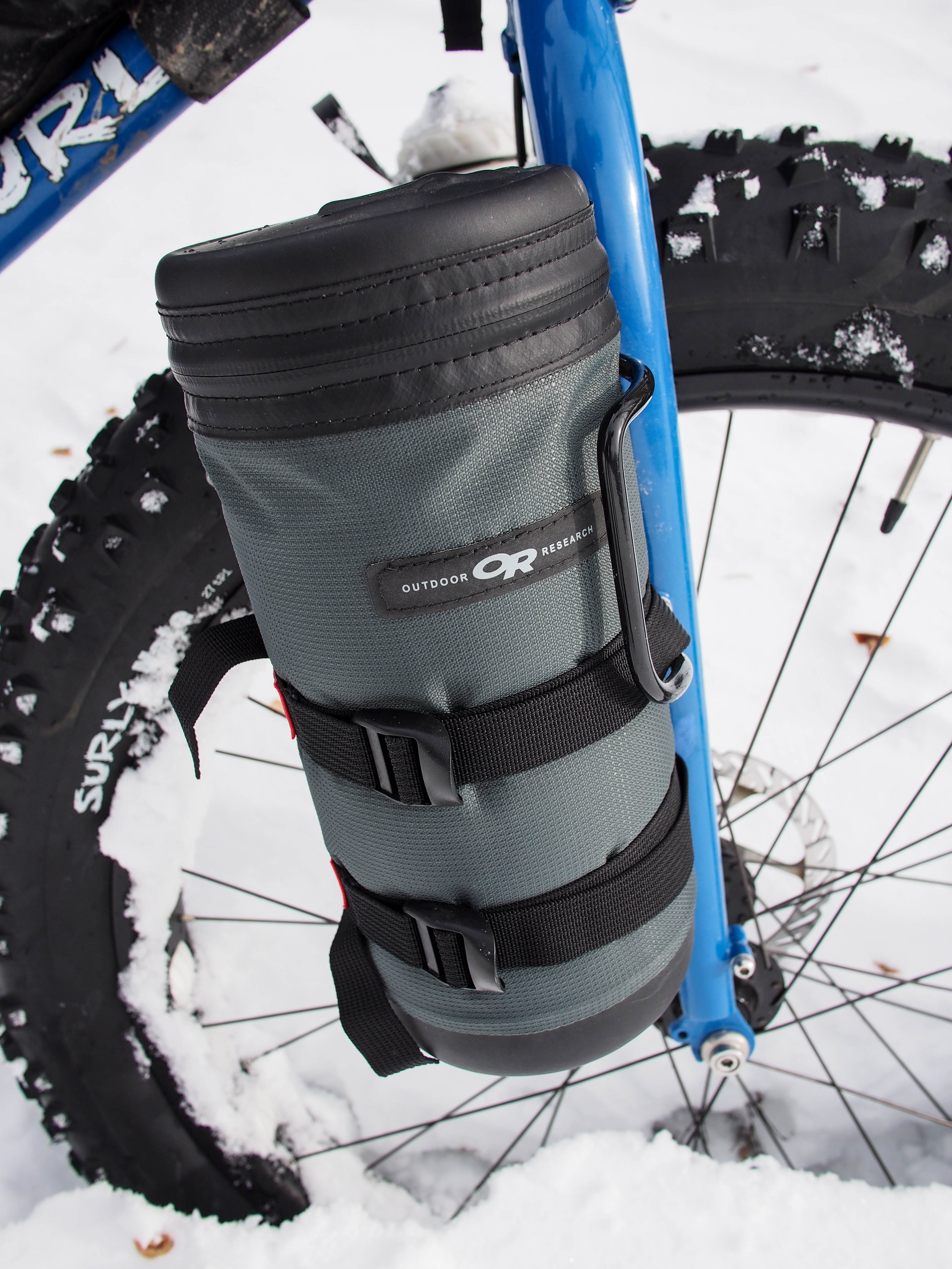 I take two bottles with me on most rides. On the right fork I have a 1 liter Nalgene bottle in an Outdoor Research water bottle parka strapped to a Salsa Anything Cage. On the left side I carry a 20 oz. insulated bike bottle in a regular bottle cage. Sometimes the bike bottle will freeze up but I have never had a problem with the Nalgene freezing.