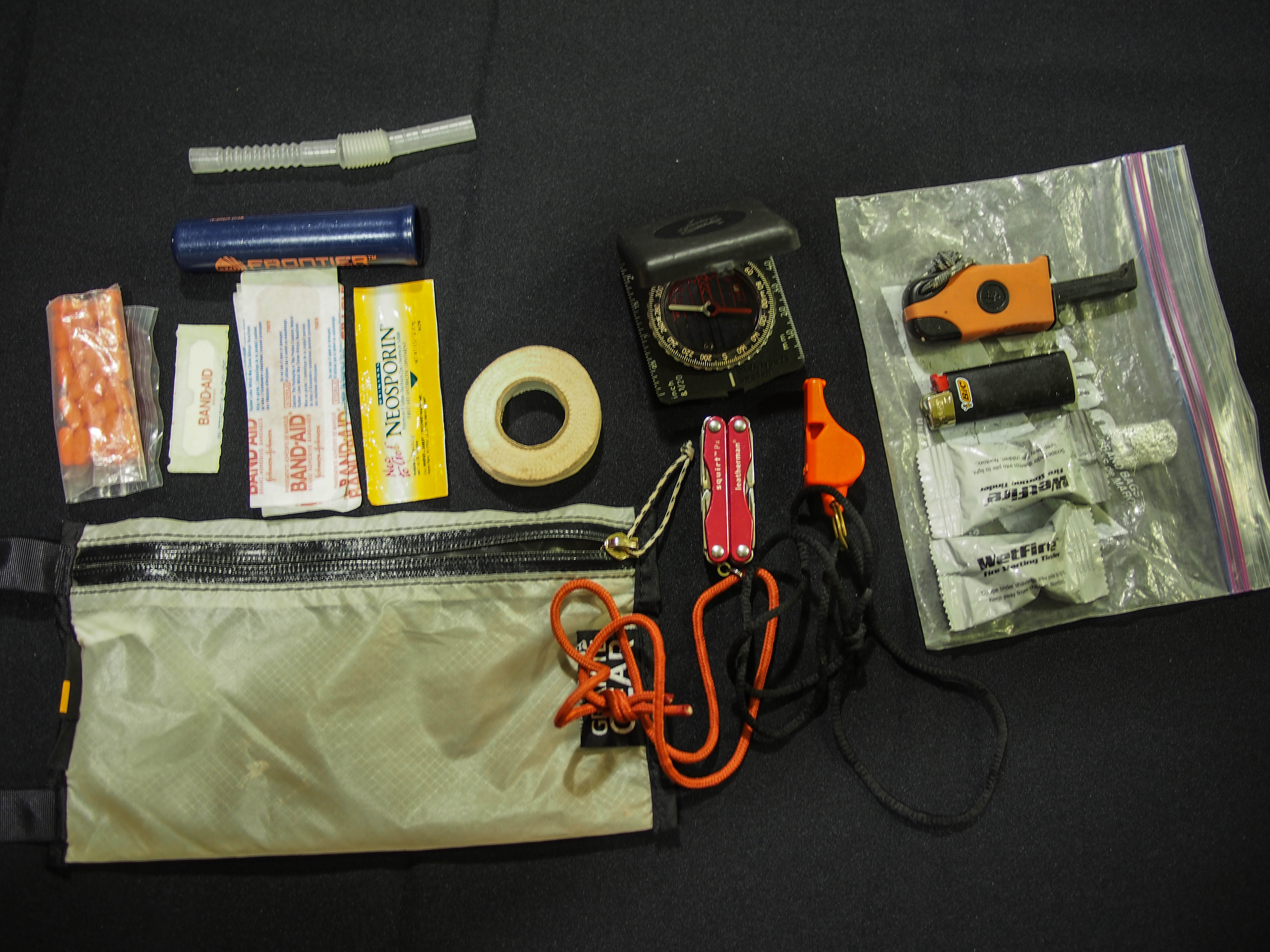 • firestarting kit (sparker, mini lighter, Wetfire, in a ziplock bag)