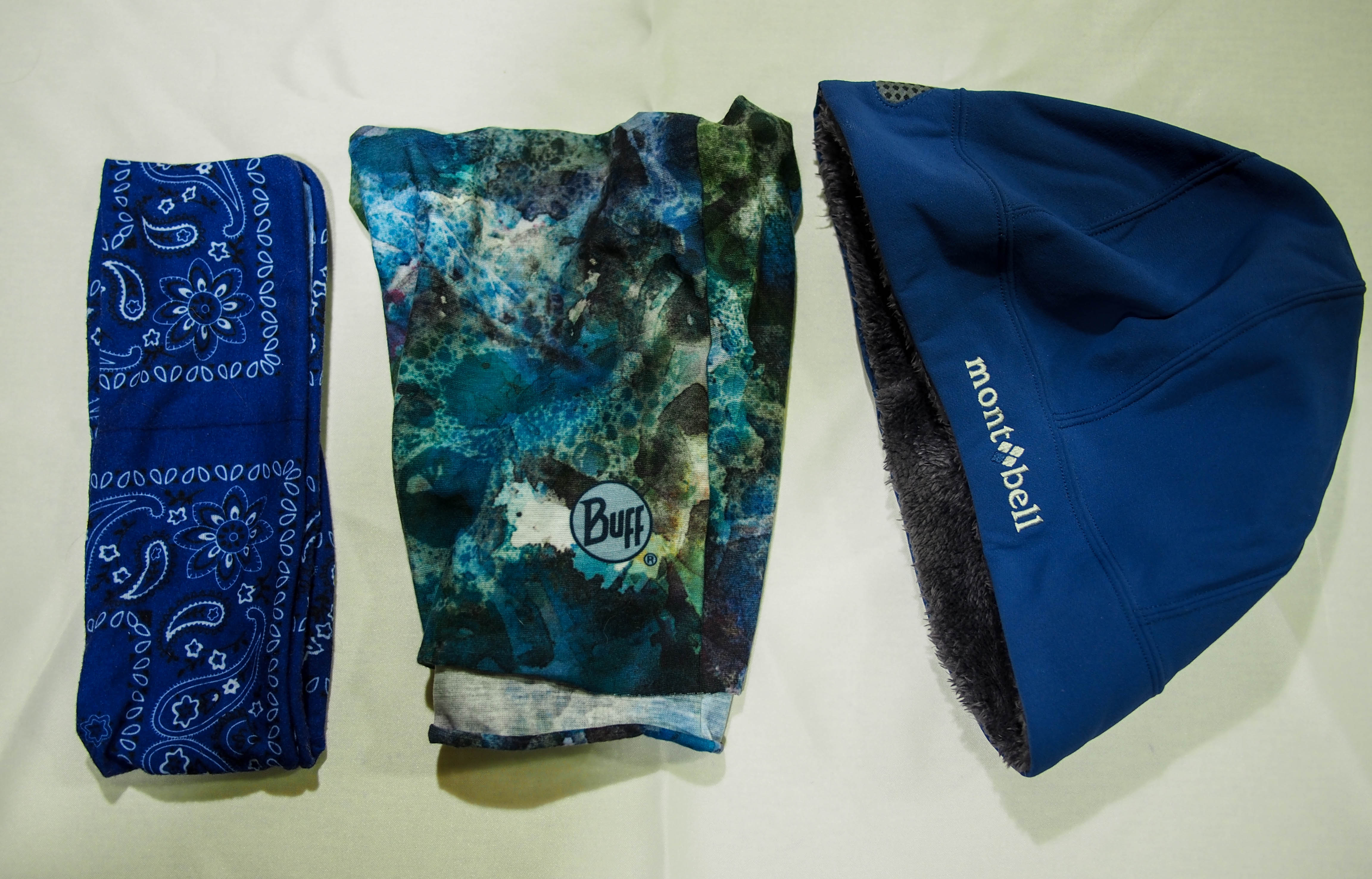 For my head I usually wear a Buff doubled, or if it is less cold, a Buff cut in half to wear as an earband. If it is colder I have a Montbell softshell beanie with fleece around the bottom. And if it is really cold I will wear an Outdoor Research balaclava, either the Ninjiclava or the windproof Sonic for really cold and windy weather. Sometimes I will wear two or three different pieces of head gear on a single ride. Sometimes the Buff will get saturated with sweat, or I will swap into a warmer hat for a long downhill section. I really like Buffs as they are very versatile. They can be used as an earband, hat, face mask, neck gaiter, etc.