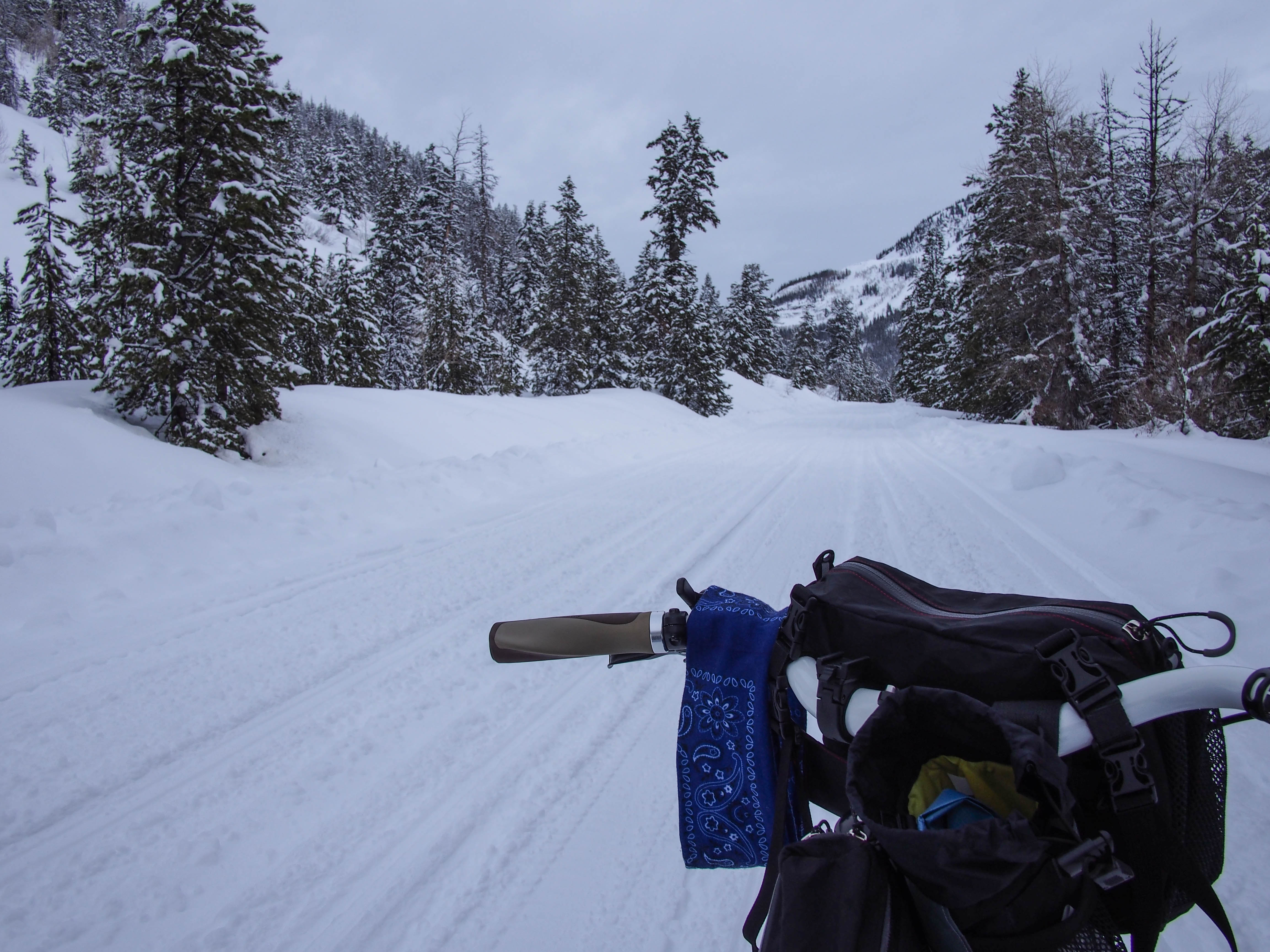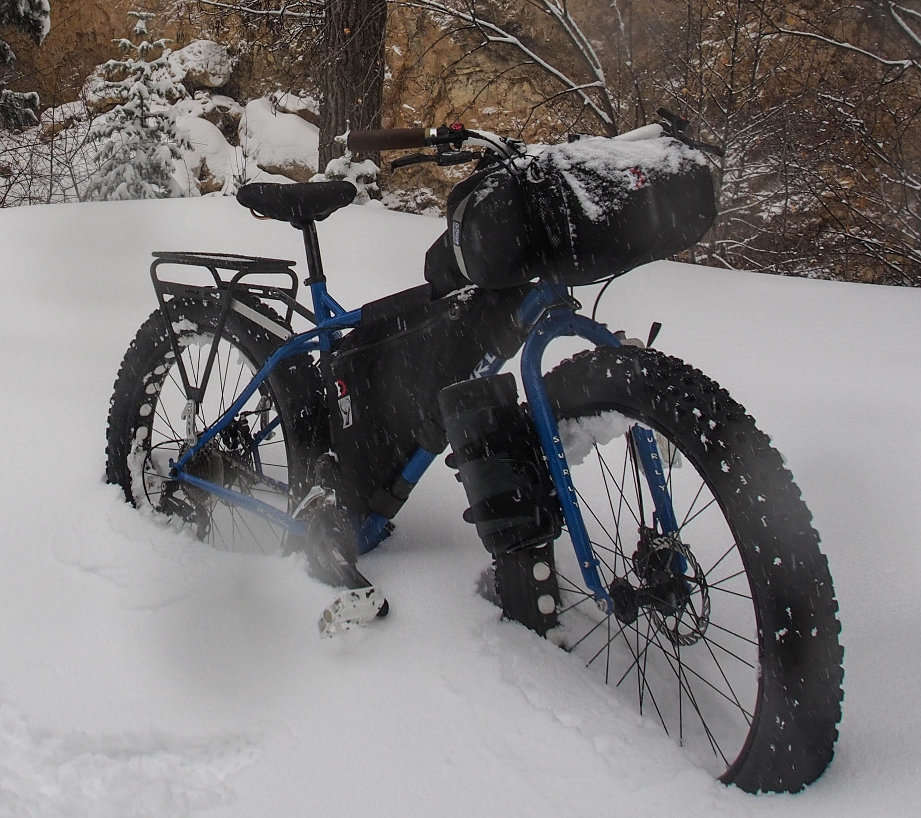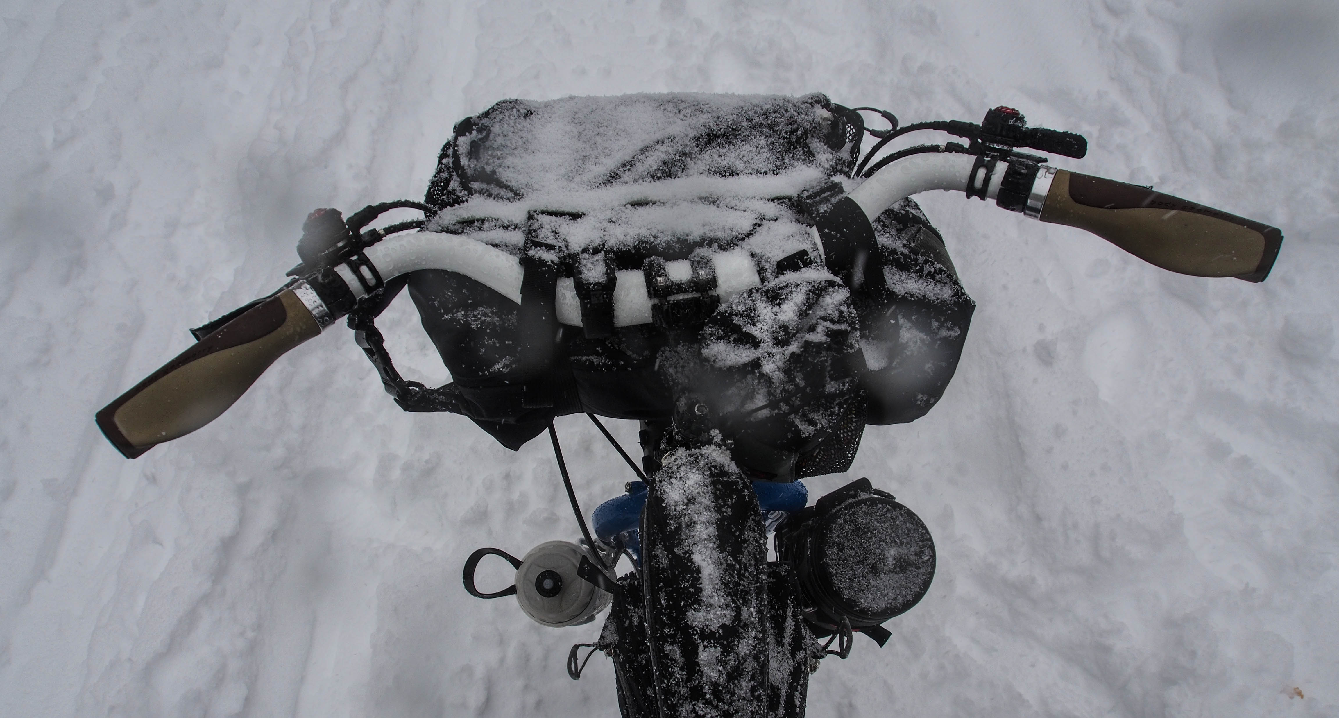 Shortly after getting my fatbike (Surly Pugsley) I began to think about bikepacking. I have been backpacking since I was 11 years old and combining that with bikes is quite appealing to me. I looked around at all the options for carrying things on your handlebars and began experimenting. I first simply strapped a 12 liter dry bag to my handlebars. It seemed to work just fine. But I also like the idea of having a pocket up front. I have been touring on the road for a few years and I really like the quick and convenient access of a handlebar bag. I considered the Revelate Designs Harness or Sweetroll, but they seemed a bit expensive, and with my Mary On One curved bars I was not confident that the Harness would even work. I think I read somewhere that the Revelate Designs front pocket could be used independently as a handlebar bag, or in conjunction with a standard dry bag, so I decided to give it a try. I found it on sale for about $38.