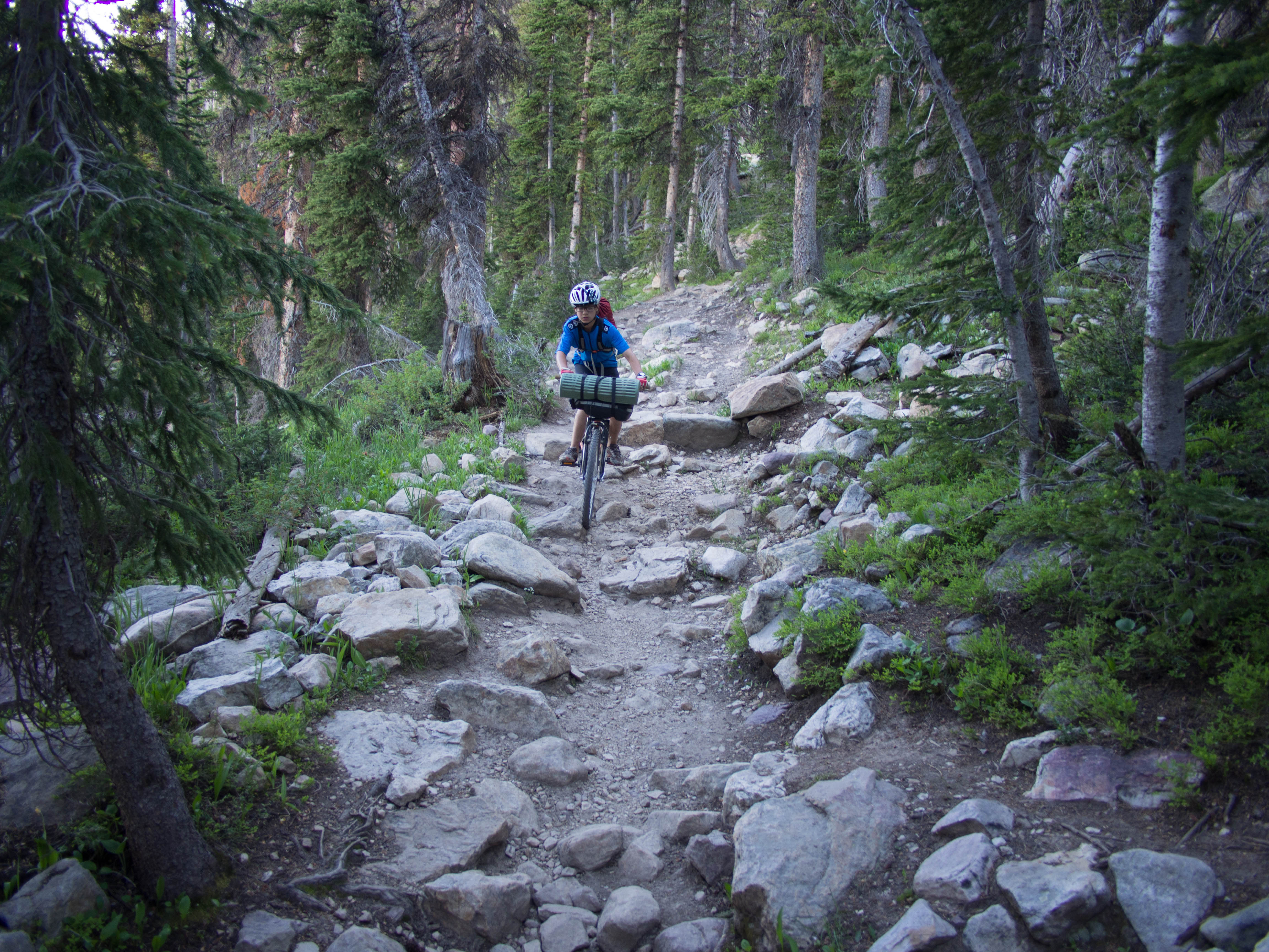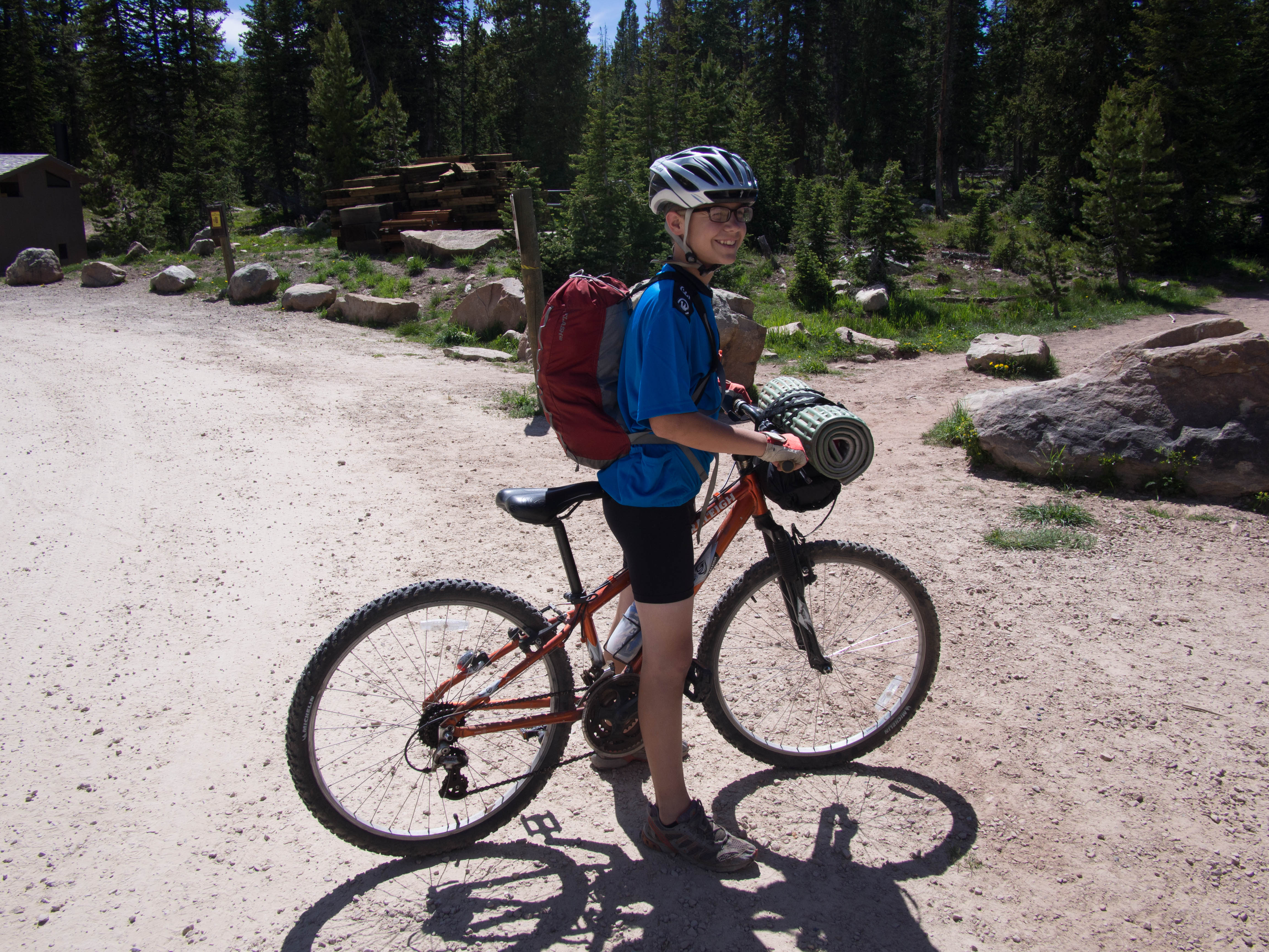My 13 year old has a pretty small hard tail mountain bike. It does not have rack mounts on the upper rear triangle, and I haven’t yet bought a seat tube mount for racks yet, so we just strapped his sleeping bag (in a 10 liter dry sack) and a Ridgerest pad to his handlebars and he wore a lightweight daypack (REI Flash 18) with his clothes and other things.