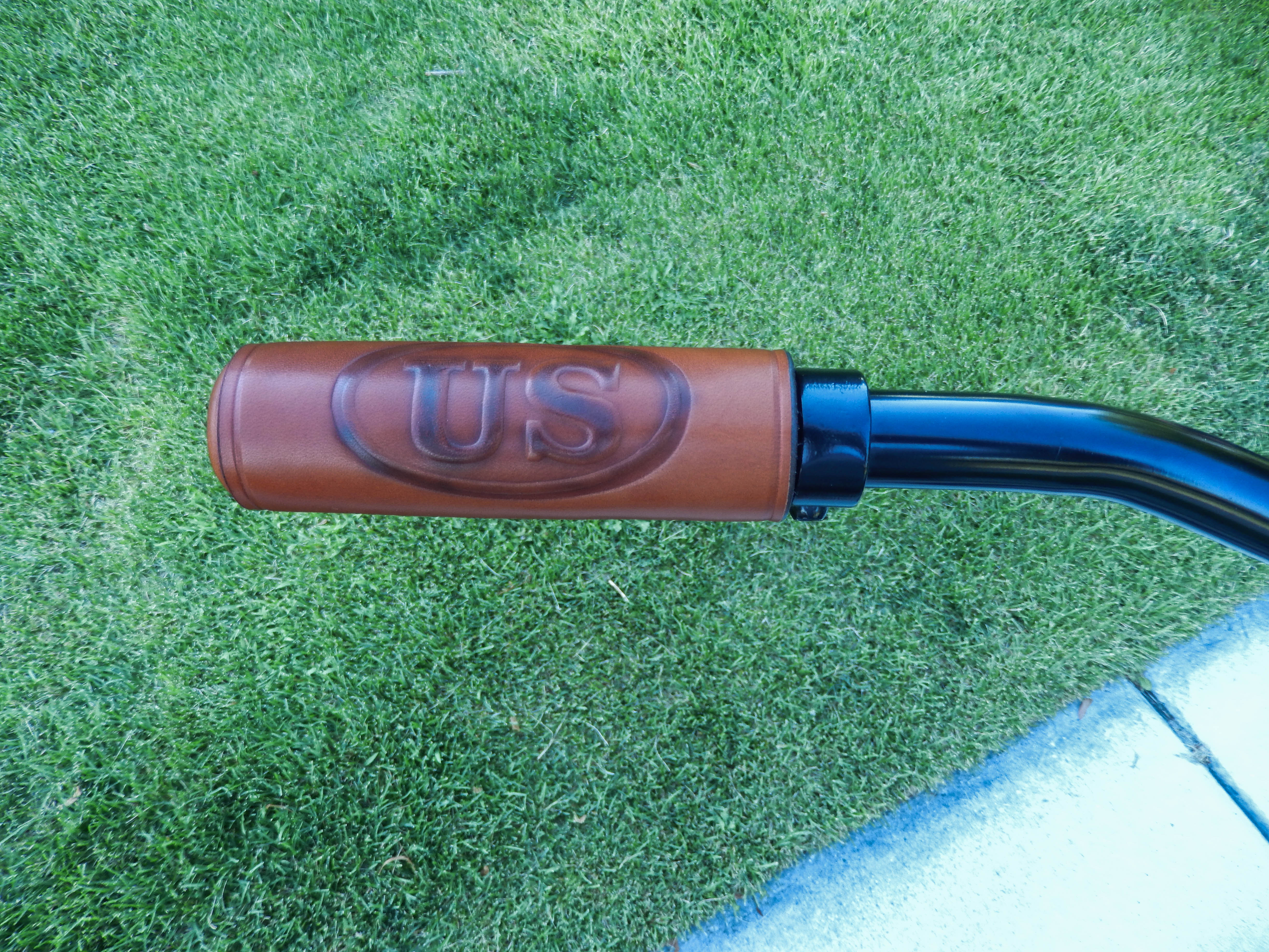 The canvas was, as you would expect, pretty floppy. So I took some .09” ABS plastic I had and riveted in stiffeners to the backside of each bag that sets against the rack. The yoke was too wide for my little rack so I took the bags and the bike to a friend who has a leather shop in a nearby town. I work with Travis at Western Trade in Springville on a very regular basis with my own business so it is not unusual for us to bring each other little projects we need help with from time to time. Travis cut the middle out of the yoke, stitched it back together and mounted the bags on the bike. While the bike was there I had him custom fit leather grips on it. He had the great idea of stamping the leather with the old U.S. Cavalry insignia. He also used the piece of canvas he cutout of the saddlebag yoke to make a seat bag with the same insignia. It is a very nice touch that ties it all together nicely.