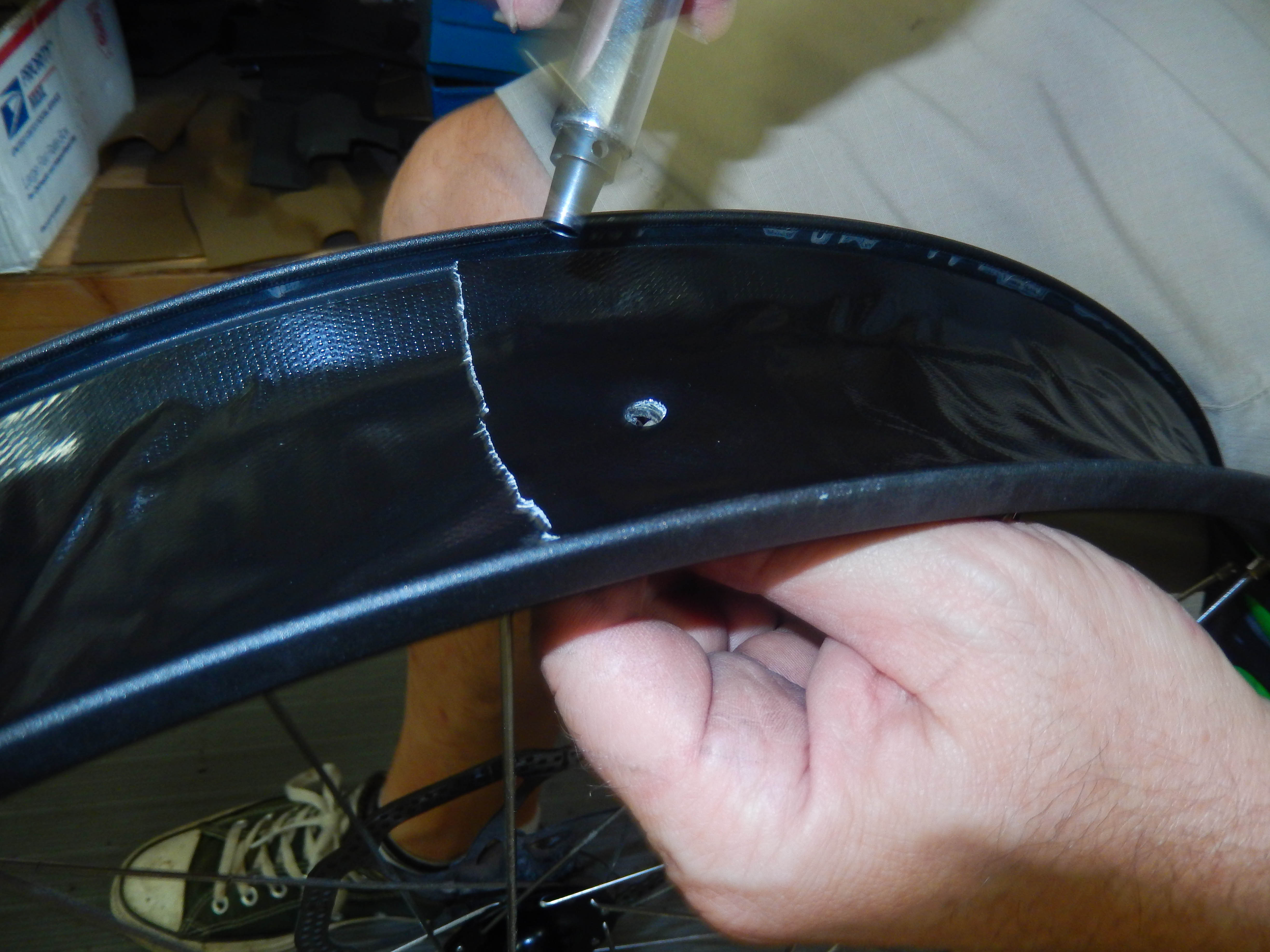 Step 2 – Line the rim with Gorilla Tape. I used the 2.88” wide black version. It spanned the rim nicely and created a nice seal. I overlapped the tape a couple inches to make sure I didn’t have a weak point where I could get a leak. You will need to make a hole in the tape to fit your valve stem. I used a leather hole punch working from the inside of the rim and cut a perfect hole.