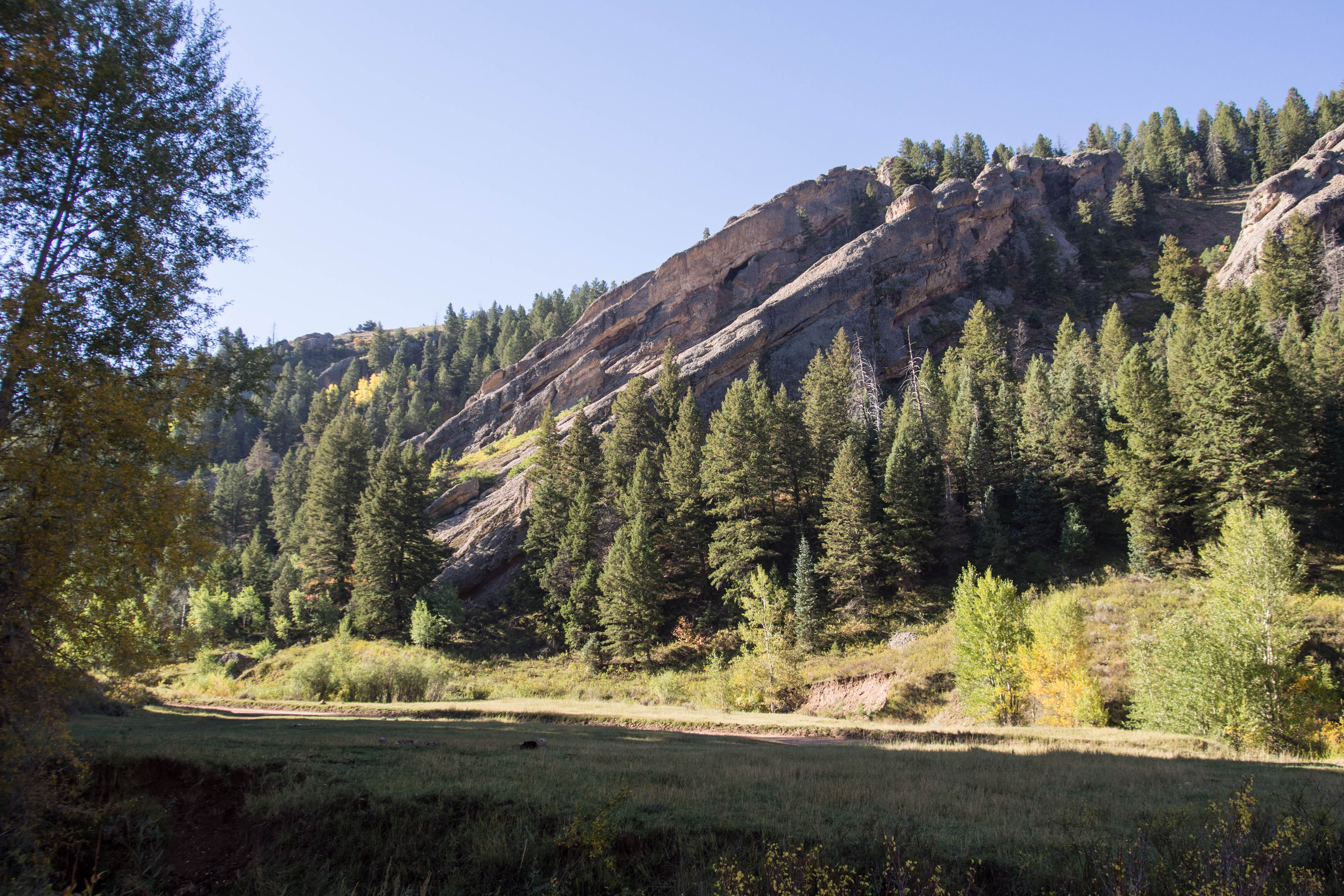 After setting up camp in a nice grassy area, we went for a ride up the forest service road. After a short time it got quite steep, probably 10% or more in places. It was a narrow canyon and the Fall colors were just beginning. After climbing for about 45 minutes we finally topped out in a meadowy area.