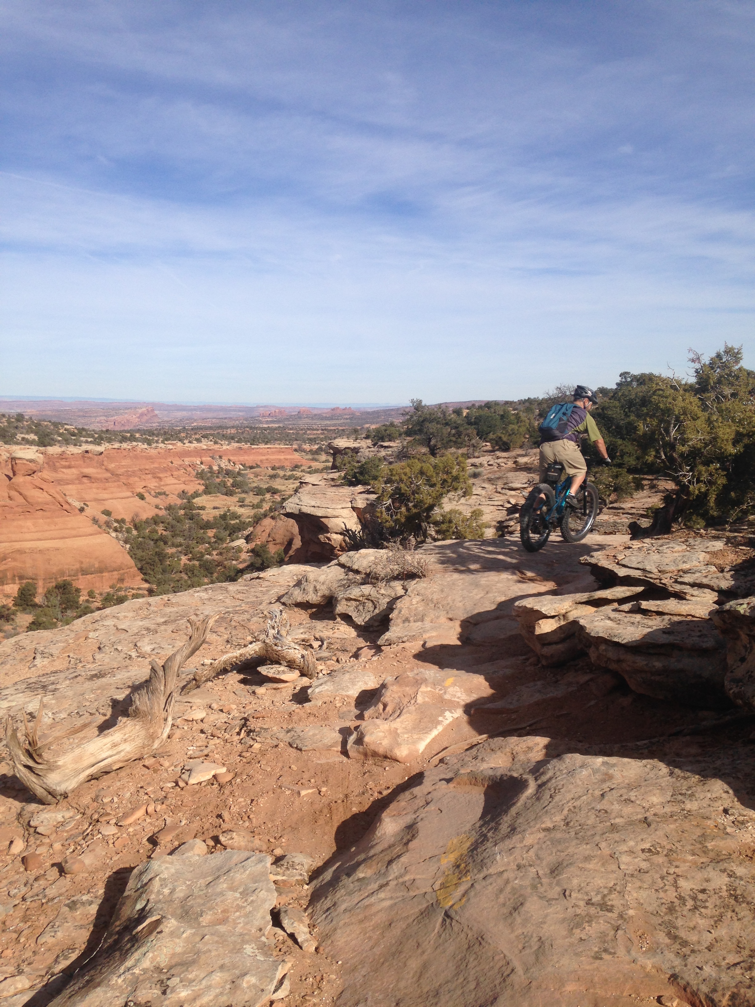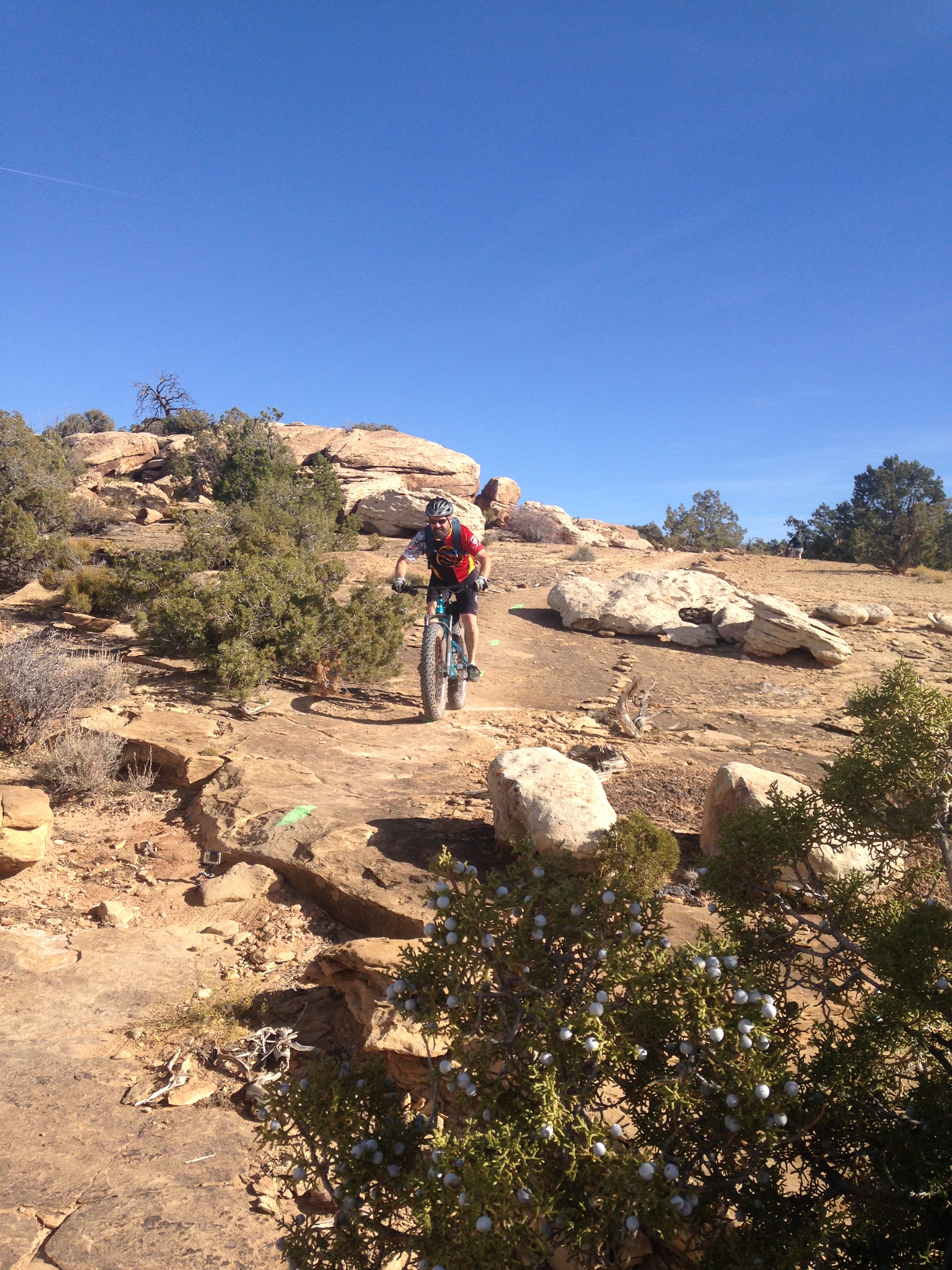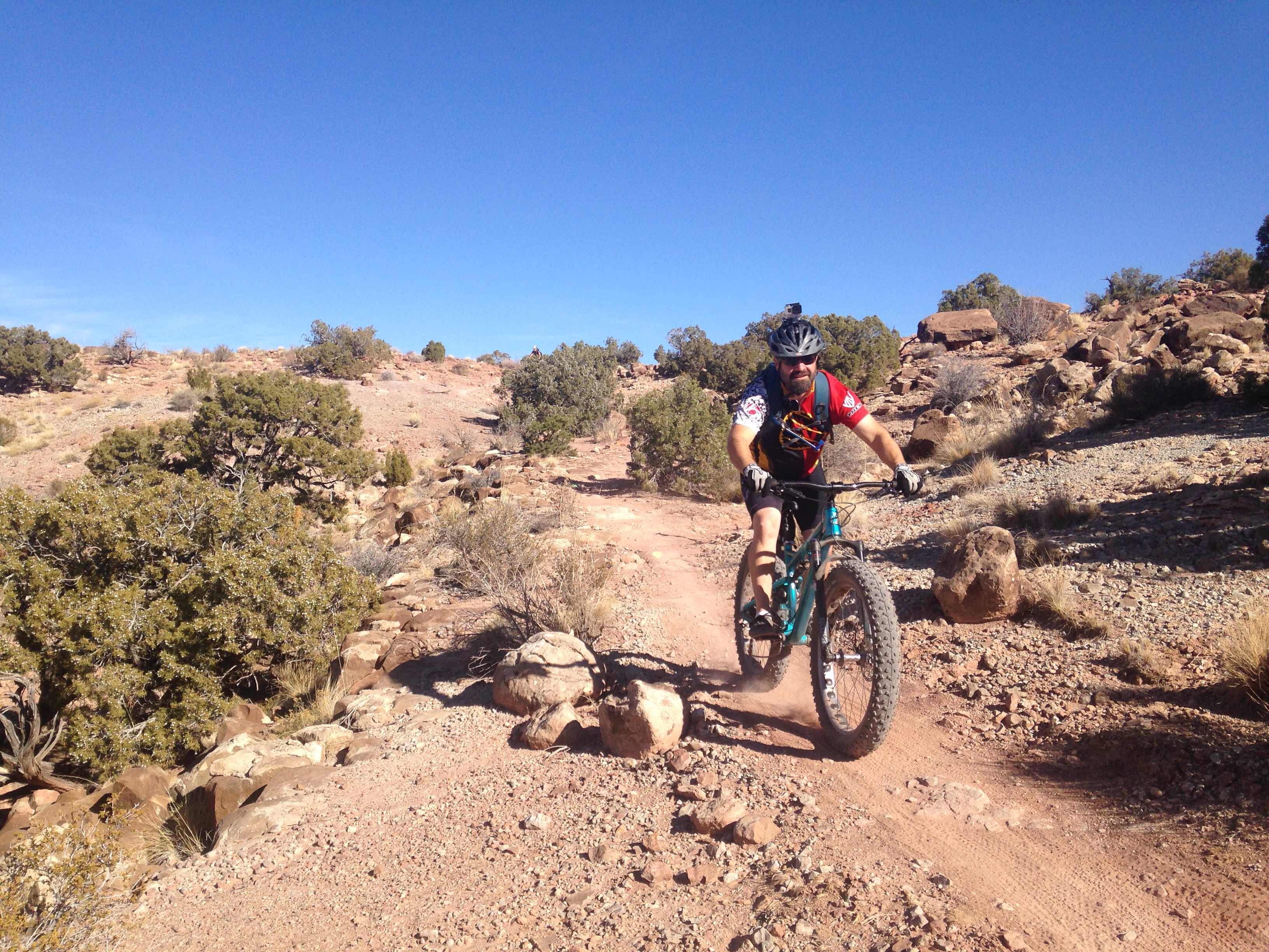 Lets get down to details and talk about the frame. This is what gives the Bucksaw life and separates it from just another fatbike. We weighed a medium Bucksaw 1 at Mad Dog and it came in at 34 lbs on the nose. Impressive when you consider all that suspension and rear linkage. Most of the frame is constructed of AL6066 aluminum. I say most because the seat stays on the Split Pivot rear triangle are carbon fiber. This shaves some weight and perhaps provides some stiffness to the rear end. It is important to note that the Bucksaw was developed from the ground up as a fatbike keeping in mind the dynamics of running a low pressure, high volume tire. Salsa did not simply fatten up one of their existing full suspension mountain bikes and call it good. This is very evident when you ride it. I have put some miles in on standard full suspension mountain bikes and the ride of the Bucksaw is uniquely it’s own. After several of us had ridden it through some rough and rocky terrain in Moab, we were trying to describe the ride. The closes thing we could come up with was it is like riding your couch. Sounds weird. I know. But the ride is so plush and comfortable that was the best we could come up with. The 100mm of travel in the front and rear Rock Shox combined with the shock absorption you get from the tires lets you steamroll some pretty rough trail without getting thrown off your game. Trail conditions in Moab can be extreme to say the least. The Bucksaw tamed the worst of it and was pure pleasure to ride.