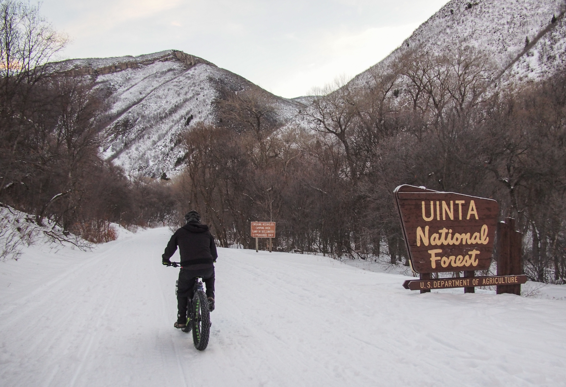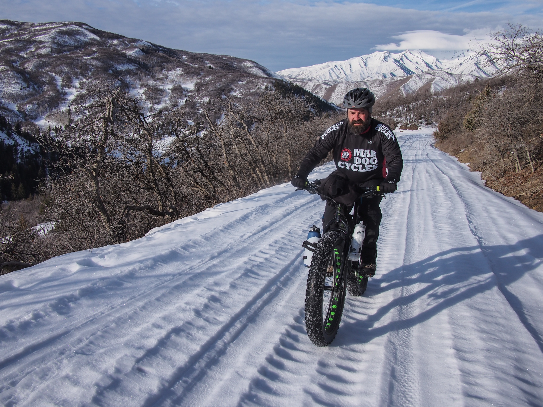 The course follows the Right Fork road to the top of the pass and back. We clocked it this morning at 21 miles. The conditions are hard and fast right now, well packed out. The first 6.7 miles to the Wardsworth Creek turnoff are a gradual climb only gaining 900′. (Turn around here if you like). From there the road pitches up to 6%, then all the way up to 12% at times. But it is all very rideable, as long as the snow is firm. The descent is fast and furious, and very enjoyable. It only took us about 14 minutes from the pass back down to Wardsworth. This route gets a fair amount of regular traffic so it is usually packed out nicely even after snowfall. This will be a much easier and faster ride than Soapstone Basin. The scenery is nice as most of the route is in National Forest. The hardcore riders can also descend off the back side into Diamond Fork, then back up if you like.