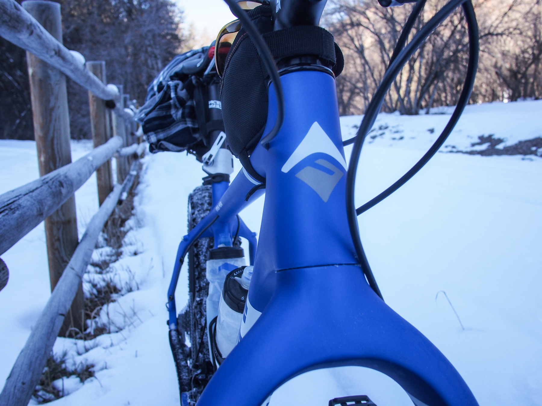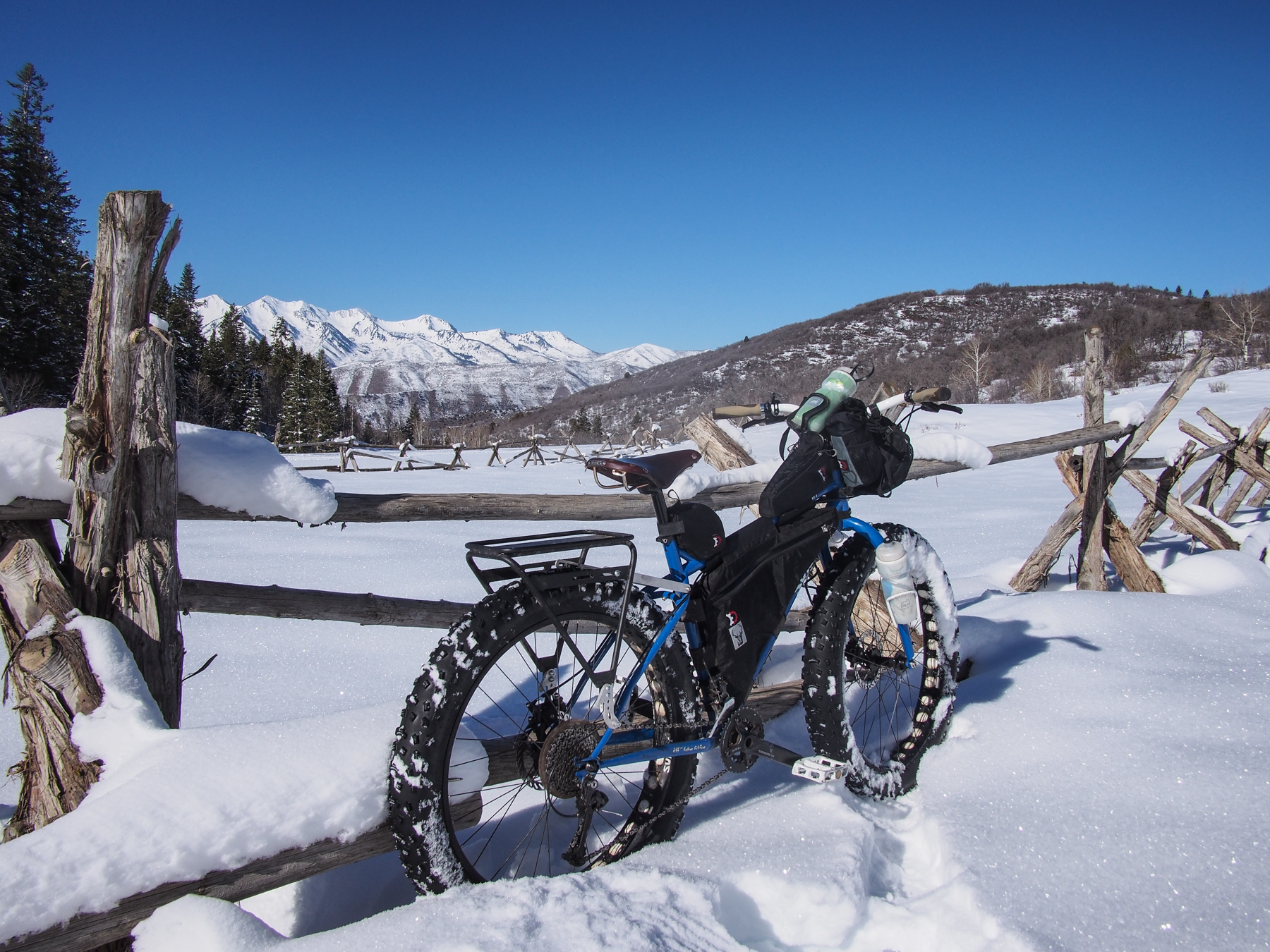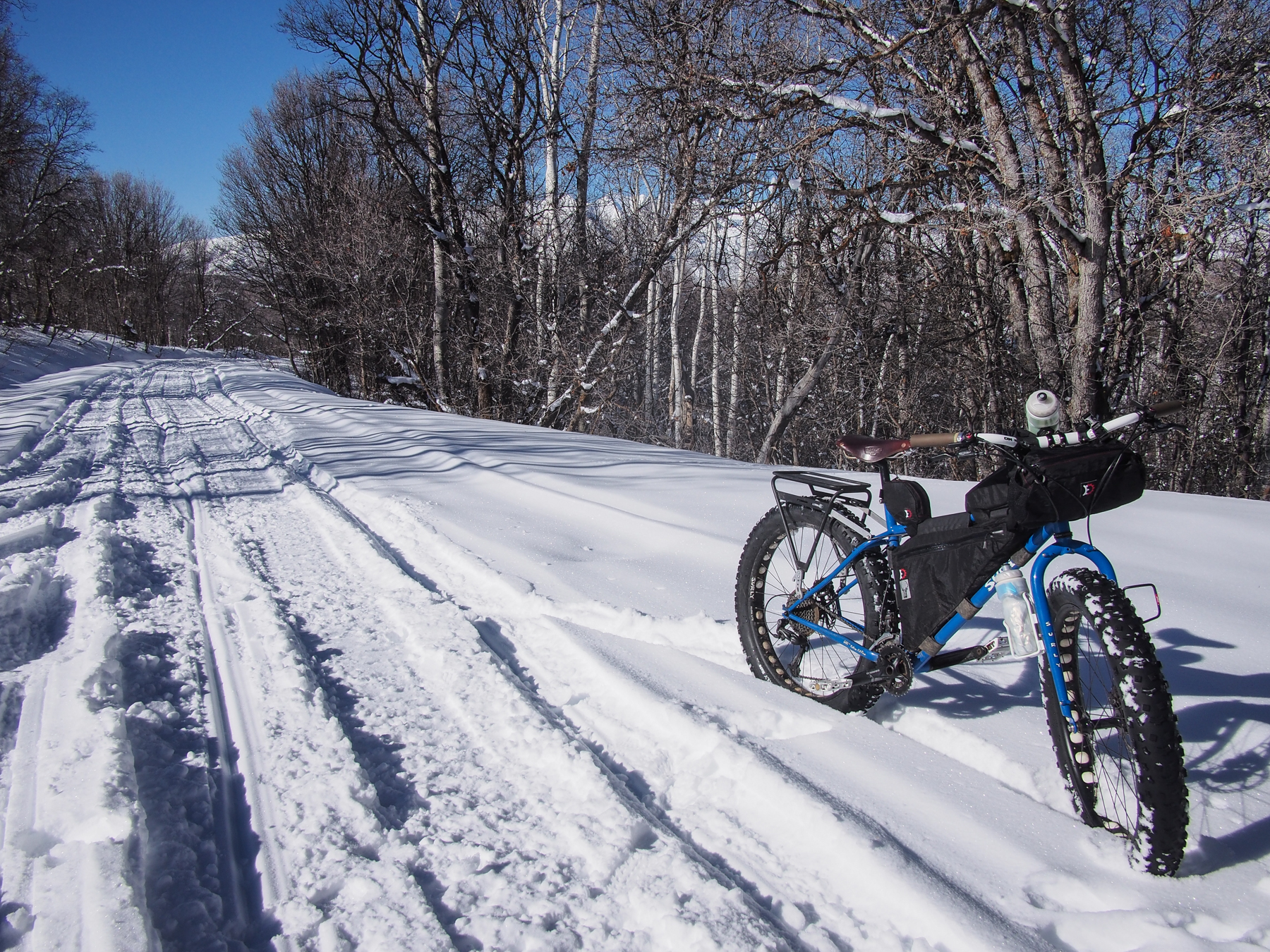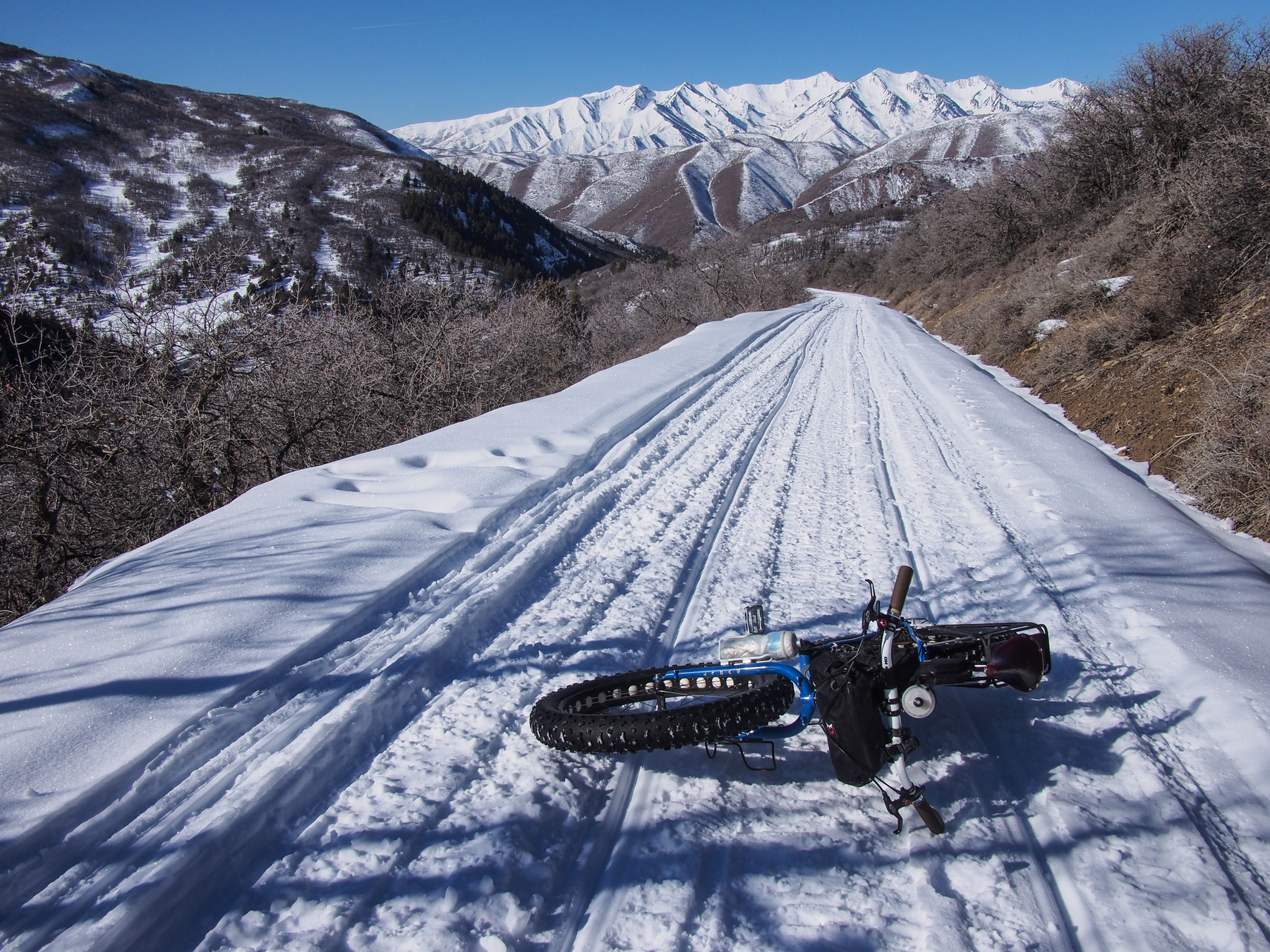 It was a nice day for riding yesterday. We met at the parking lot at Jolly’s Ranch up Hobble Creek Canyon. It was a light turn out, to put mildly. Only four showed up at 8:00 am when we planned the ride. Two other riders arrived quite late and were riding up when we were coming down. The road was in good condition and made for nice riding. Part way up to Wardsworth Daryn’s pedal fell off, stripped, so he had to head back to the truck for a wrench. Doc met Jess and I near Wardsworth and told us he was going to turn around and check on Daryn. So Jess and I headed up, and up, and up. Once you get past Wardsworth the canyon opens up quite a bit and gets more exposed. Down in the narrow canyon it was shady, cold, and firm, but up higher it was in full sun and getting soft. There was some hiking as the snow got softer and the grades got steeper. I topped out alone after about 3.5 hours (and a bit over 10 miles). I met Jess on my way down and we continued down together. He was riding a beautiful new Fezzari King’s Peak fatbike. It had an incredible flat blue paint job and was tricked out with Shimano XT components. He was really liking the ride (only his second time on the bike). Back at Soapstone Basin he was riding a loaner demo fatbike from Fezzari while he was waiting for this bike. The descent was fast and fun. I crashed once when I got too close to the edge of the road, hit soft snow and tumbled going pretty fast, but no harm done. It took me only 21 minutes to go from the summit back down to the Wardsworth trailhead, and that included one stop to chat with Jess, and the crash.
