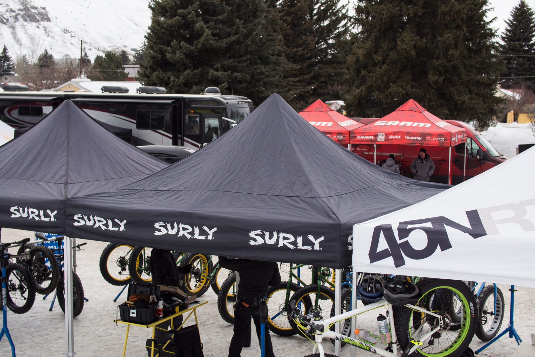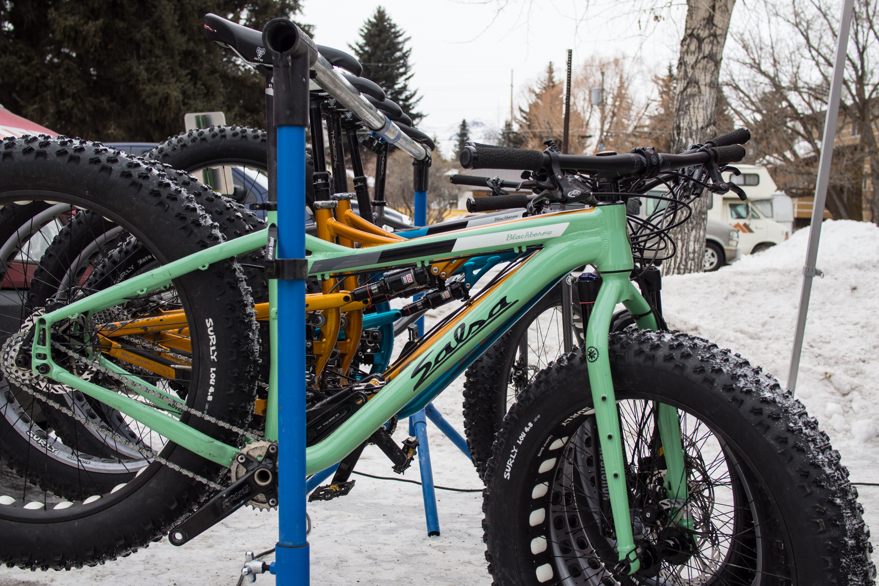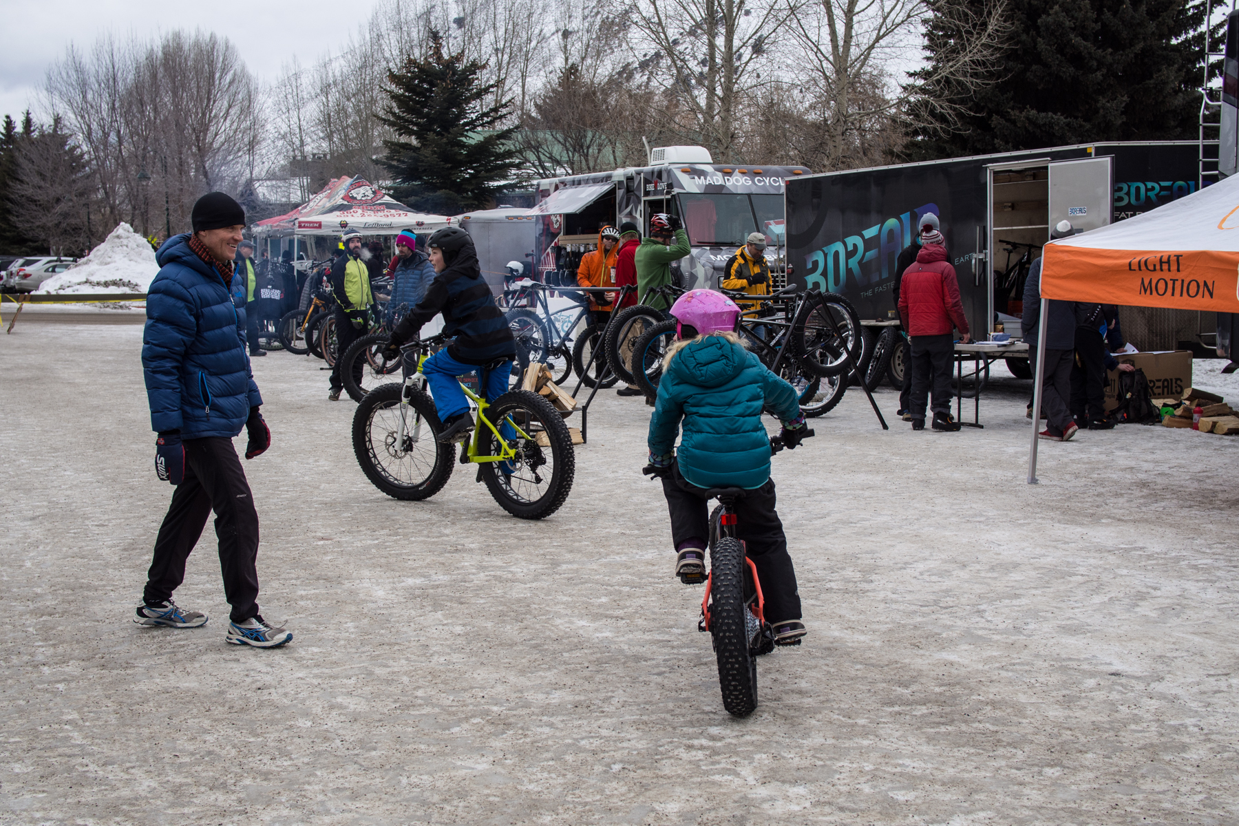 There were more dealers this year than last. We spent Saturday morning wandering around the expo area and riding demo bikes. We saw booths from QBP with a Surly tent and a Salsa tent, and a 45Nrth tent, Trek, Specialized, Rocky Mountain, Felt, Sram, Borealis, Mad Dog Cycles, Fitzgerald’s (a Driggs, ID bike shop), Hoback Sports (a Jackson bike shop; they had a whole fleet of Fatback bikes), and few other organizations. It was a nice turnout. There was a short track adjacent to the expo area where you could demo the bikes. It had as a steep climb, a nice downhill, and some sharp corners, one with a nice built-up berm.
