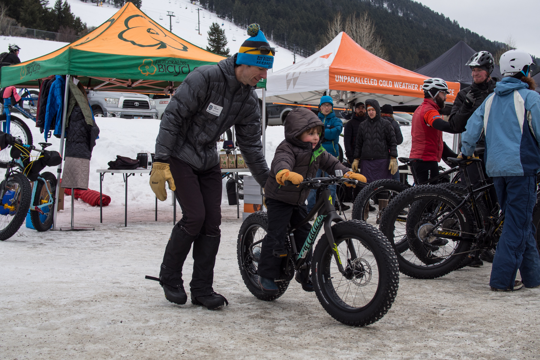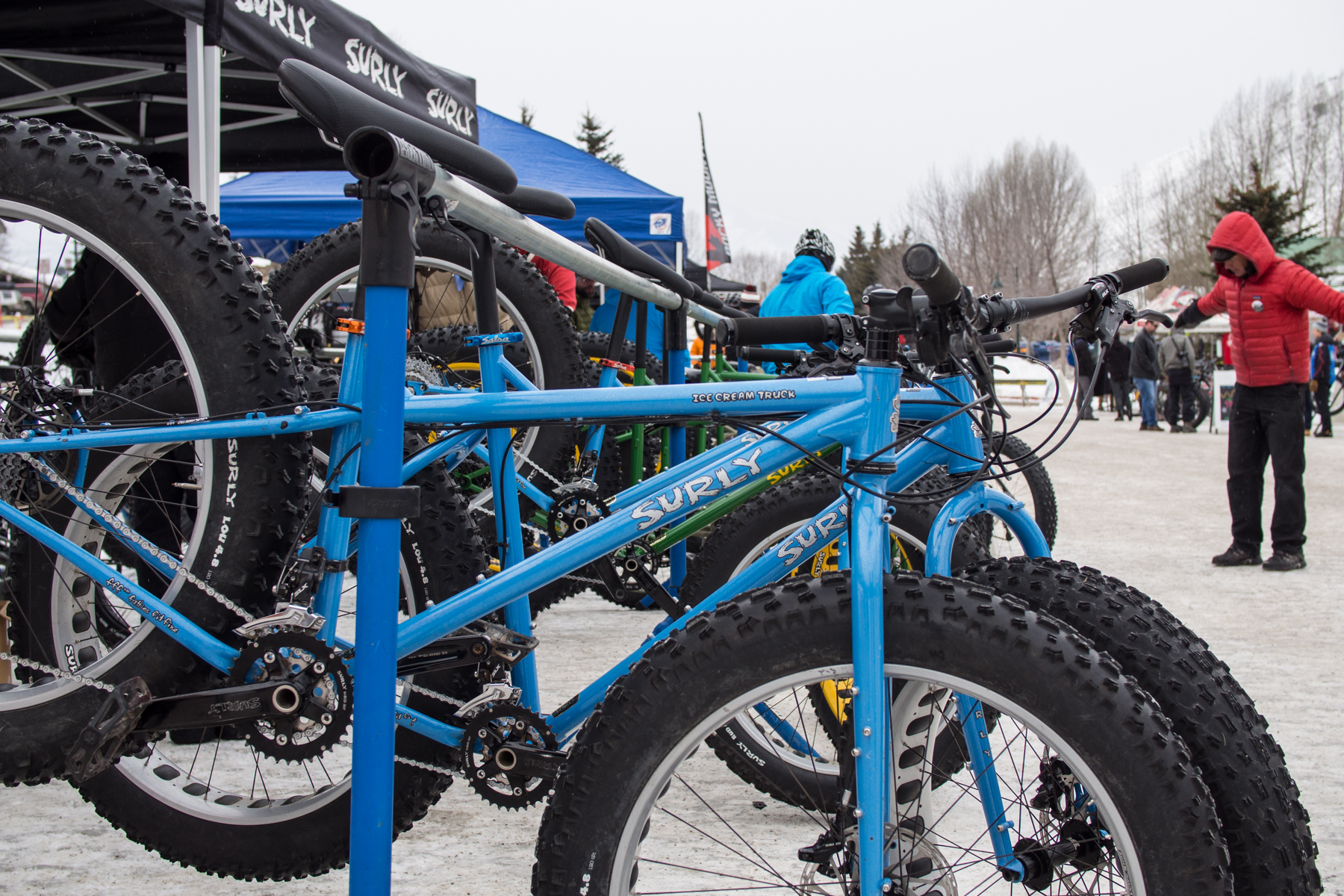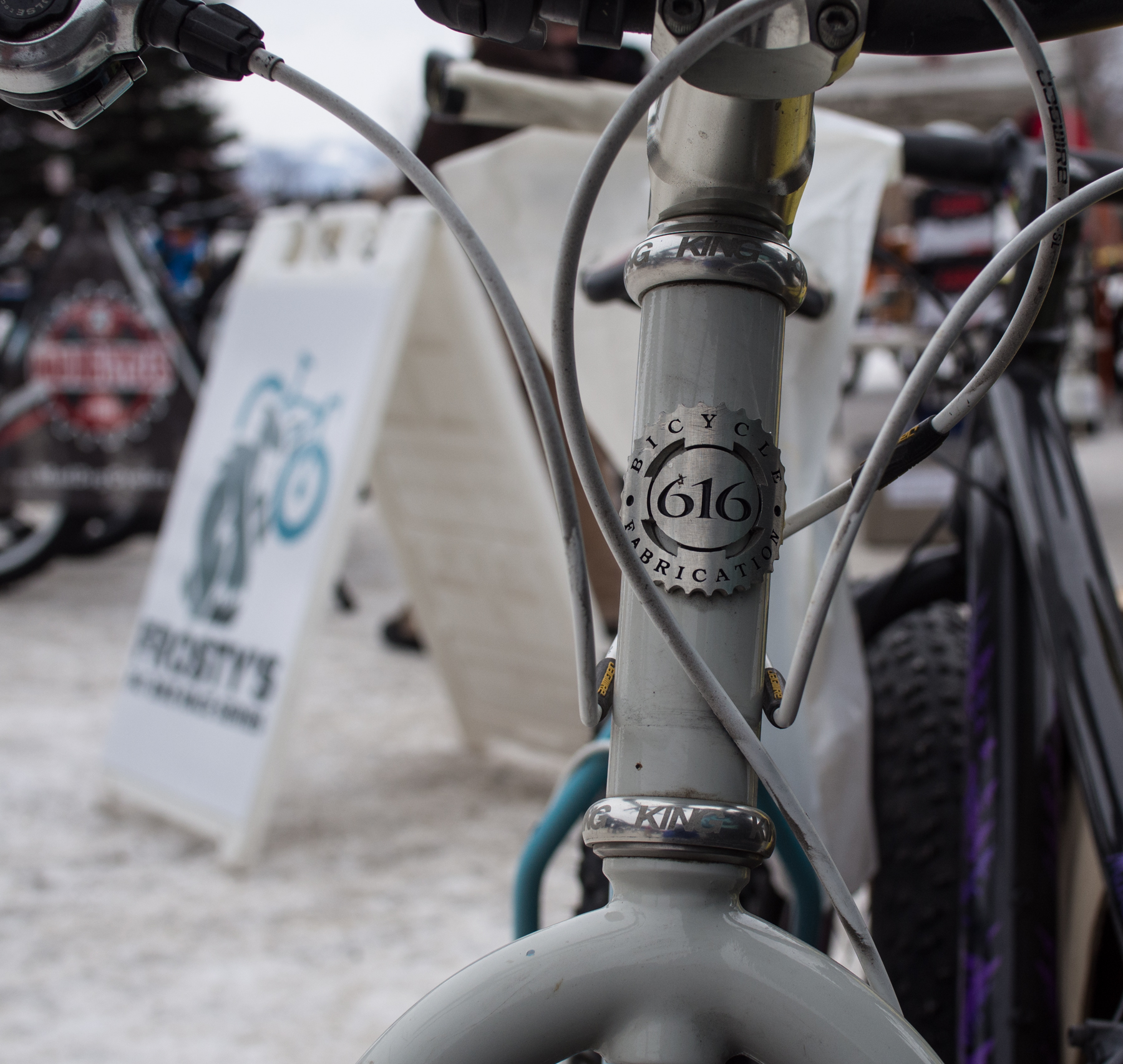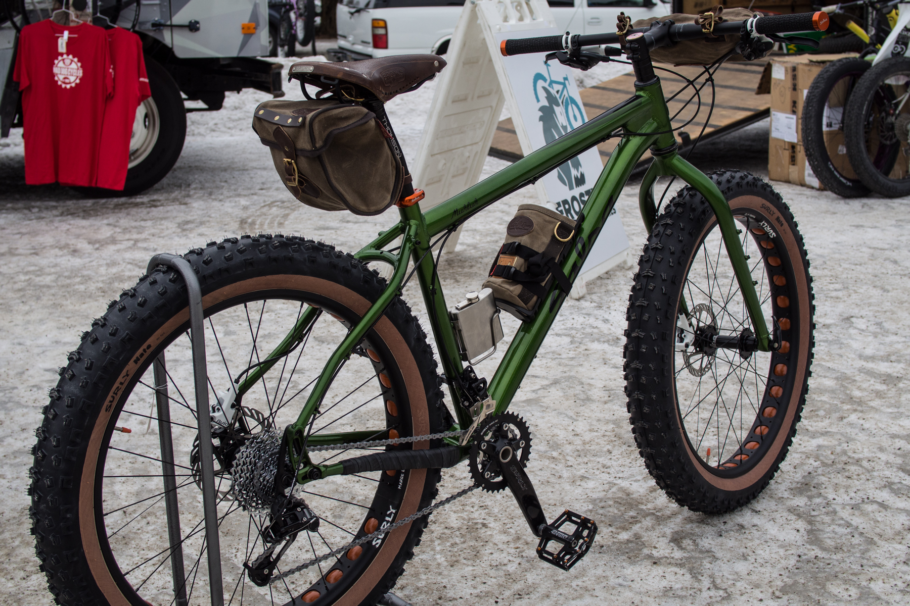 There were more dealers this year than last. We spent Saturday morning wandering around the expo area and riding demo bikes. We saw booths from QBP with a Surly tent and a Salsa tent, and a 45Nrth tent, Trek, Specialized, Rocky Mountain, Felt, Sram, Borealis, Mad Dog Cycles, Fitzgerald’s (a Driggs, ID bike shop), Hoback Sports (a Jackson bike shop; they had a whole fleet of Fatback bikes), and few other organizations. It was a nice turnout. There was a short track adjacent to the expo area where you could demo the bikes. It had as a steep climb, a nice downhill, and some sharp corners, one with a nice built-up berm.