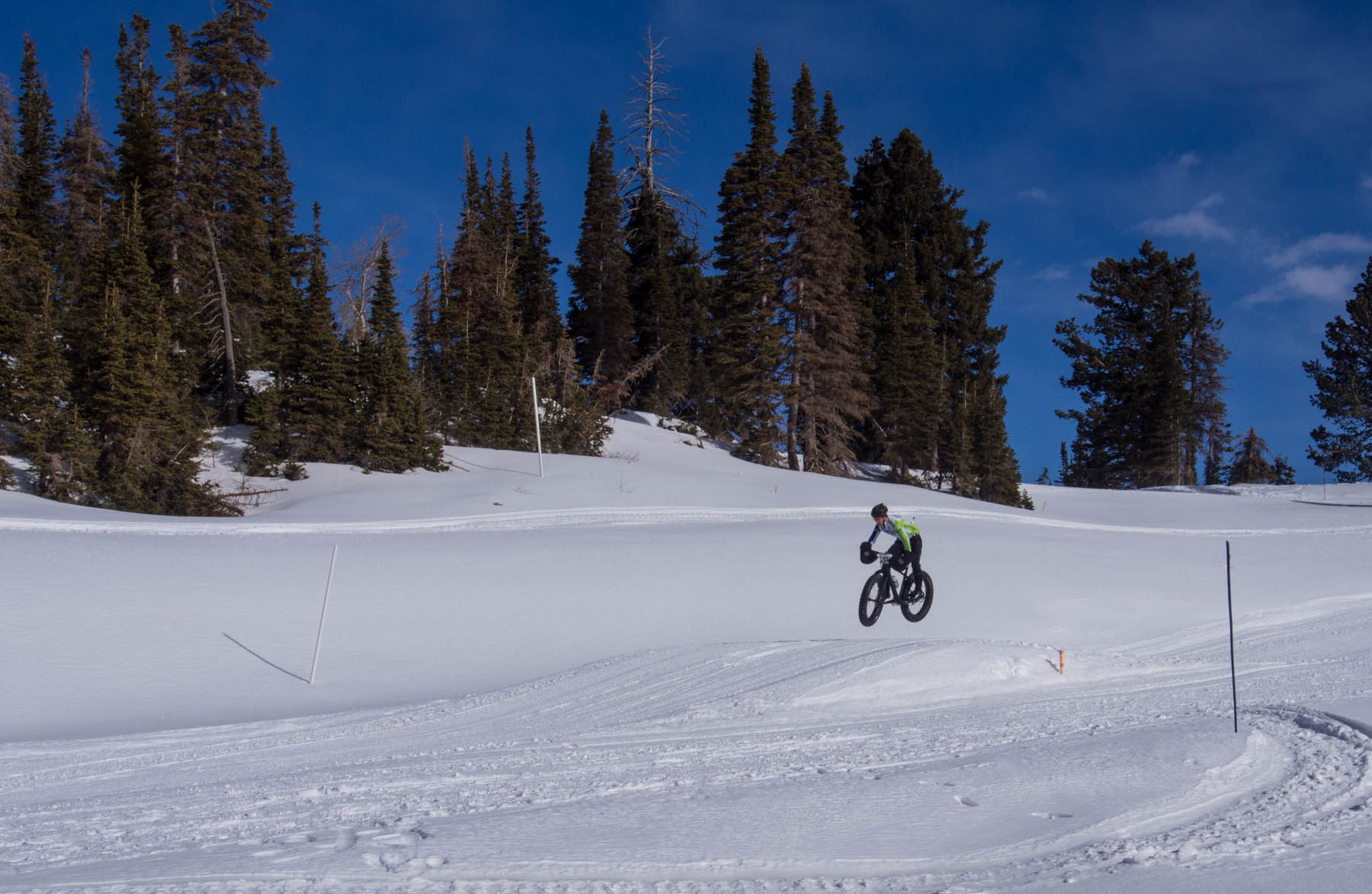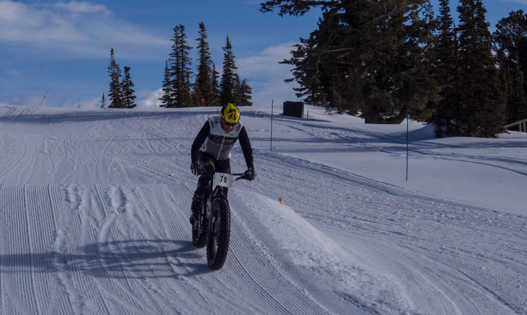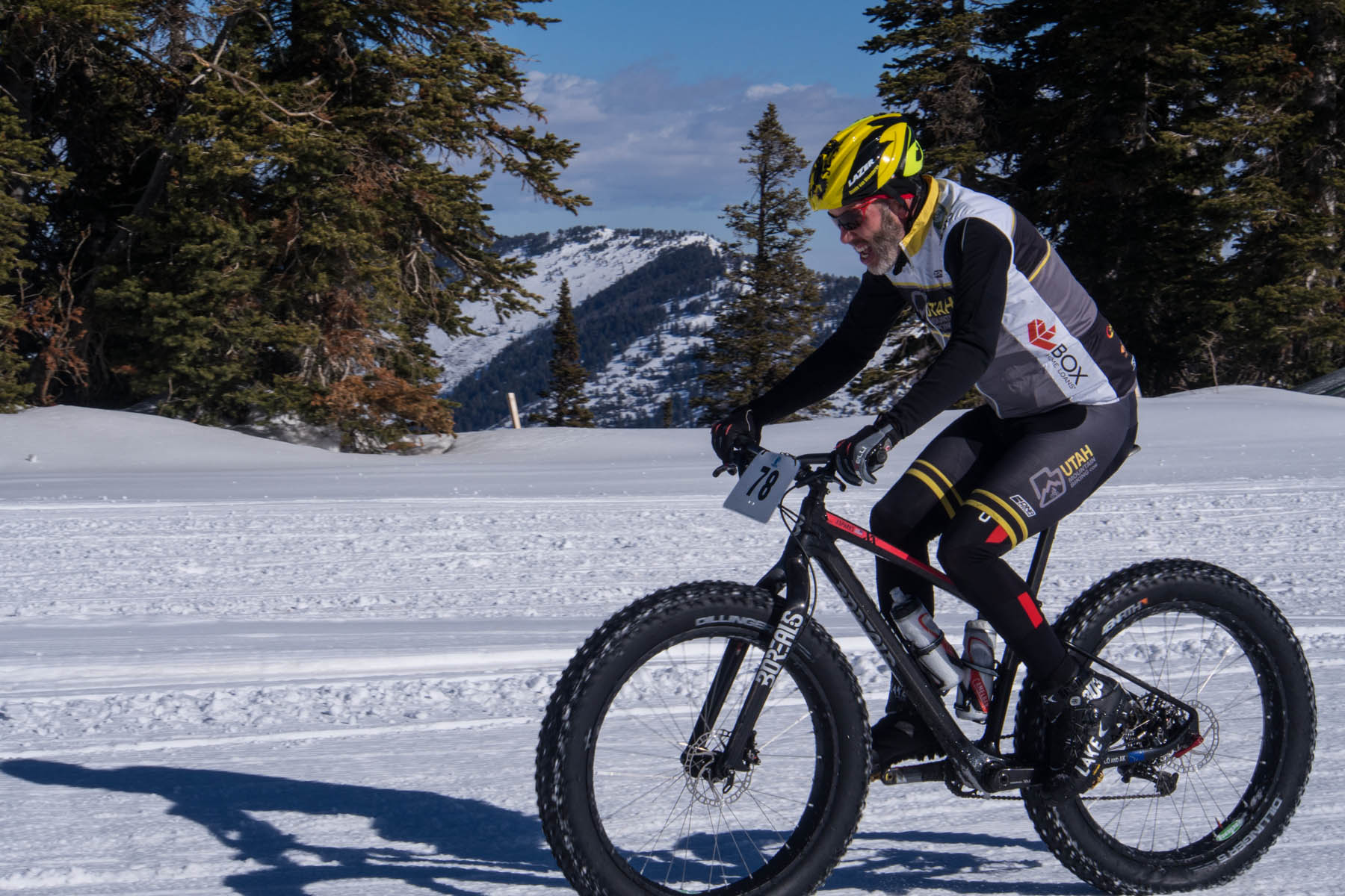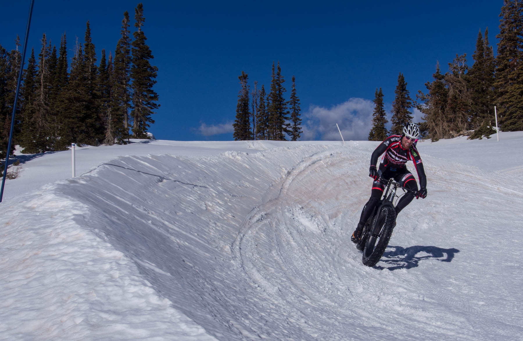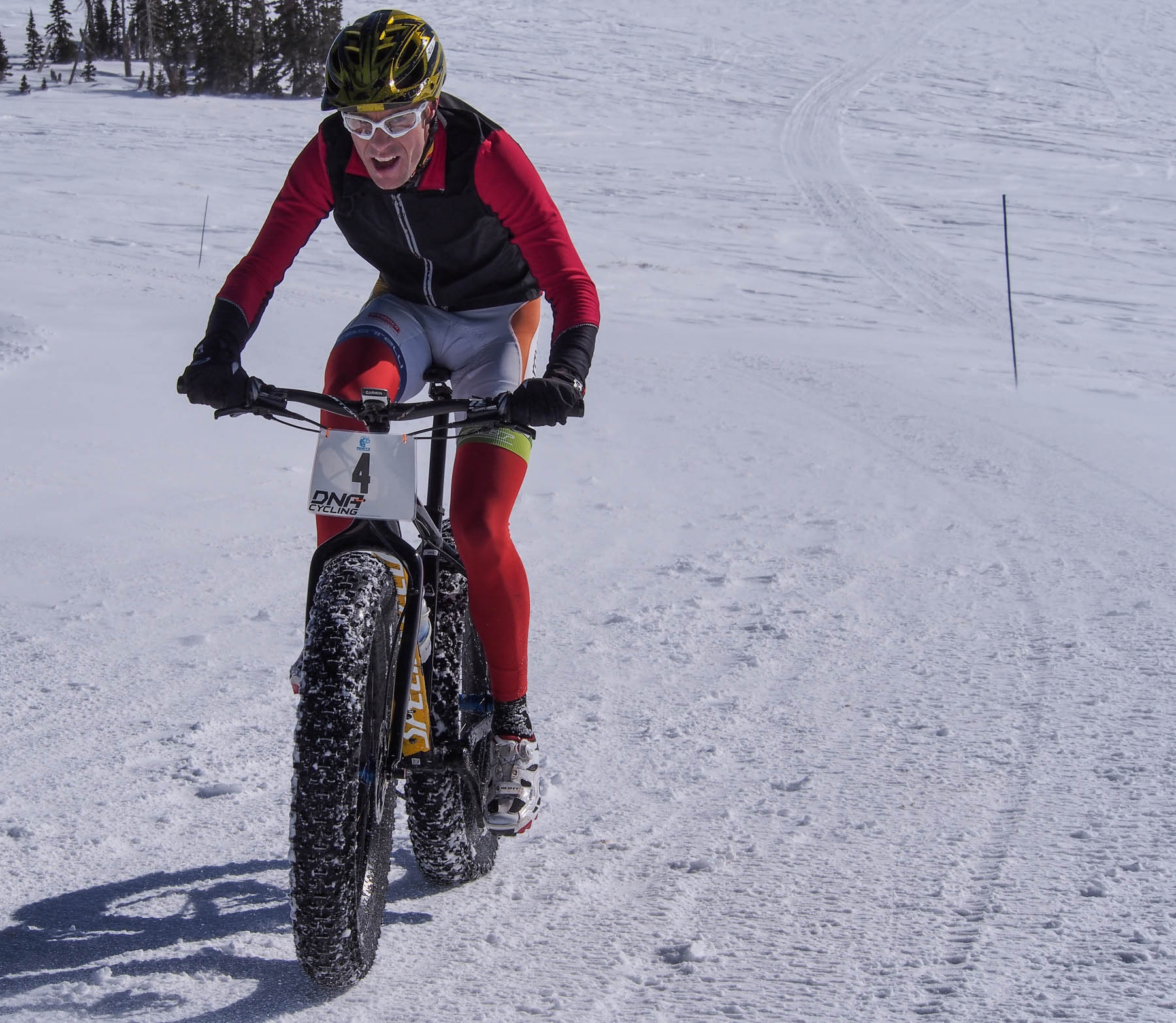 Saturday, February 7, was the date of the fourth race in the Frosty Fat Bike Race Series. The venue was fantastic—Powder Mountain ski resort in Northern Utah. The course was designed and built specifically for fat bikers, with large berms, jumps, and lots of ups and downs. In fact the US Cycling Fat Bike National Championship race will be on this same course tomorrow. It was a six mile course, which proved to be fairly challenging. The wind played into the challenges not only with strong headwinds, but drifting snow across the trail that forced all riders out of the saddle at times. Parts of the course were across open areas and the wind whipping across the landscape looked like something up in the arctic tundra. The A division did three laps for a total of 18 miles, the B’s did two laps, and the C’s did one lap. The competition was ramped up at this race and some of the usual favorites on the podium got a run for their money. The leaders were averaging about 30-32 minute laps.
