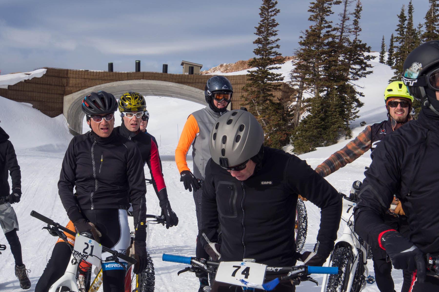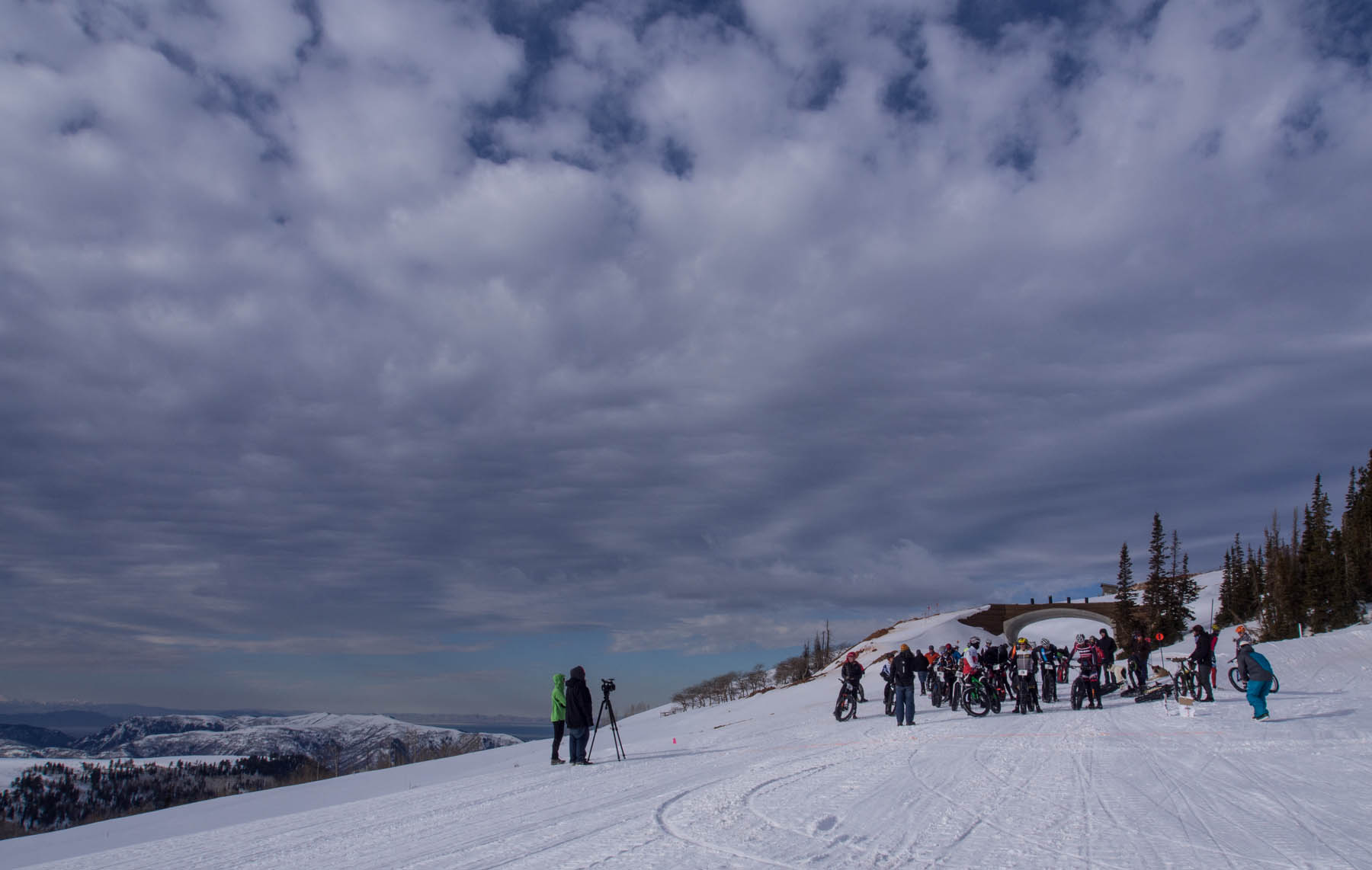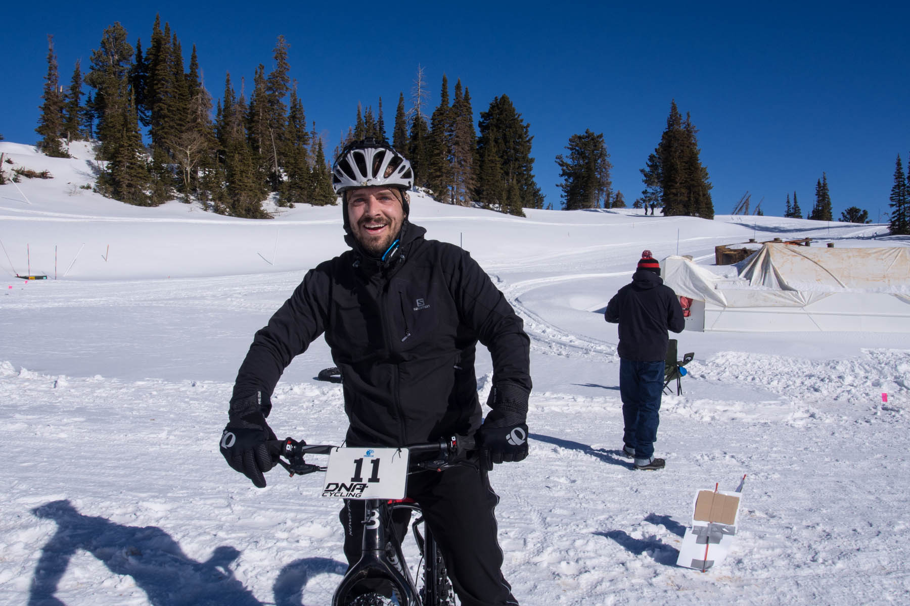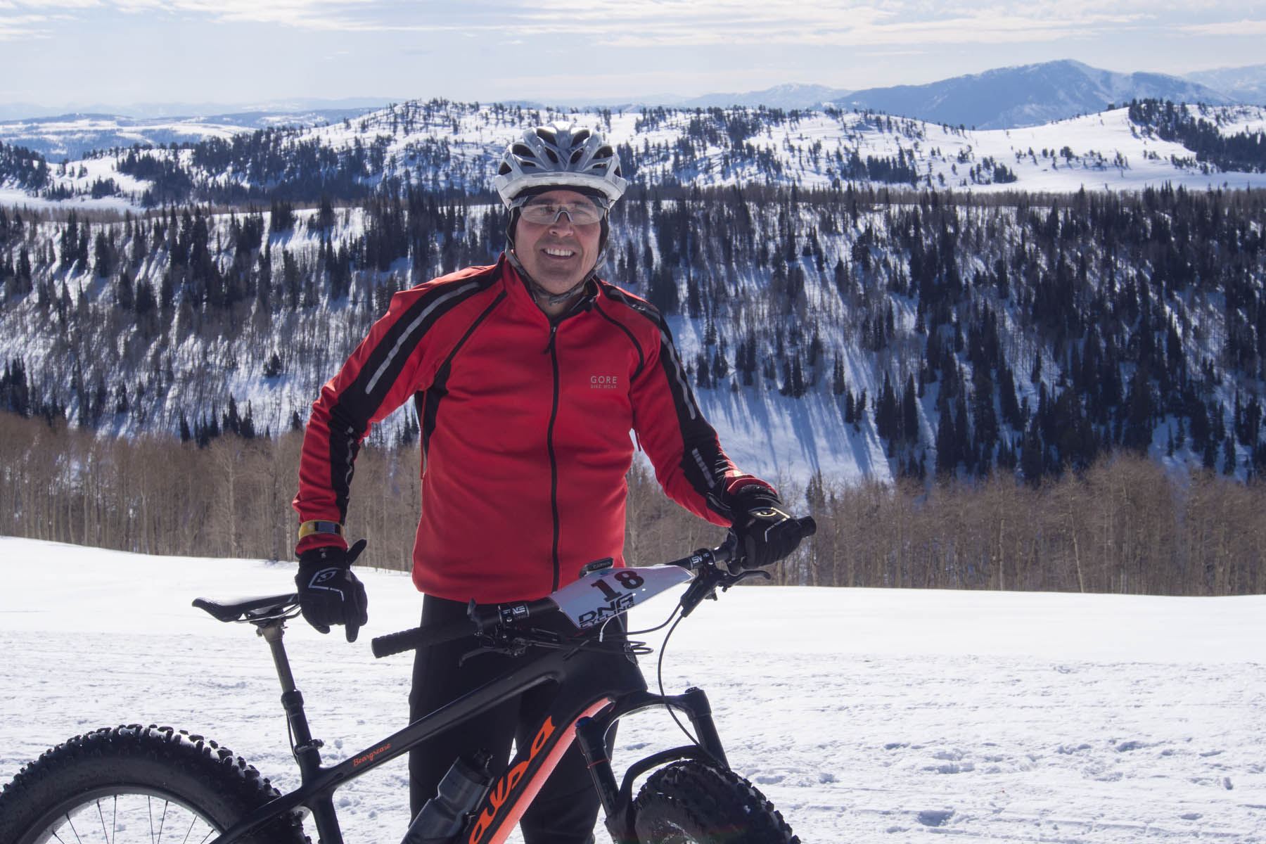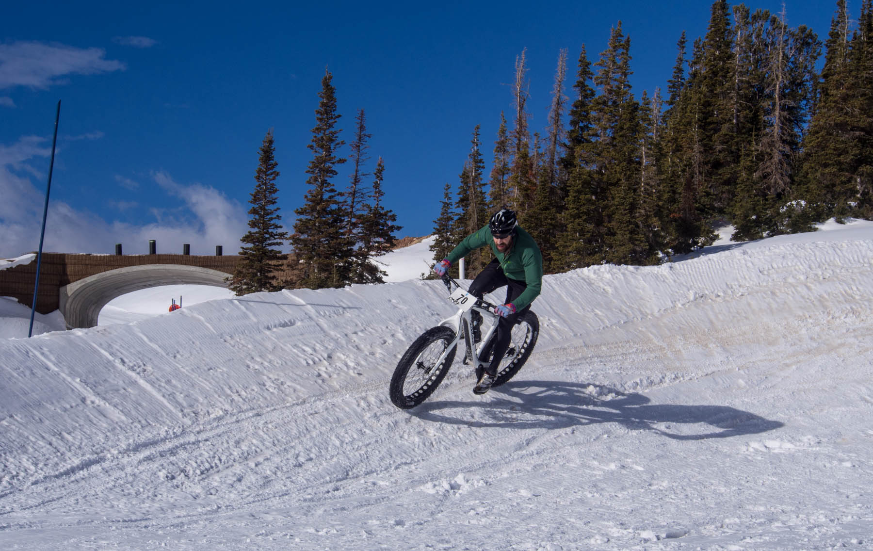 Saturday, February 7, was the date of the fourth race in the Frosty Fat Bike Race Series. The venue was fantastic—Powder Mountain ski resort in Northern Utah. The course was designed and built specifically for fat bikers, with large berms, jumps, and lots of ups and downs. In fact the US Cycling Fat Bike National Championship race will be on this same course tomorrow. It was a six mile course, which proved to be fairly challenging. The wind played into the challenges not only with strong headwinds, but drifting snow across the trail that forced all riders out of the saddle at times. Parts of the course were across open areas and the wind whipping across the landscape looked like something up in the arctic tundra. The A division did three laps for a total of 18 miles, the B’s did two laps, and the C’s did one lap. The competition was ramped up at this race and some of the usual favorites on the podium got a run for their money. The leaders were averaging about 30-32 minute laps.