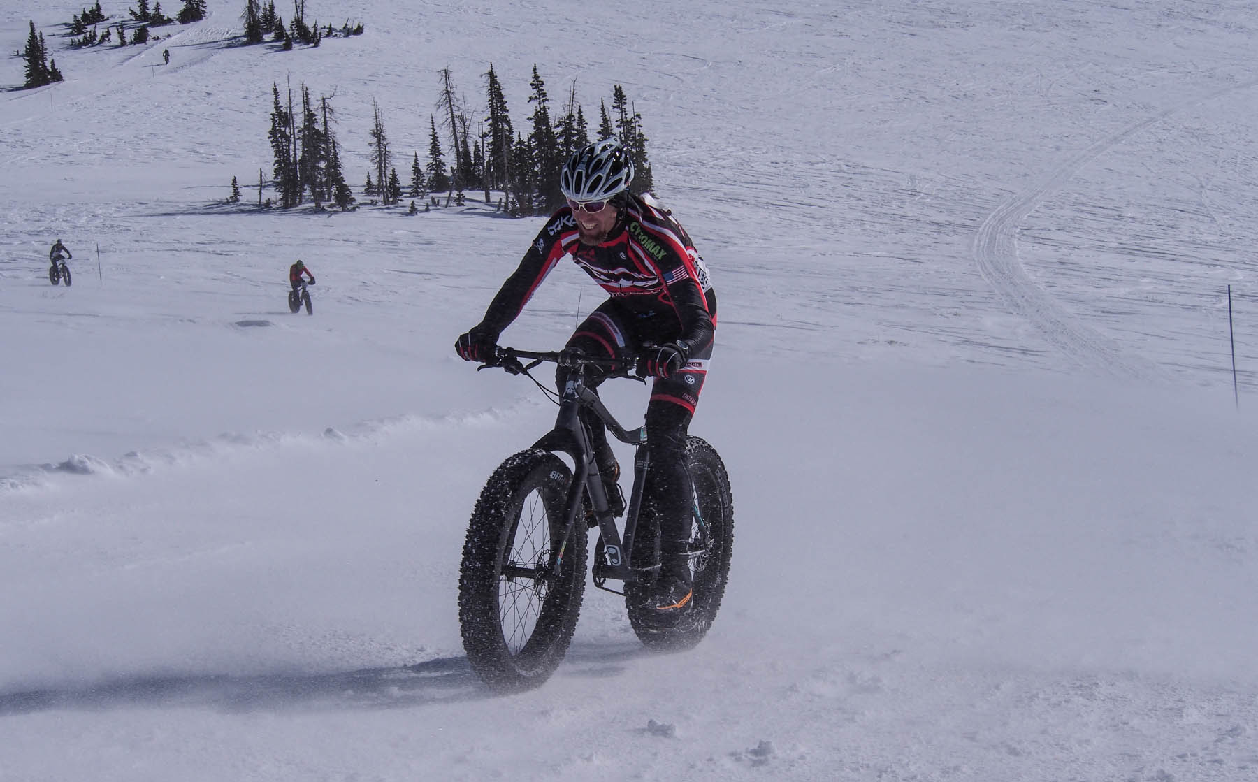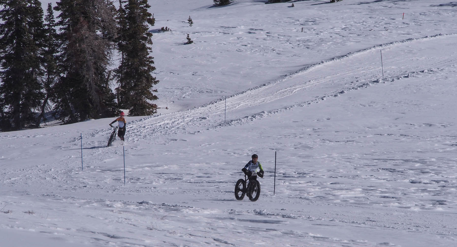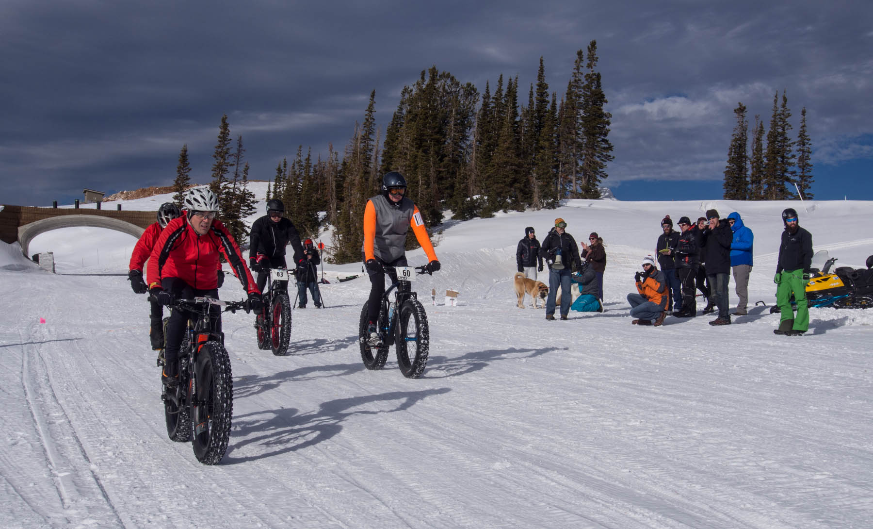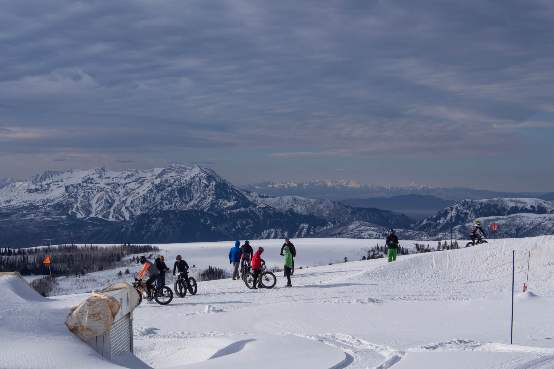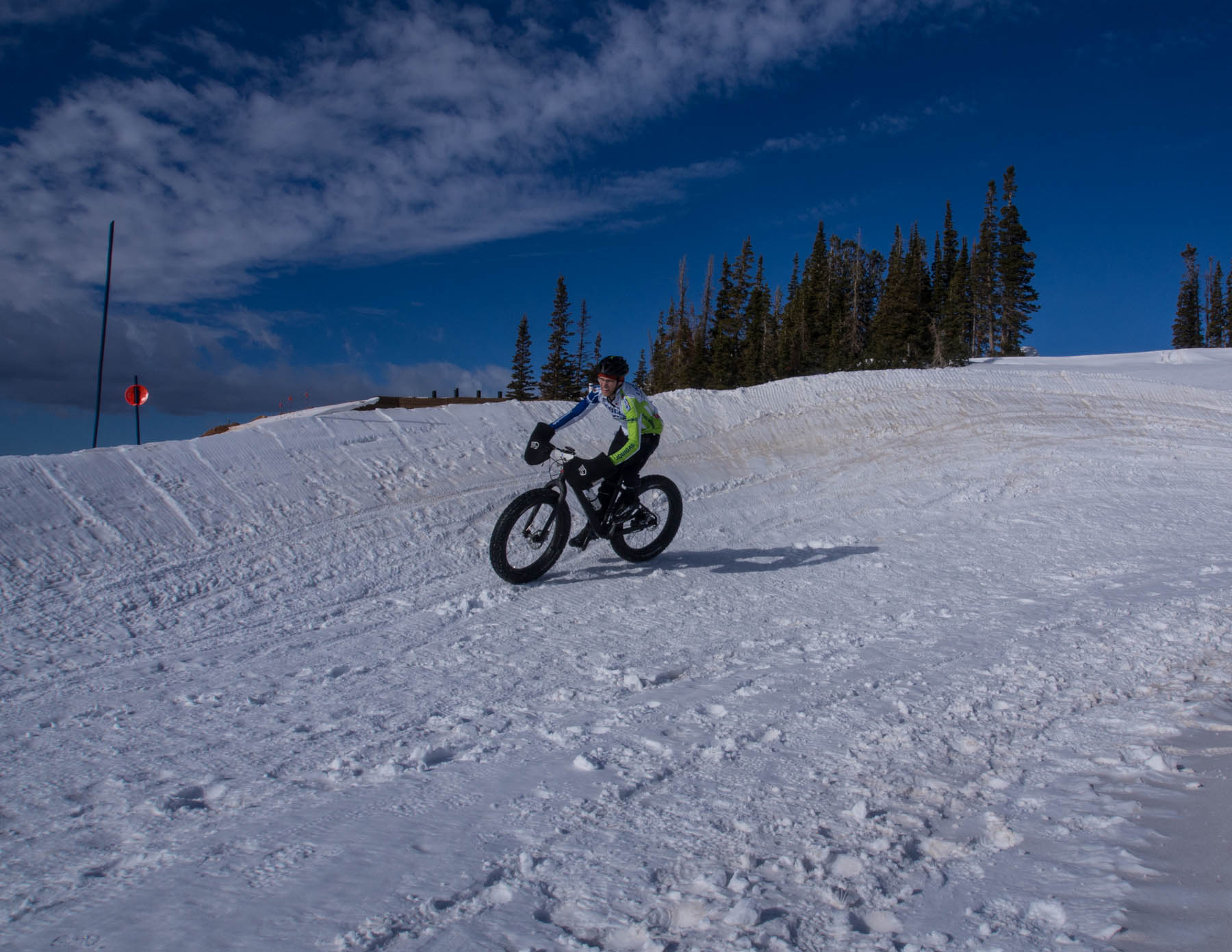 Saturday, February 7, was the date of the fourth race in the Frosty Fat Bike Race Series. The venue was fantastic—Powder Mountain ski resort in Northern Utah. The course was designed and built specifically for fat bikers, with large berms, jumps, and lots of ups and downs. In fact the US Cycling Fat Bike National Championship race will be on this same course tomorrow. It was a six mile course, which proved to be fairly challenging. The wind played into the challenges not only with strong headwinds, but drifting snow across the trail that forced all riders out of the saddle at times. Parts of the course were across open areas and the wind whipping across the landscape looked like something up in the arctic tundra. The A division did three laps for a total of 18 miles, the B’s did two laps, and the C’s did one lap. The competition was ramped up at this race and some of the usual favorites on the podium got a run for their money. The leaders were averaging about 30-32 minute laps.