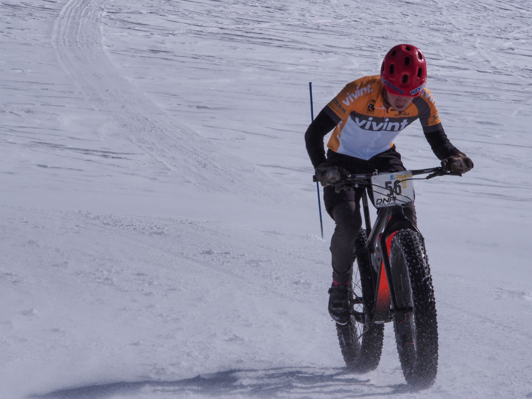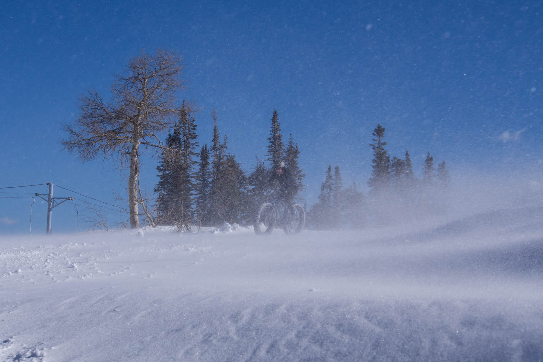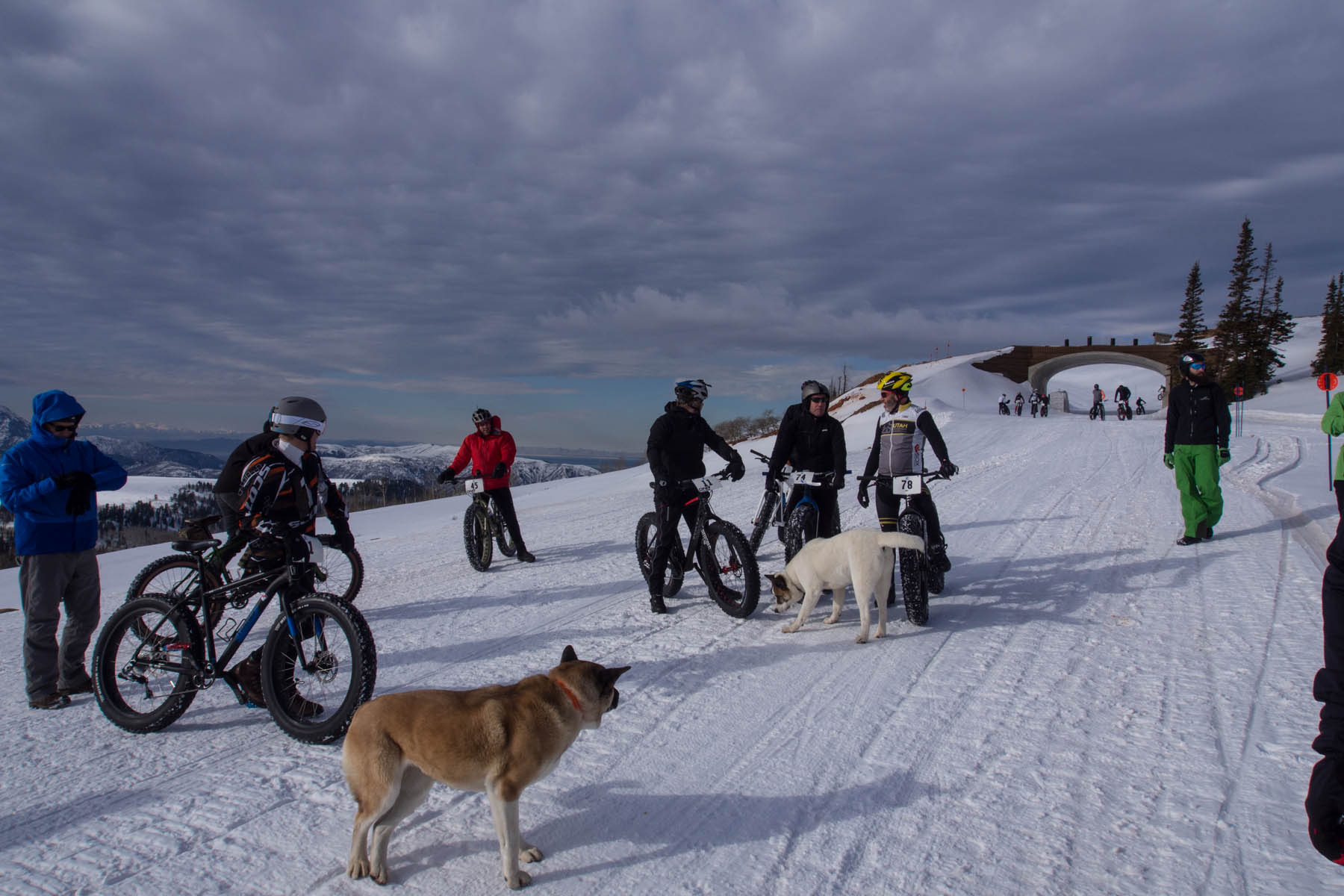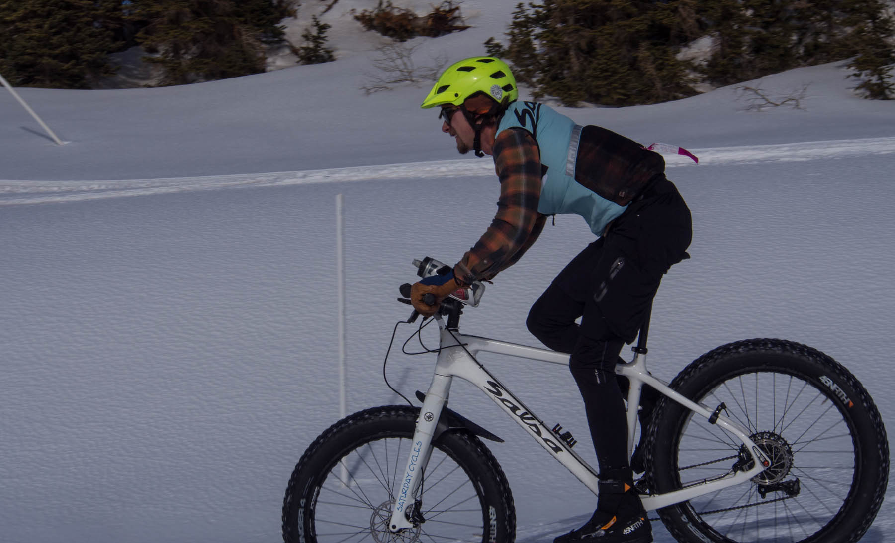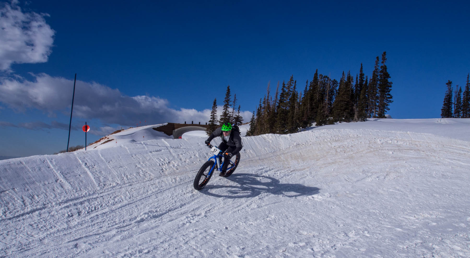 Saturday, February 7, was the date of the fourth race in the Frosty Fat Bike Race Series. The venue was fantastic—Powder Mountain ski resort in Northern Utah. The course was designed and built specifically for fat bikers, with large berms, jumps, and lots of ups and downs. In fact the US Cycling Fat Bike National Championship race will be on this same course tomorrow. It was a six mile course, which proved to be fairly challenging. The wind played into the challenges not only with strong headwinds, but drifting snow across the trail that forced all riders out of the saddle at times. Parts of the course were across open areas and the wind whipping across the landscape looked like something up in the arctic tundra. The A division did three laps for a total of 18 miles, the B’s did two laps, and the C’s did one lap. The competition was ramped up at this race and some of the usual favorites on the podium got a run for their money. The leaders were averaging about 30-32 minute laps.