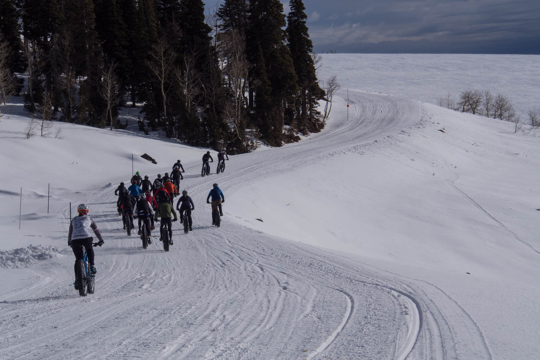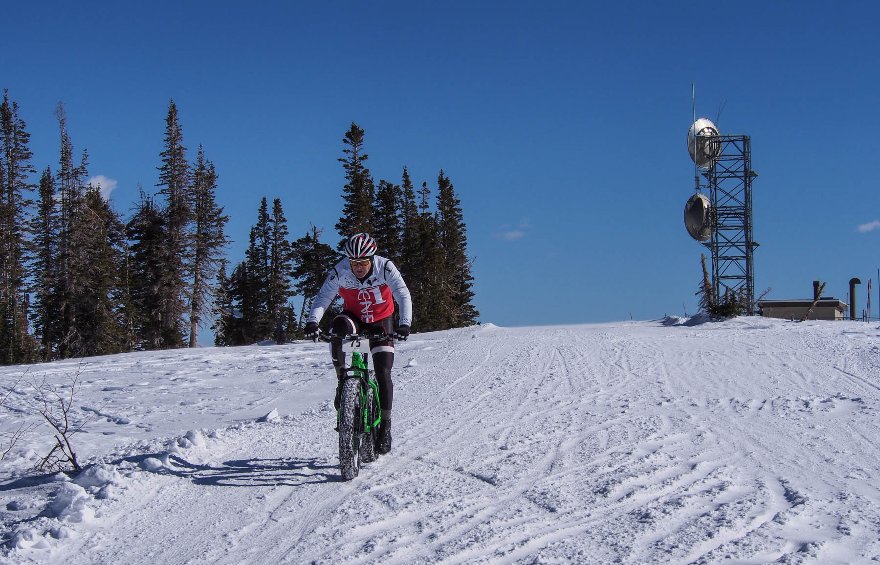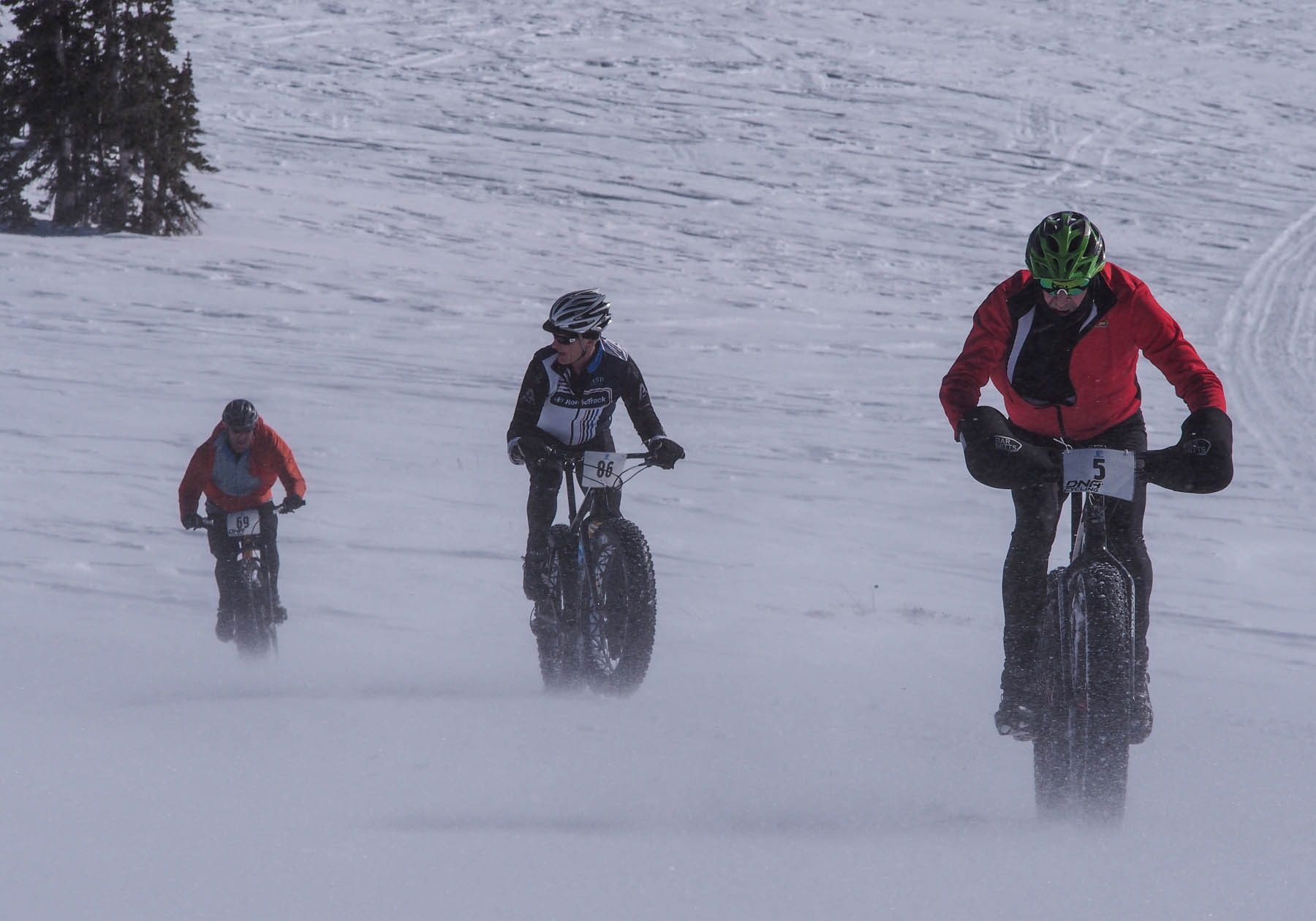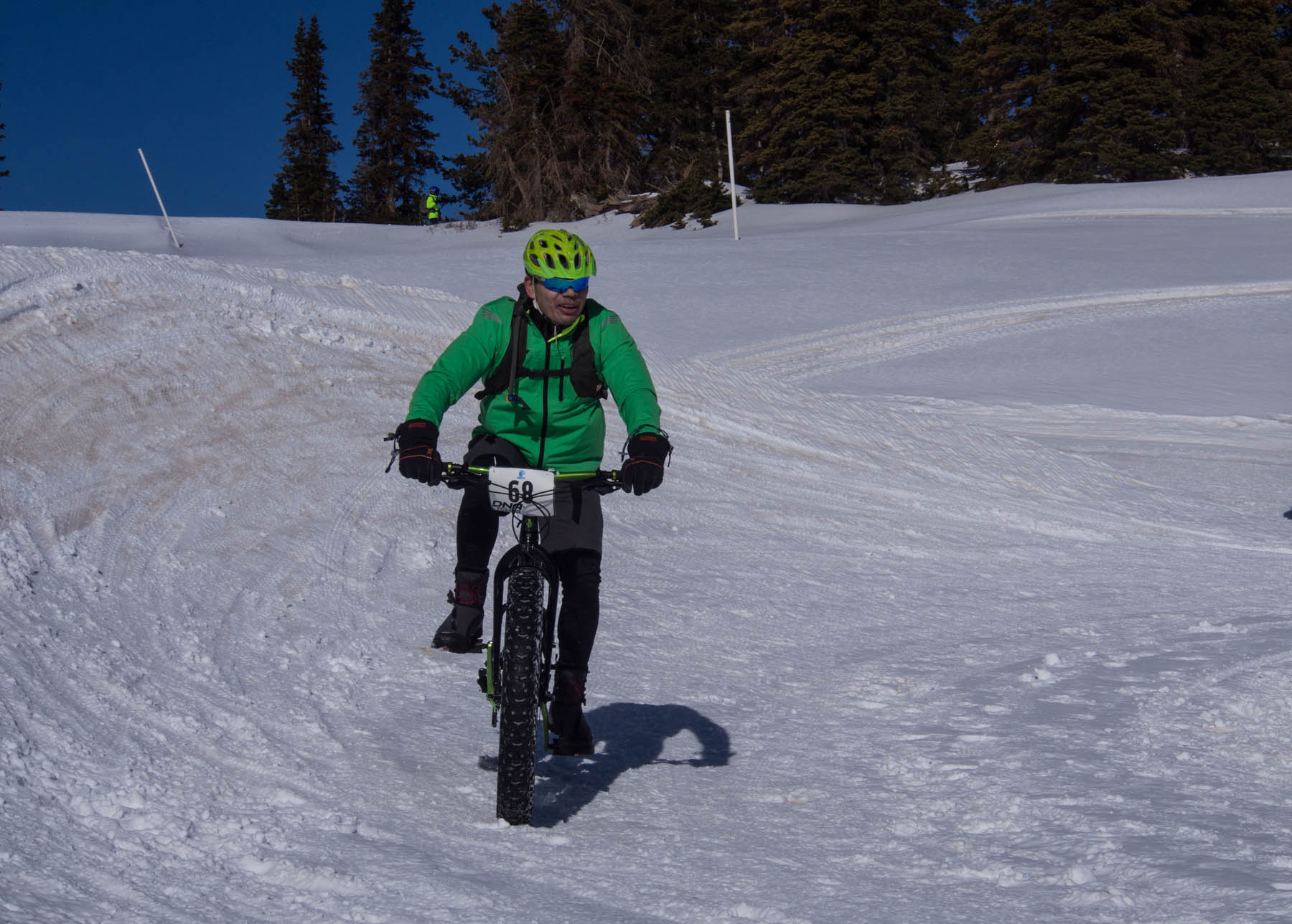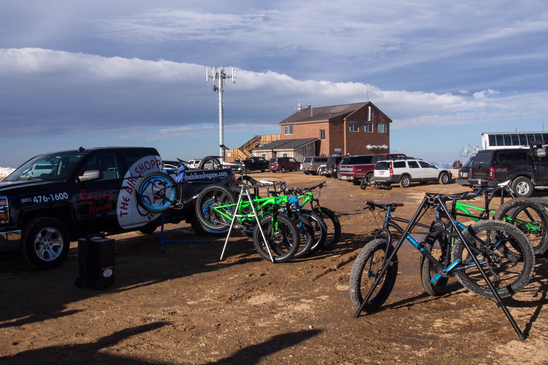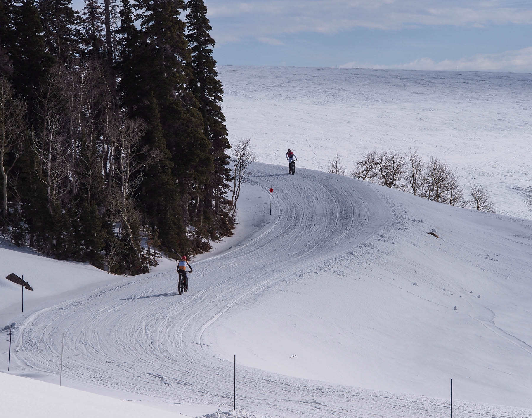 Saturday, February 7, was the date of the fourth race in the Frosty Fat Bike Race Series. The venue was fantastic—Powder Mountain ski resort in Northern Utah. The course was designed and built specifically for fat bikers, with large berms, jumps, and lots of ups and downs. In fact the US Cycling Fat Bike National Championship race will be on this same course tomorrow. It was a six mile course, which proved to be fairly challenging. The wind played into the challenges not only with strong headwinds, but drifting snow across the trail that forced all riders out of the saddle at times. Parts of the course were across open areas and the wind whipping across the landscape looked like something up in the arctic tundra. The A division did three laps for a total of 18 miles, the B’s did two laps, and the C’s did one lap. The competition was ramped up at this race and some of the usual favorites on the podium got a run for their money. The leaders were averaging about 30-32 minute laps.