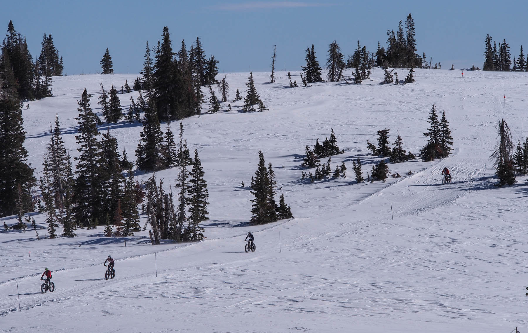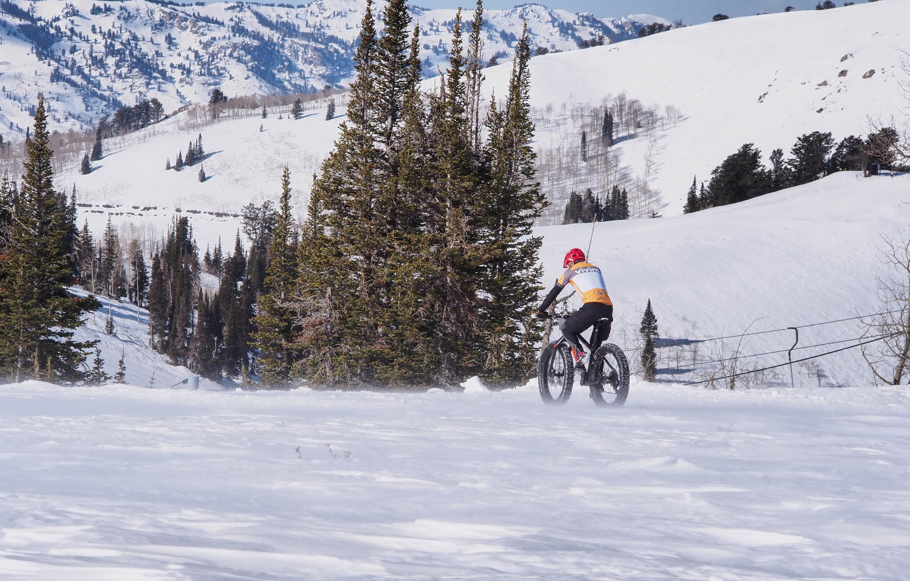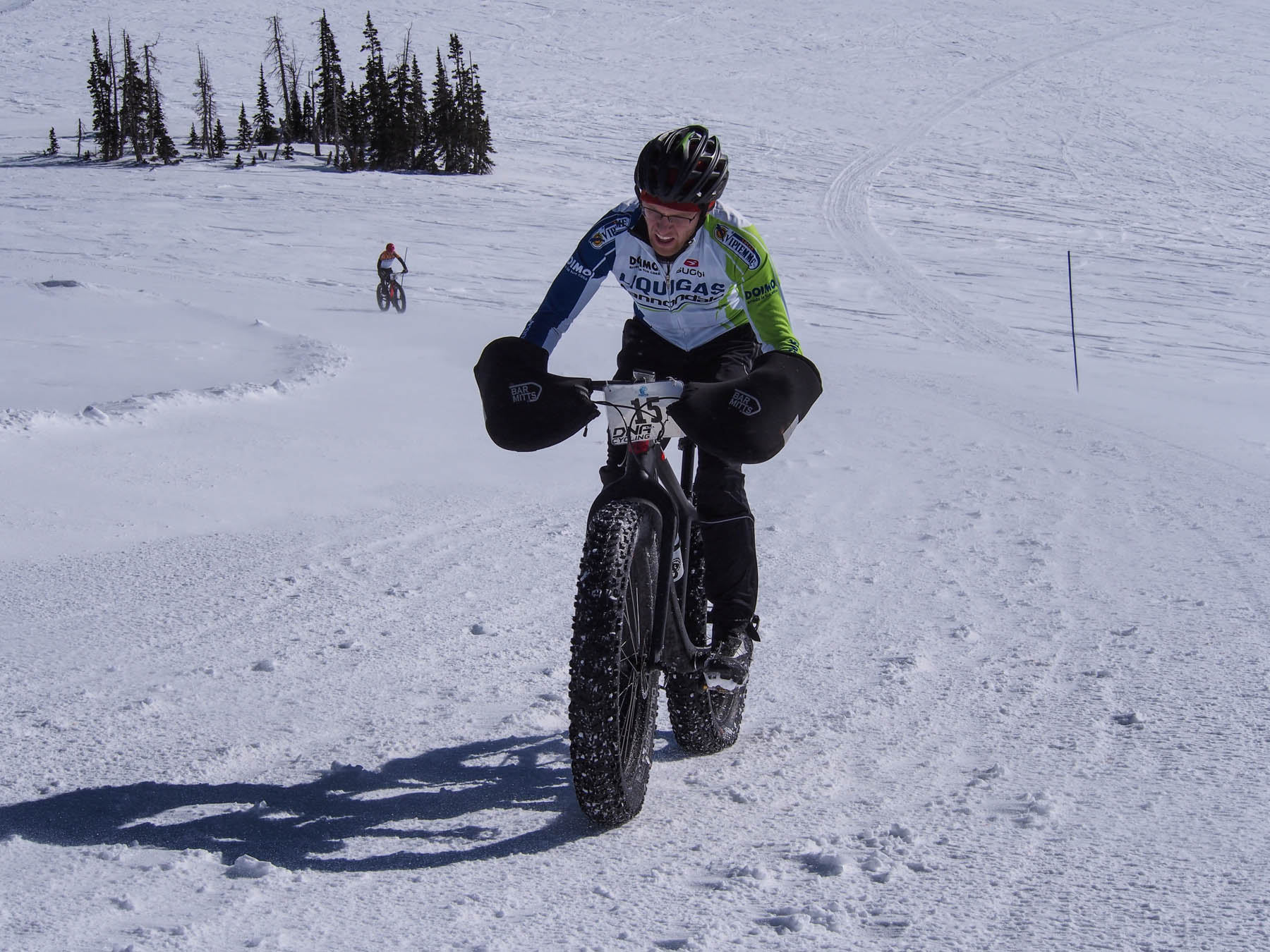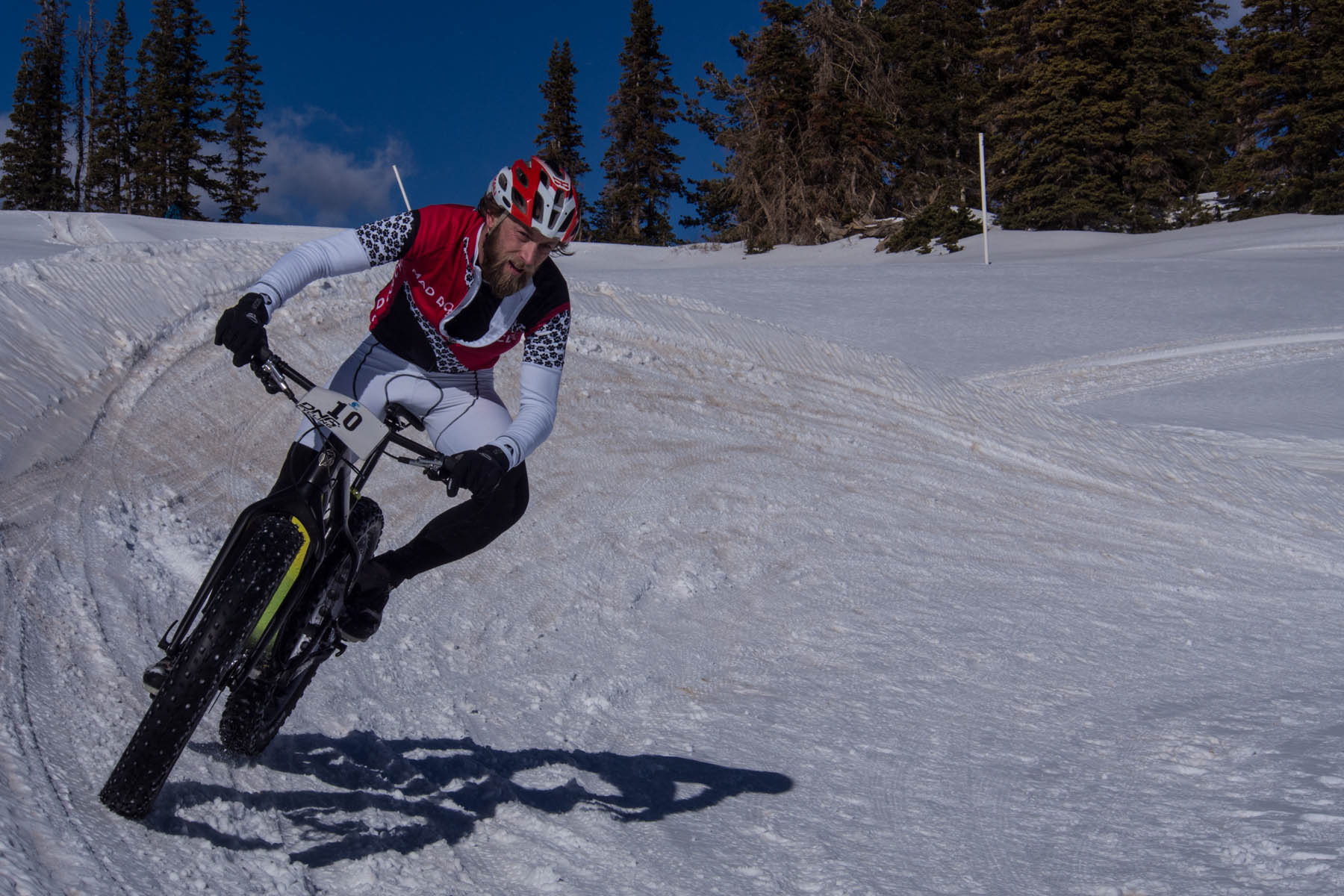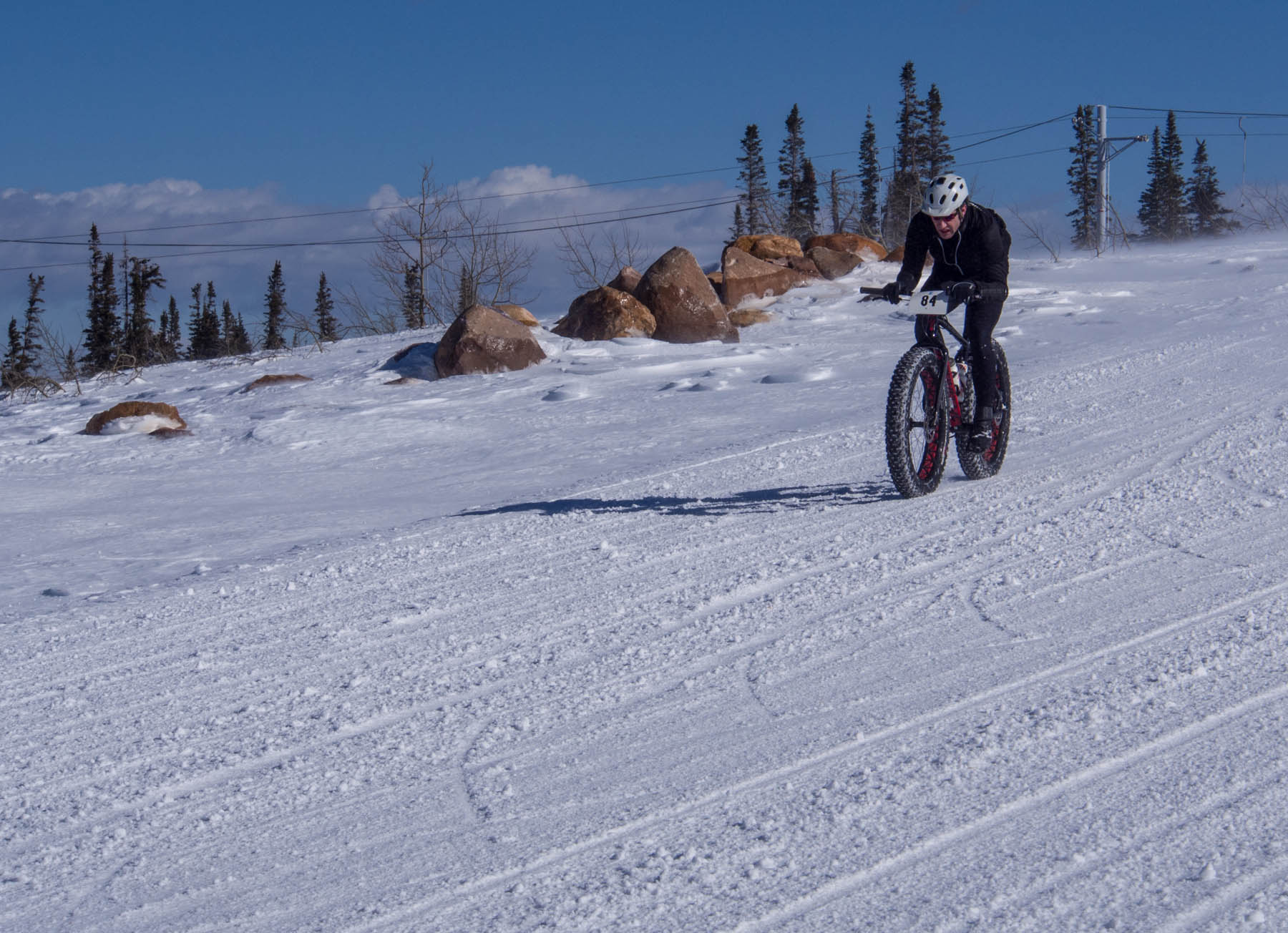 Saturday, February 7, was the date of the fourth race in the Frosty Fat Bike Race Series. The venue was fantastic—Powder Mountain ski resort in Northern Utah. The course was designed and built specifically for fat bikers, with large berms, jumps, and lots of ups and downs. In fact the US Cycling Fat Bike National Championship race will be on this same course tomorrow. It was a six mile course, which proved to be fairly challenging. The wind played into the challenges not only with strong headwinds, but drifting snow across the trail that forced all riders out of the saddle at times. Parts of the course were across open areas and the wind whipping across the landscape looked like something up in the arctic tundra. The A division did three laps for a total of 18 miles, the B’s did two laps, and the C’s did one lap. The competition was ramped up at this race and some of the usual favorites on the podium got a run for their money. The leaders were averaging about 30-32 minute laps.