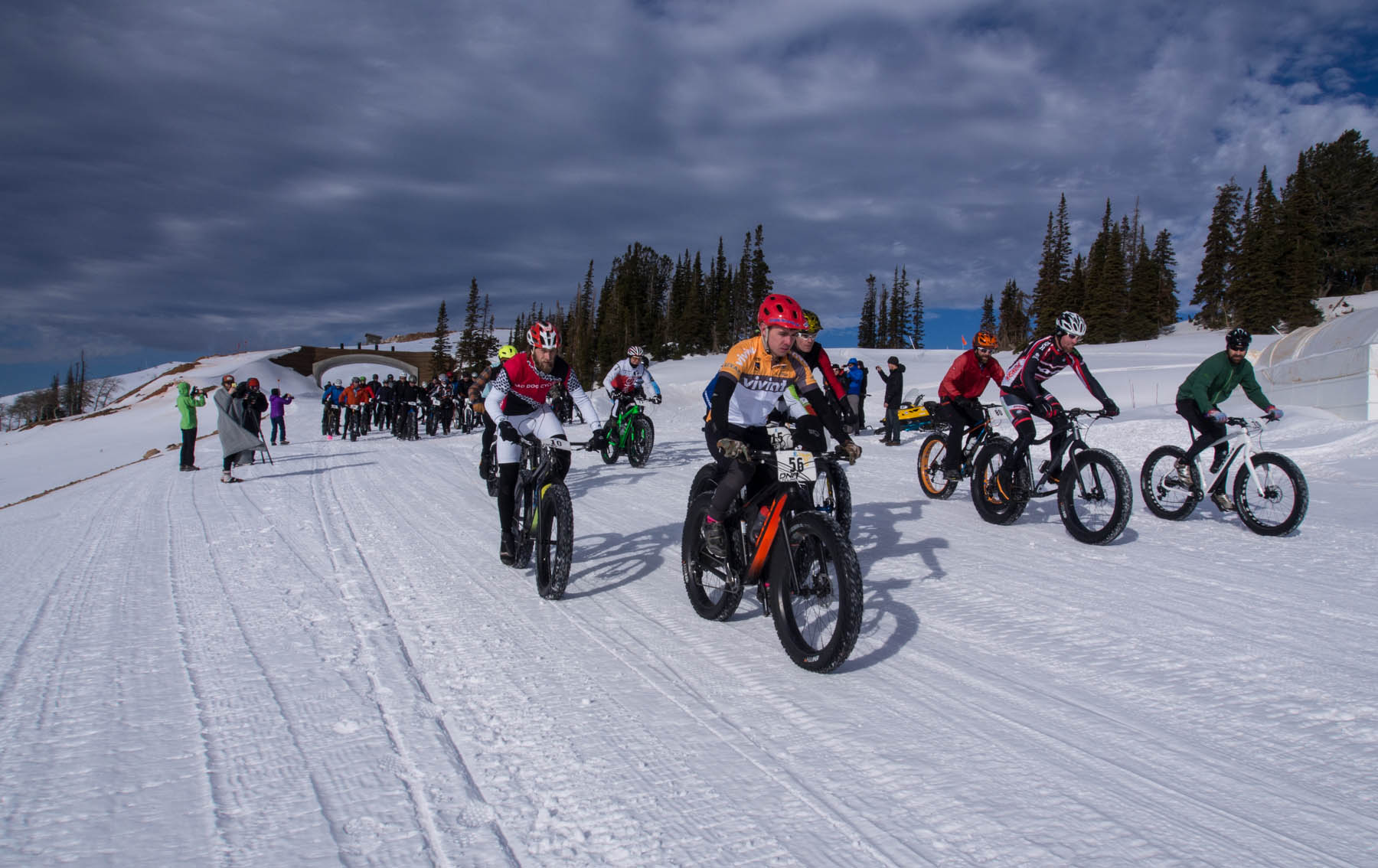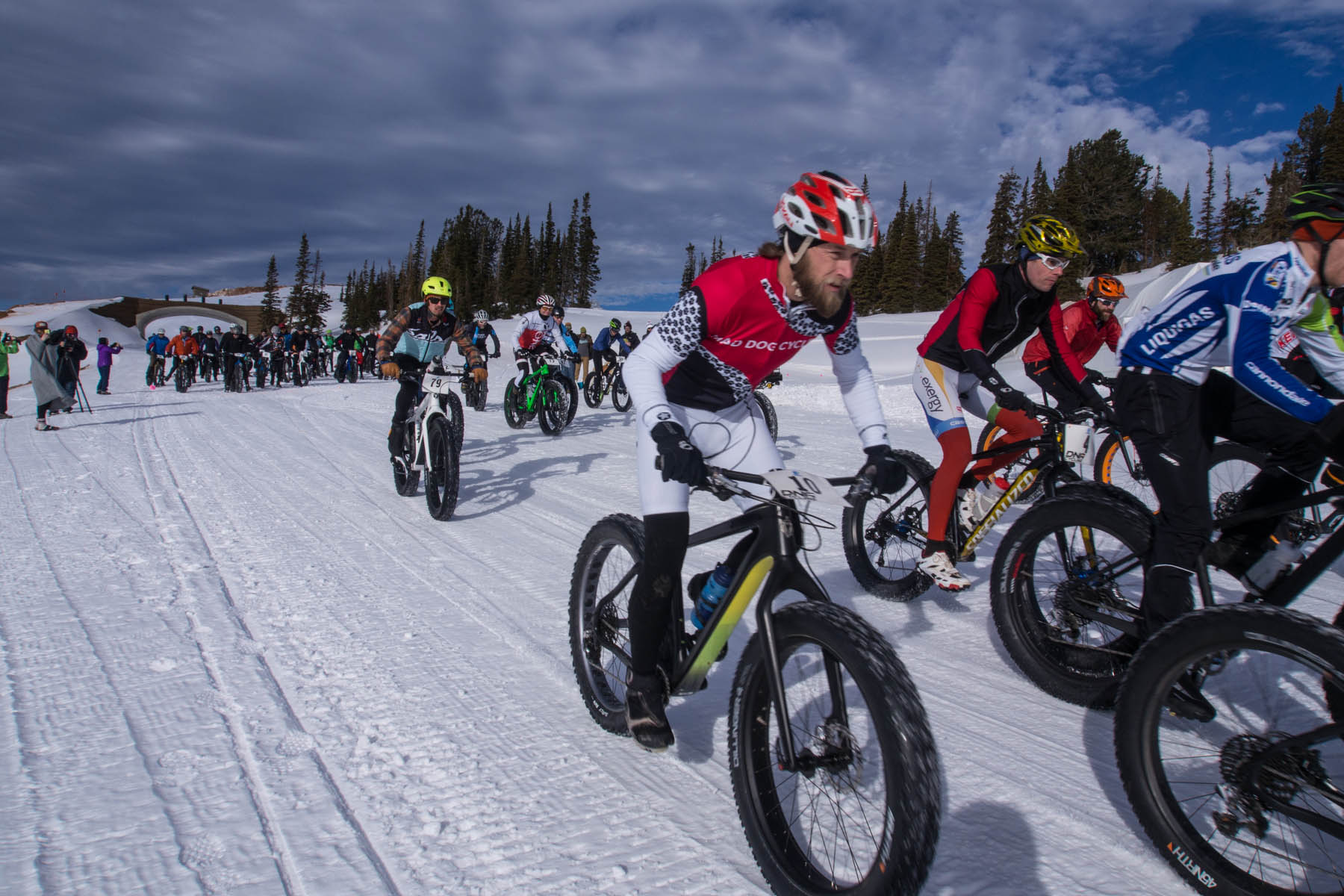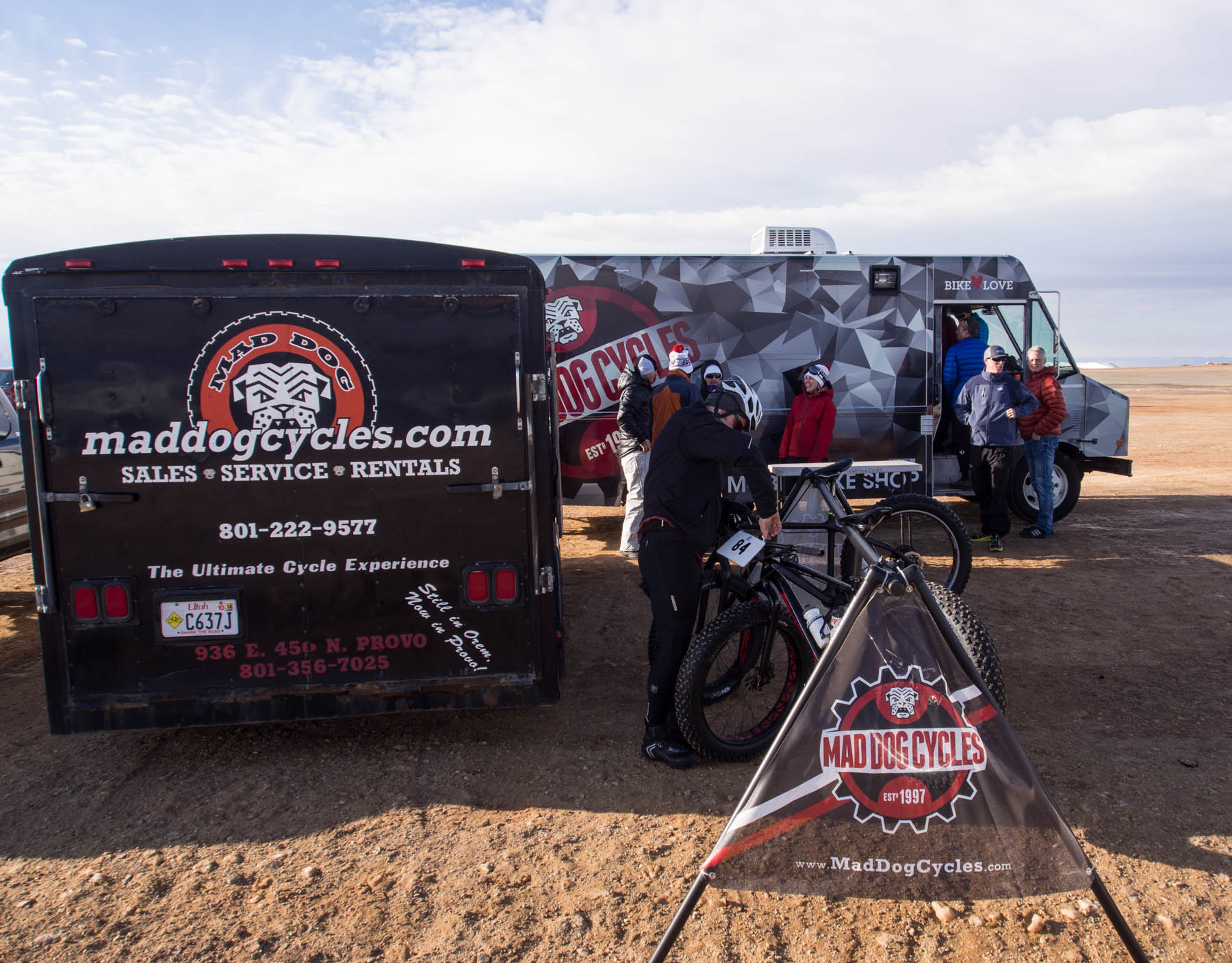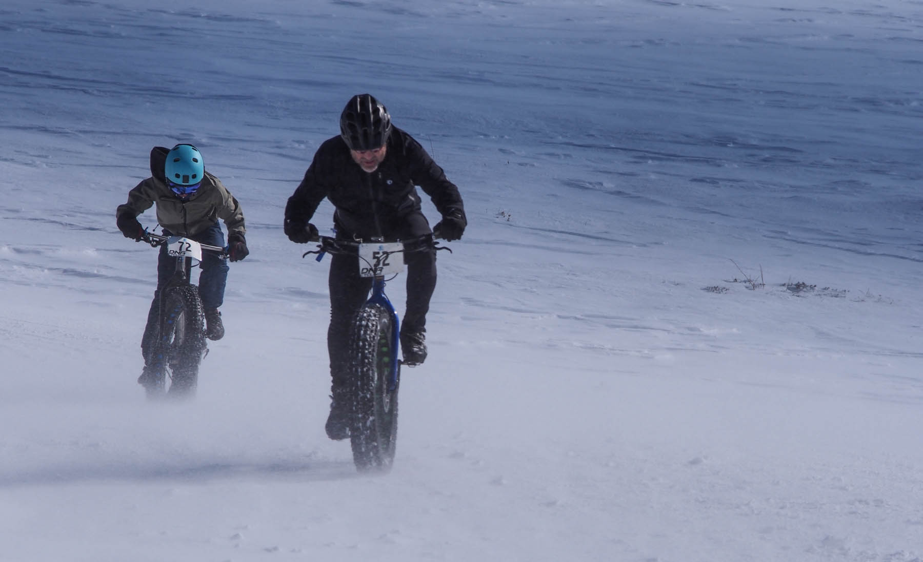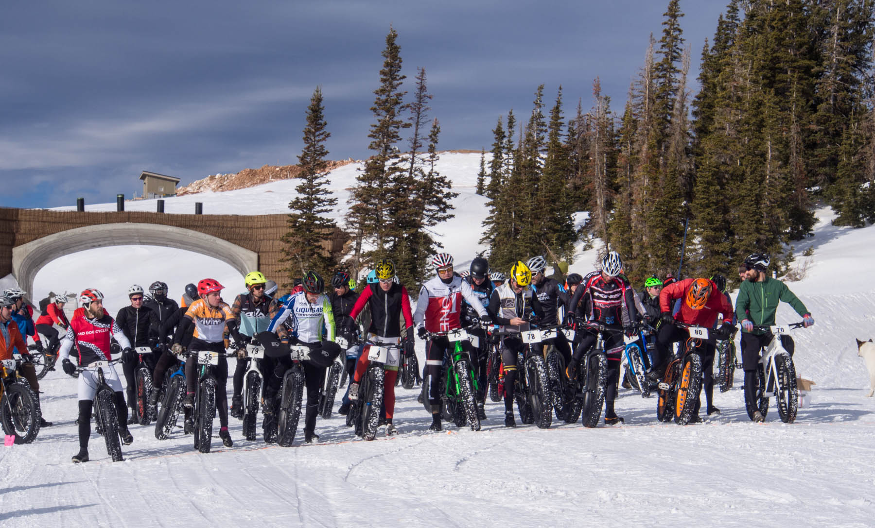 Saturday, February 7, was the date of the fourth race in the Frosty Fat Bike Race Series. The venue was fantastic—Powder Mountain ski resort in Northern Utah. The course was designed and built specifically for fat bikers, with large berms, jumps, and lots of ups and downs. In fact the US Cycling Fat Bike National Championship race will be on this same course tomorrow. It was a six mile course, which proved to be fairly challenging. The wind played into the challenges not only with strong headwinds, but drifting snow across the trail that forced all riders out of the saddle at times. Parts of the course were across open areas and the wind whipping across the landscape looked like something up in the arctic tundra. The A division did three laps for a total of 18 miles, the B’s did two laps, and the C’s did one lap. The competition was ramped up at this race and some of the usual favorites on the podium got a run for their money. The leaders were averaging about 30-32 minute laps.