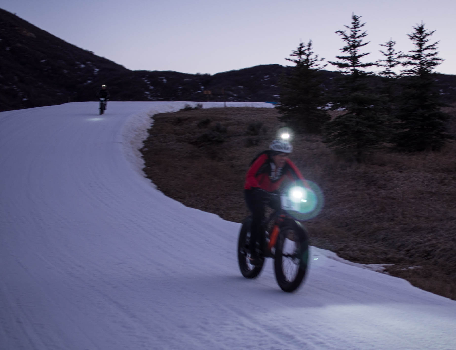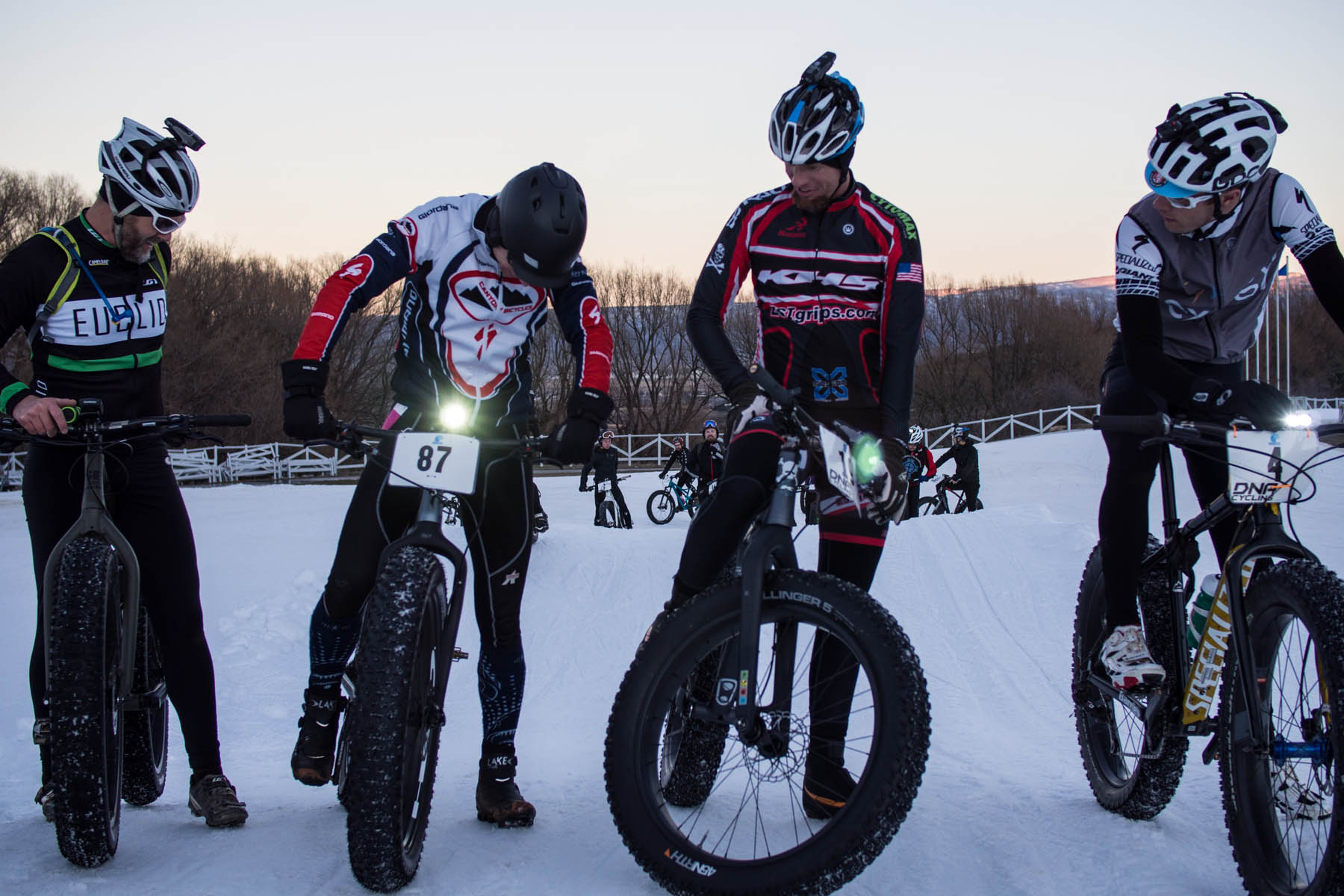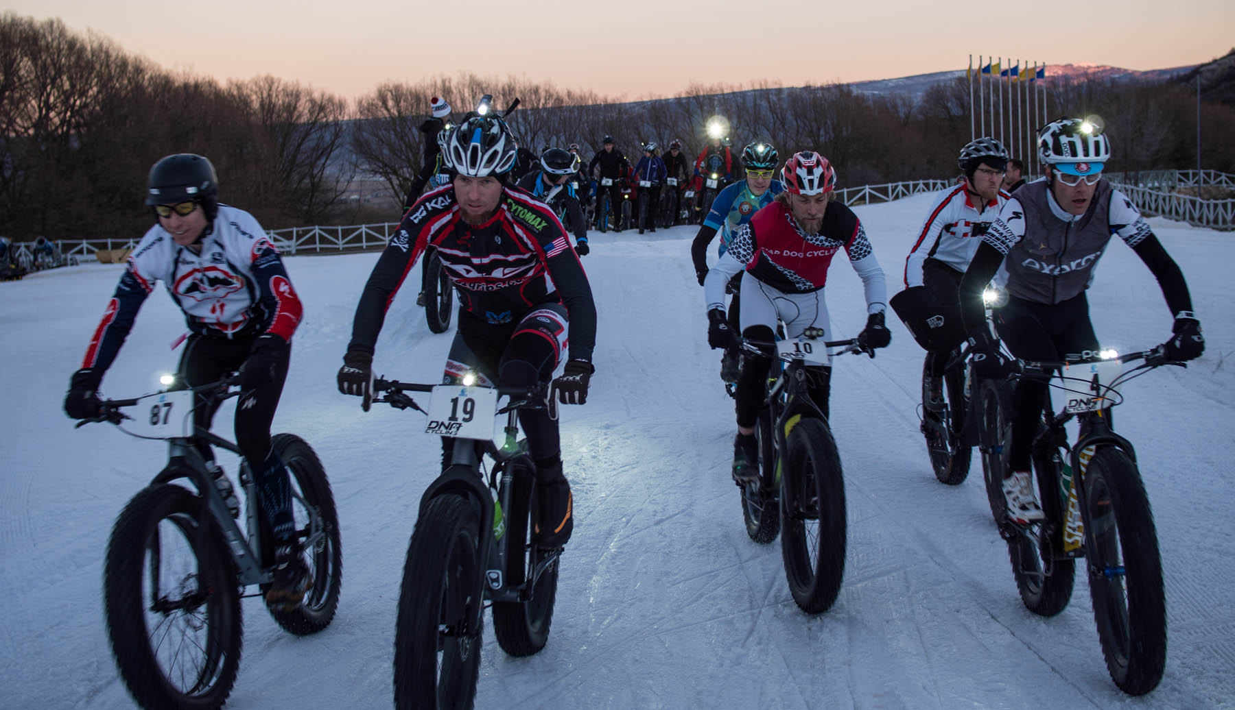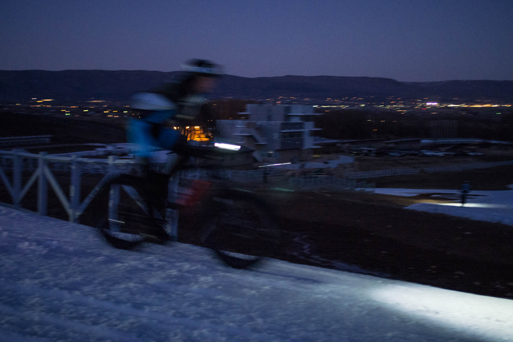 The fifth race in the series was a night race at Soldier Hollow, the 2002 Winter Olympics cross country ski venue. Despite the warm weather we have had, the course was in good shape with plenty of snow cover and it was groomed nicely. In fact, riders that had dirty tires were asked to clean them before riding on the course. It was a fast course with the leaders covering each lap in about 10 minutes. As usual Mad Dog Cycles (http://maddogcycles.com/), the primary race sponsor, was on hand for mechanical support. There was also the usual raffle after the race where lots of bike goodies were given away. The three winners in Division A rode a close race until the end when Charles Jenkins pulled away. Howlin’ Wolfe’s strong kick allowed him to pull away from Geoff Montague for second.