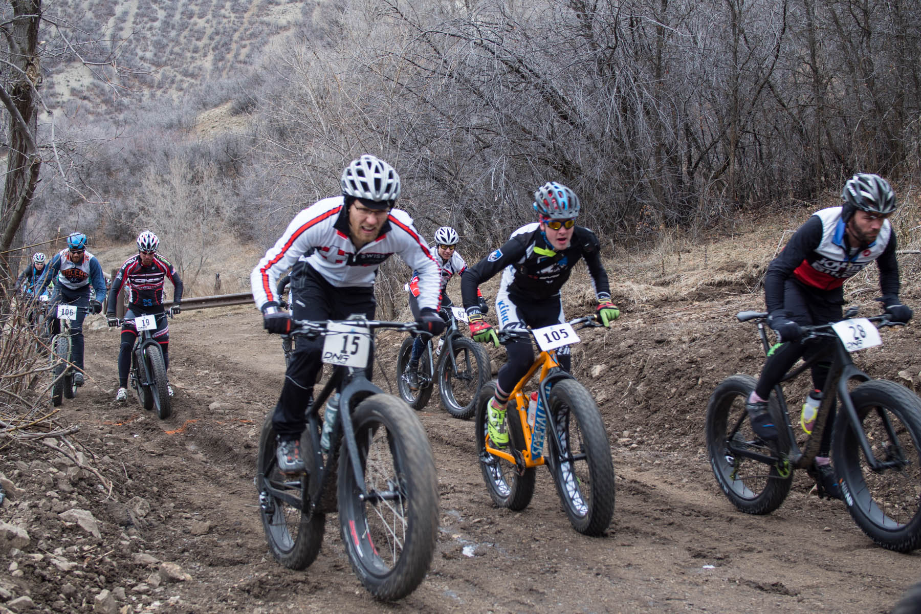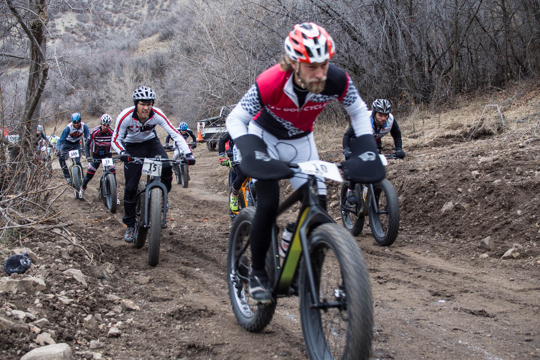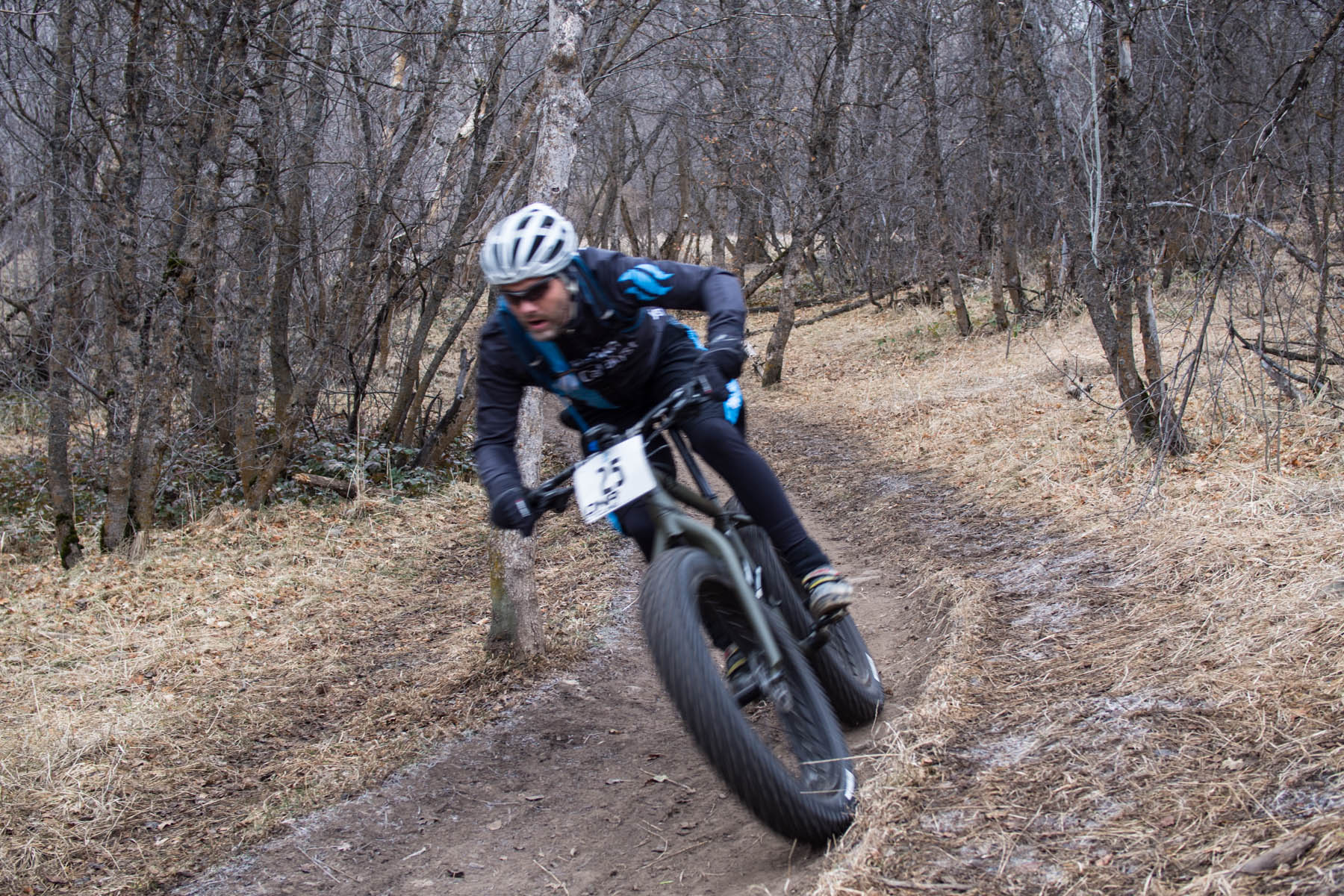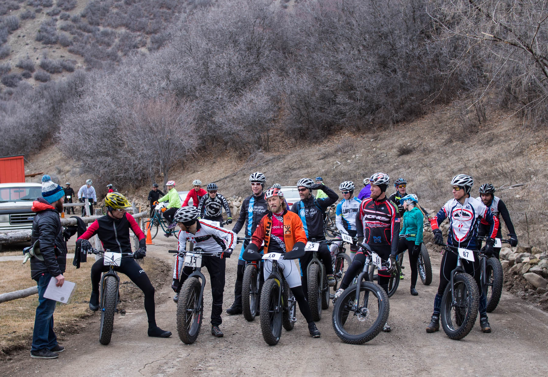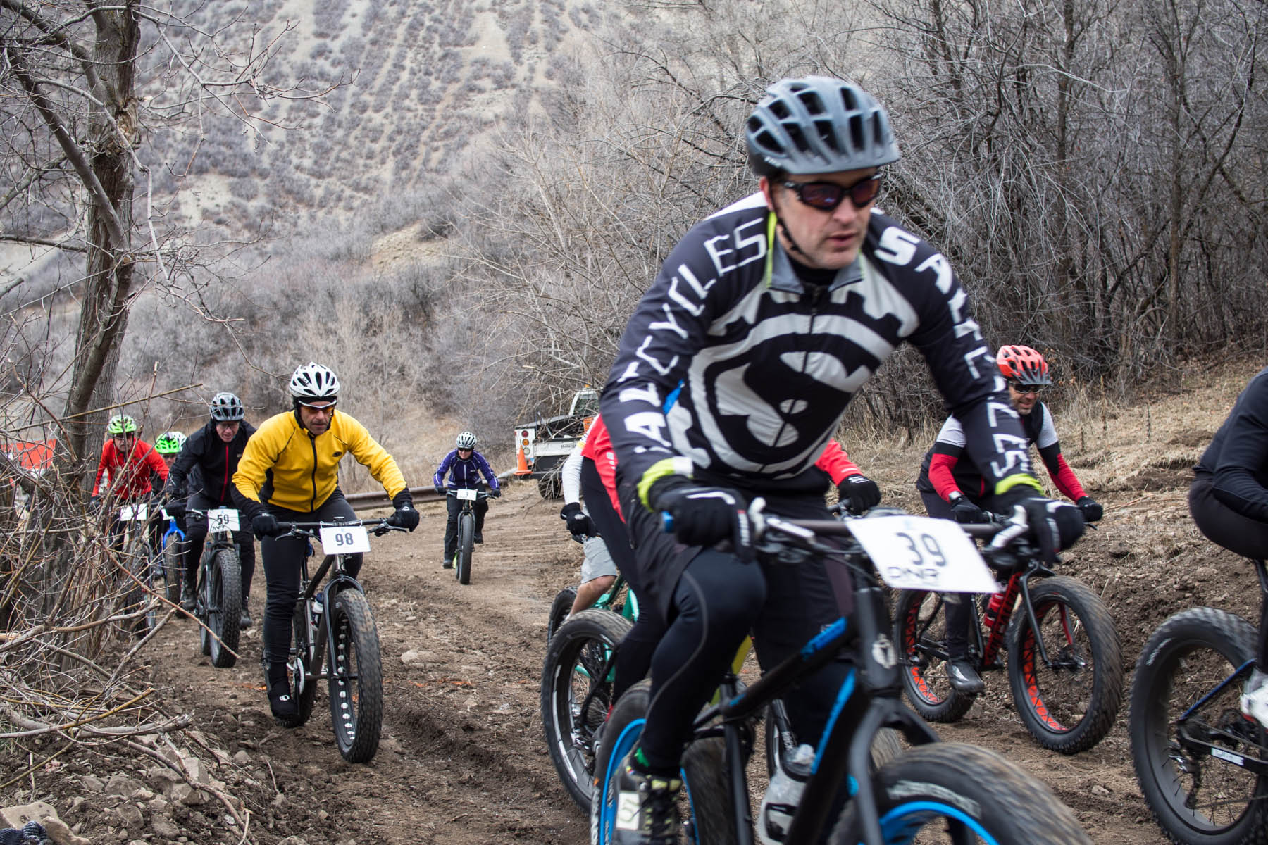 Saturday, February 28, was the last race in the Frosty Fat Bike Series. The lack of snow did not dampen the enthusiasm though. Provo City was a sponsor and there was a mini Winter Festival as well. A couple food trucks showed up, there was a dog sled team, an avalanche awareness presentation, and a wilderness first aid presentation. Mad Dog Cycles was there of course, and there were lots of goodies for the raffle. Since this was the final race in the series, the overall points leaders were recognized at the end. The course was relatively short and fast, up the fire road and down the singletrack; 5 laps for the A’s, 4 laps for the B’s and 3 laps for the C’s. Scroll down for the winners. First, the video, then the photos. Check out my Flickr photography page  (link below) for lots more photos.
