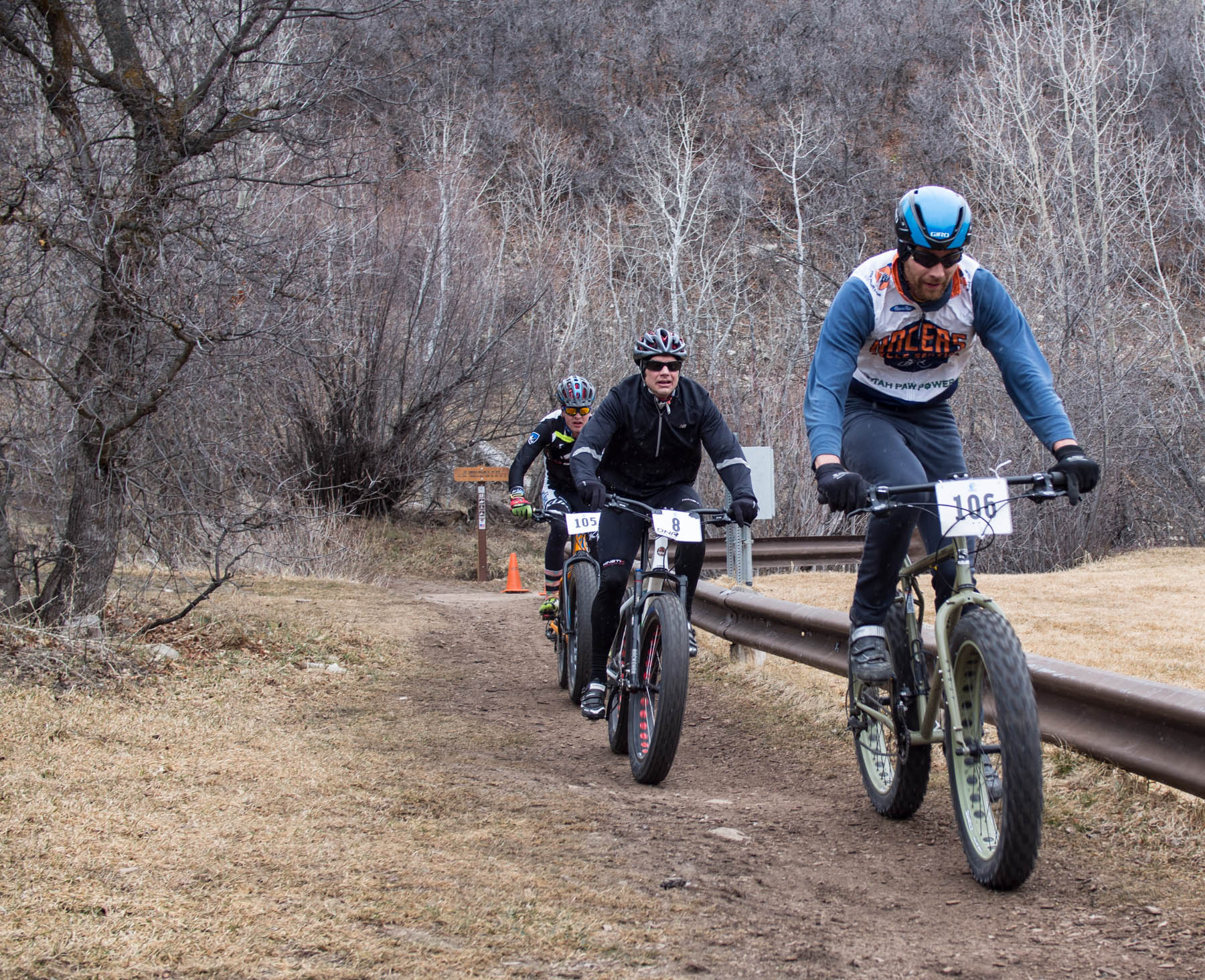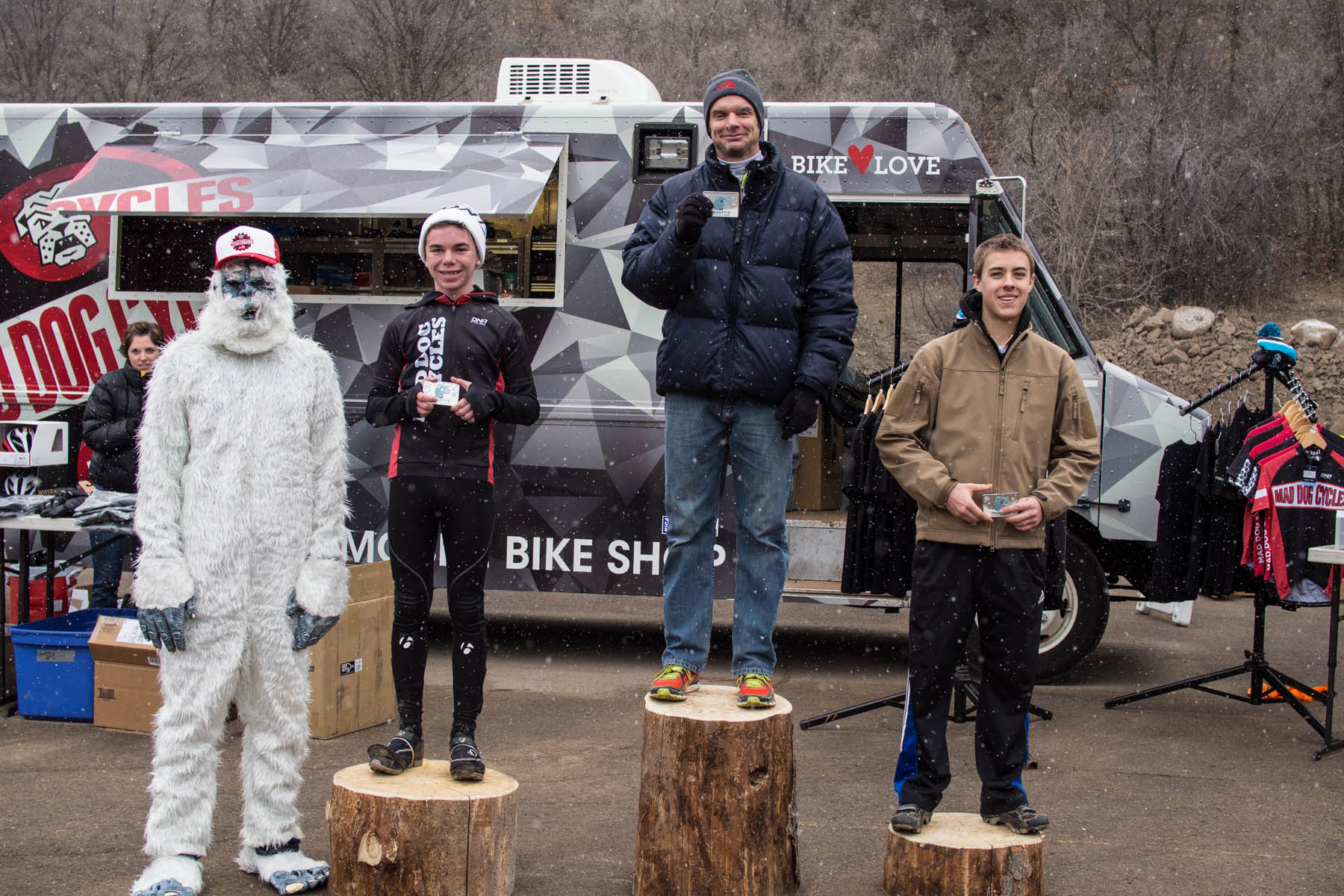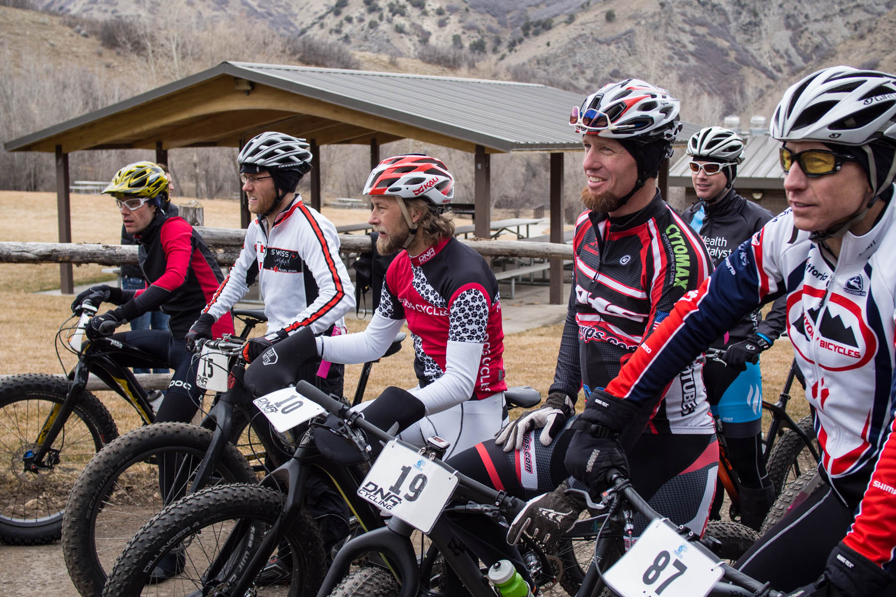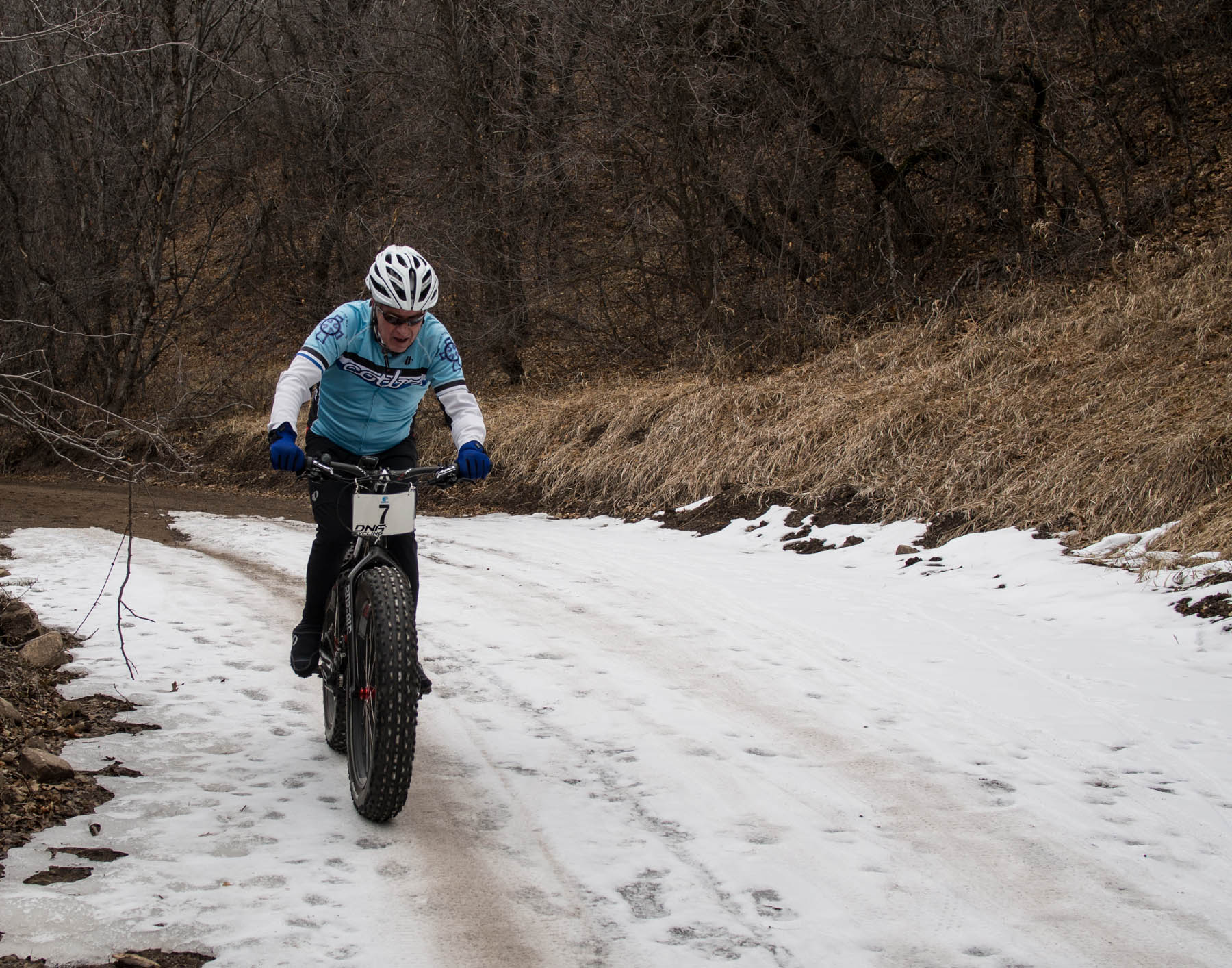 Saturday, February 28, was the last race in the Frosty Fat Bike Series. The lack of snow did not dampen the enthusiasm though. Provo City was a sponsor and there was a mini Winter Festival as well. A couple food trucks showed up, there was a dog sled team, an avalanche awareness presentation, and a wilderness first aid presentation. Mad Dog Cycles was there of course, and there were lots of goodies for the raffle. Since this was the final race in the series, the overall points leaders were recognized at the end. The course was relatively short and fast, up the fire road and down the singletrack; 5 laps for the A’s, 4 laps for the B’s and 3 laps for the C’s. Scroll down for the winners. First, the video, then the photos. Check out my Flickr photography page  (link below) for lots more photos.