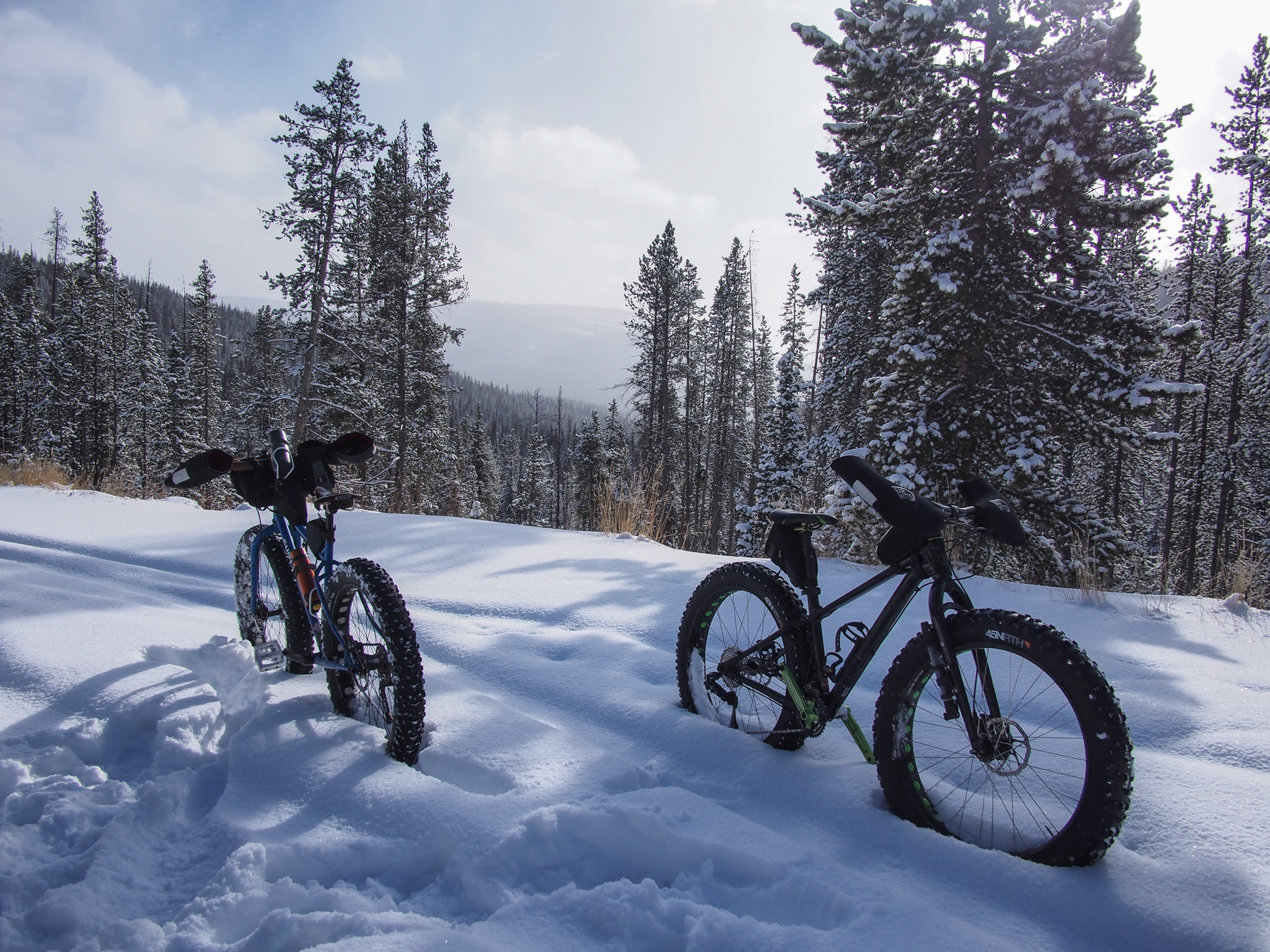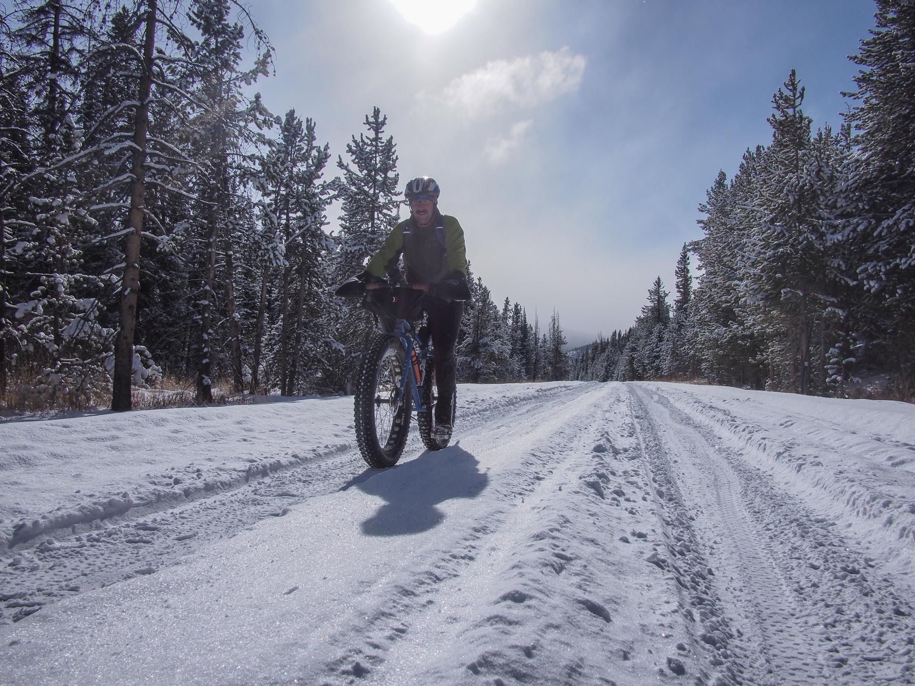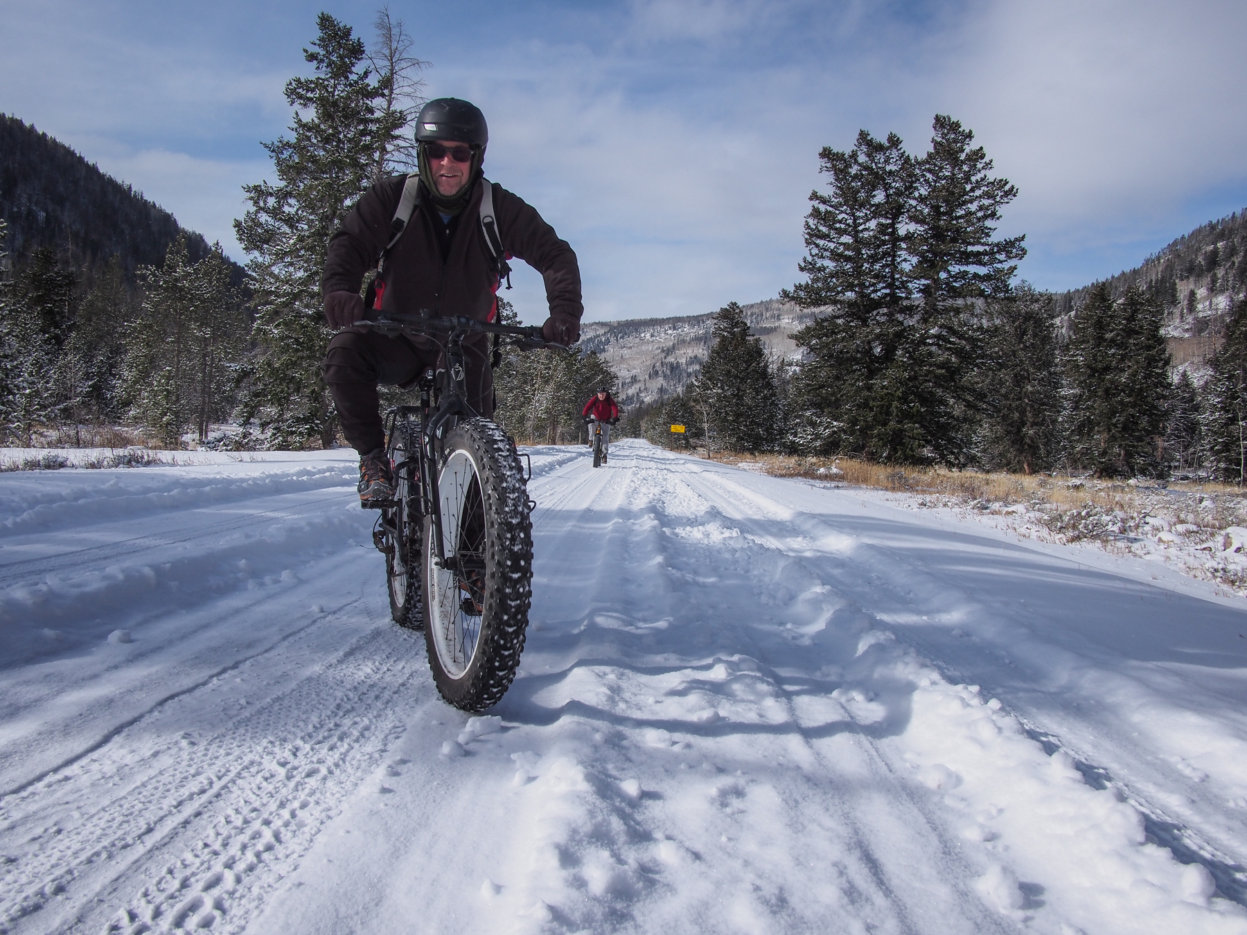 It is not officially gated yet, but it isn’t plowed either. A couple four wheel drive trucks had driven up so it was packed out nicely. At Soapstone there was about 2 inches of snow and it got progressively deeper the higher we got. Riding conditions were outstanding and fast. An occasional truck would pass us, but no snowmobiles. It was dead quiet and peaceful with only the crunch and squeak of our tires on the snow.