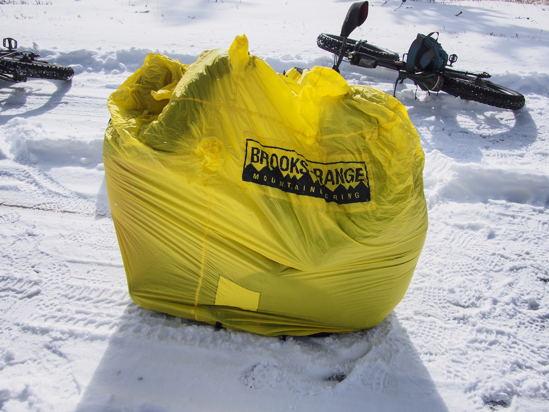 Part way up we decided to try out my bothy bag. This is an emergency shelter that is like a small floor-less, pole-less tent. In an emergency situation, like a big storm, or just to get out of the wind for a snack, two people put it over their head then sit down. The drawbacks are that for two big guys (i.e. fat), it’s a bit cramped in there and can be claustrophobic. When Doc and Bullet went in, they panicked and couldn’t get out, falling over in the process. Hearty laughing is a good way to stay warm. Then Doc and I got in to demonstrate how it works. I’ve had it for about three years and have only used it when taking a break to get out of the wind. I bring it cross country skiing or anytime I am out in the mountains for the day in Winter. It really does work and warms up inside really fast. You can also use trekking poles to hold it up.