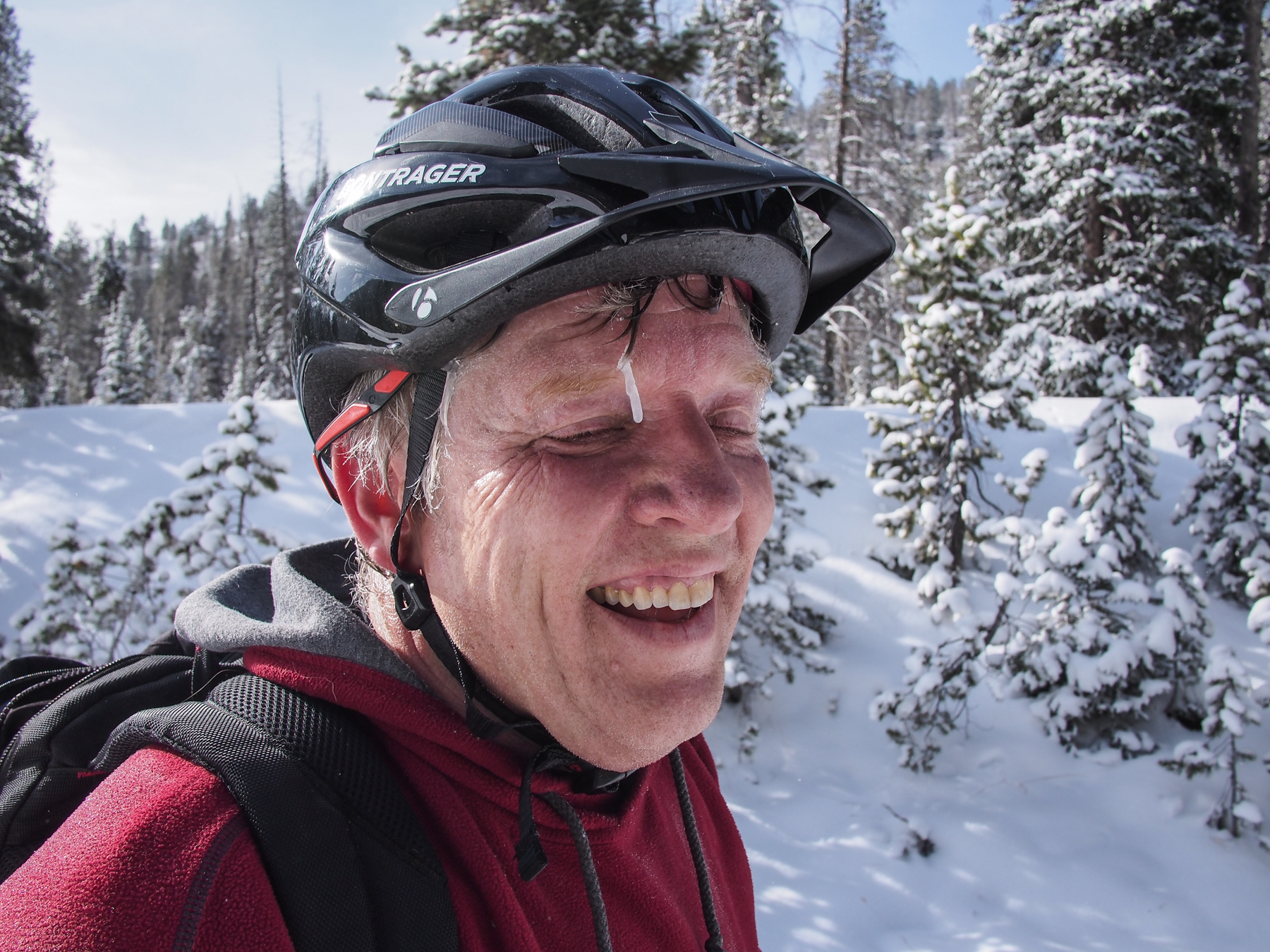 We’re hoping to ride all the way to Baldy Pass before the Winter is over. That will mean another six miles past where we stopped and another 1500 feet of climbing. It tops out at 10,715′. We topped out at 9343′. That would make for about 30 miles of riding, but we should be up to it with some more snow riding under our belts. We will have to pick a day with good conditions, as it can get loose and sloppy up there if it isn’t too cold, or if the trail is churned up by snowmobiles.