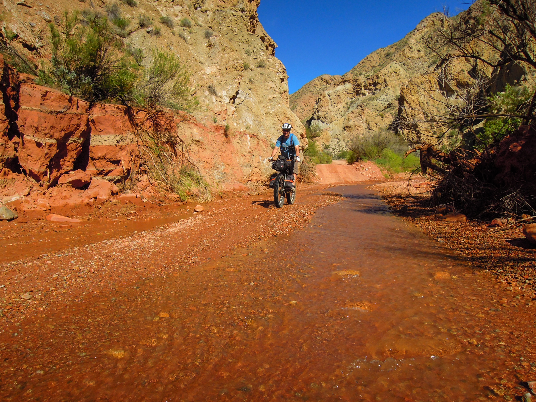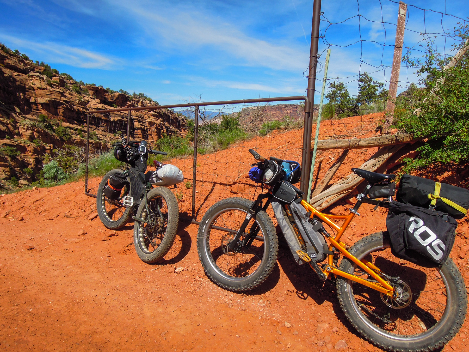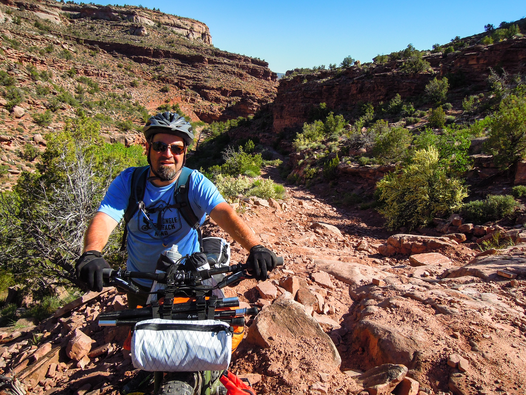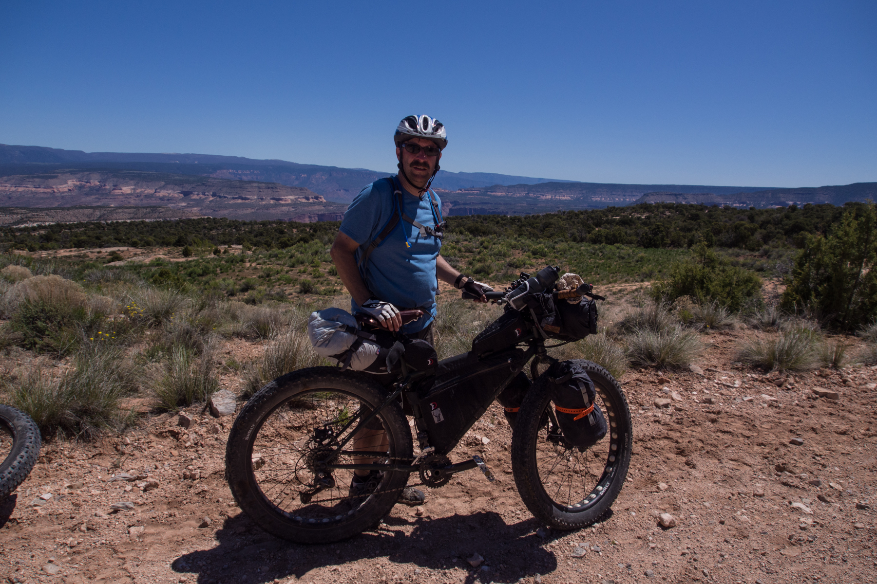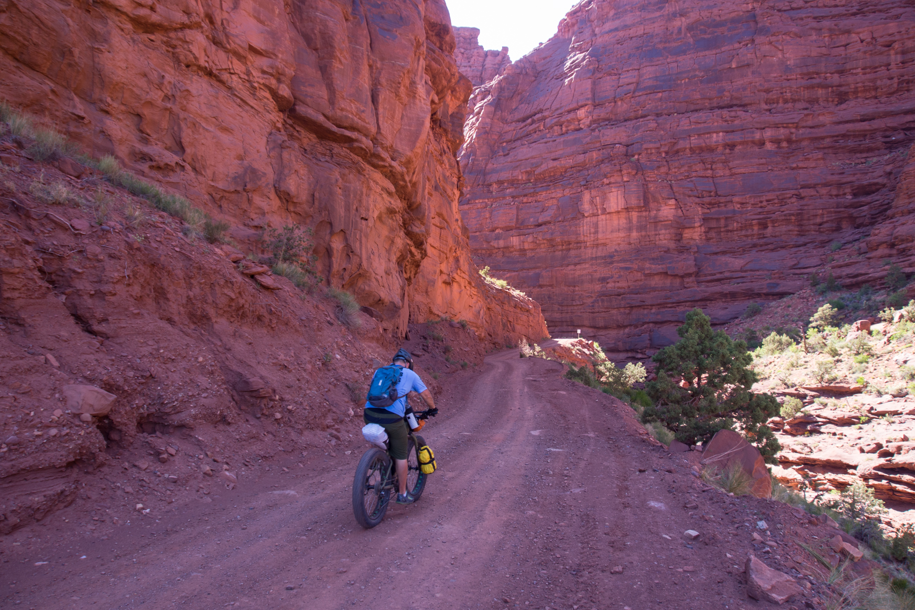 I broke out some of my carefully rationed salami and cheese and thoroughly enjoyed eating real food, a nice change from bars, gels, and nuts. We then walked our bikes down the rough hill. Jess, who had been here before, told us that if we knew the line you could probably ride it, but without knowing it was rough, with several 3-4′ ledges. I’m always surprised at what they take four wheelers up and down in the desert. At the bottom we had another long, steep climb that we mostly pushed up to get to a saddle before dropping into the verdant Fisher Valley.