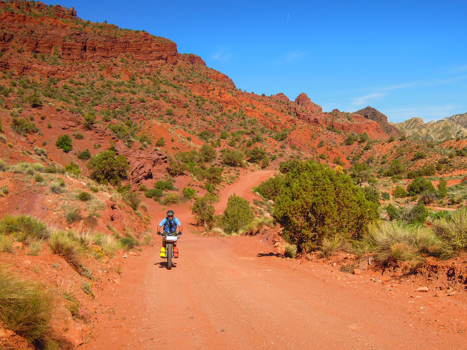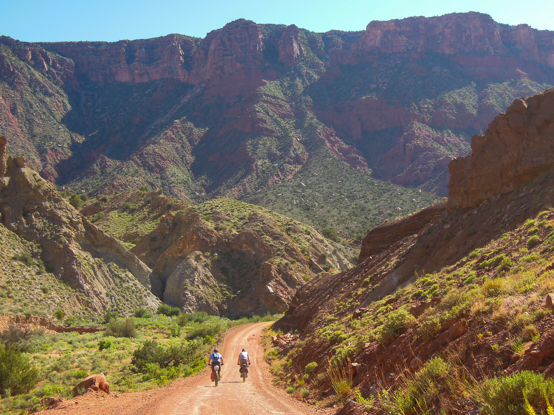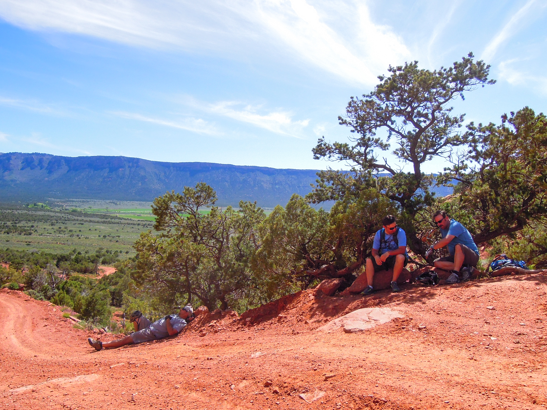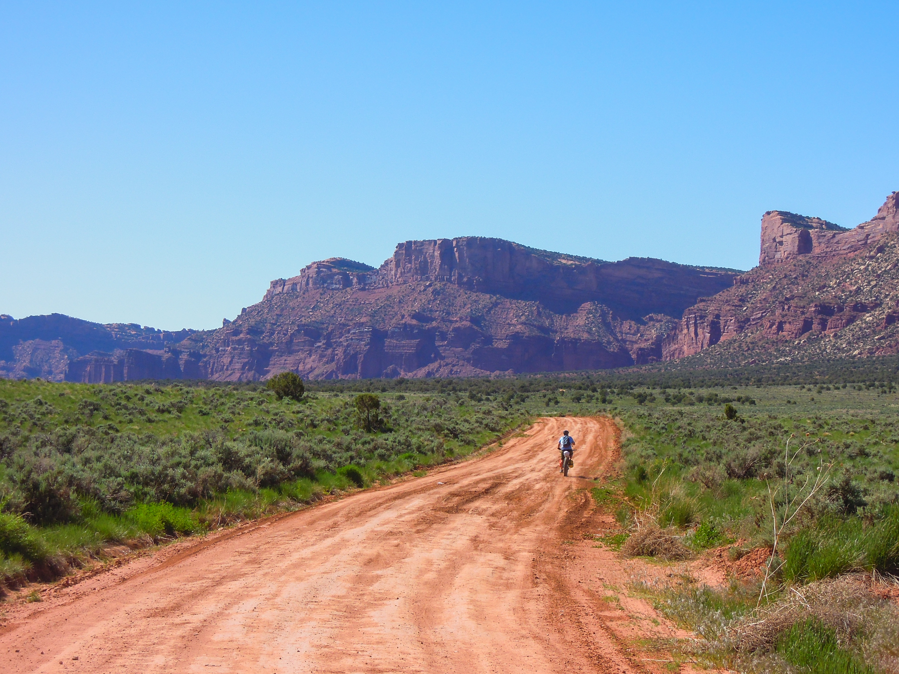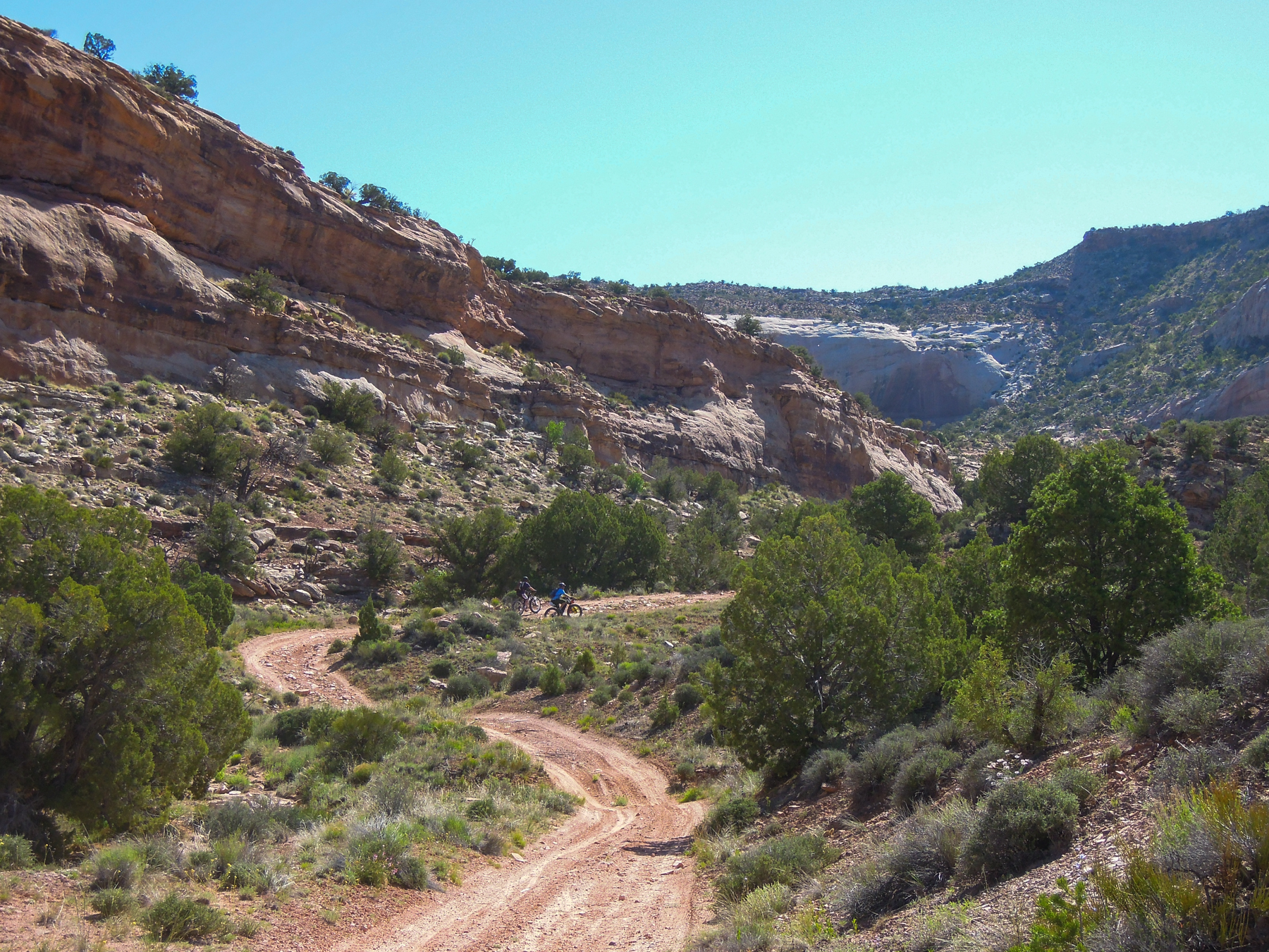 Once into the valley, we pulled out the maps and discussed our situation. We were only 18 miles into our day and had planned an additional 22 to get to where we planned to camp, at Rock Castle Campground in Castle Valley. The problem was that is was already midafternoon, it was pretty warm, and we still had considerable climbing to get there. In fact, this is where the real climbing begins on Kokopelli’s Trail. We had already climbed about 3000′ that day, and still had a couple thousand feet more to go. And we were tired. We were down to three riders. We aren’t much on quitting what we set out to do, but we also know our limits. After some discussion, we decided to push on to Hideout Campround, only 3-4 miles further on, and camp there for the night. This would leave us with quite a lot of steep miles to finish which meant that we would probably have to take a fifth day. We rode through the tranquil valley on a wide, red dirt road. The road curved around a bluff then began climbing up Thompson Creek Road. After a steepish climb we topped out on a saddle and could see down into the narrow valley below. Boyd and Doc had gone on ahead to the campground. At this point, we weren’t too keen on dropping down this steep road into the unknown below. Our thinking was that if we were going to bail, which was a real possibility at this point, we didn’t want to descend into the next canyon only to have to turn around and climb back out (it turned out to be a 1000′ descent). None of us wanted to ride down there to find Boyd and Doc, so when a woman came along on an ATV, Jess convinced her to let him borrow the ATV to ride down and find the guys in the jeep.