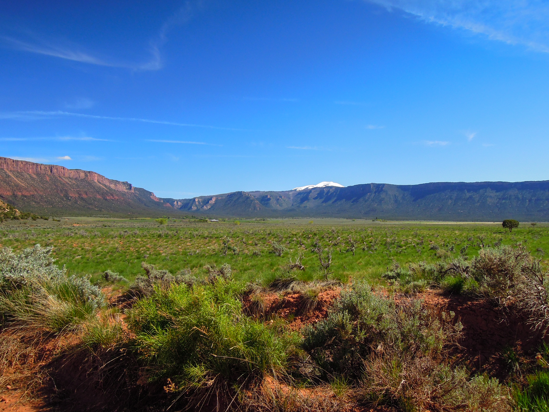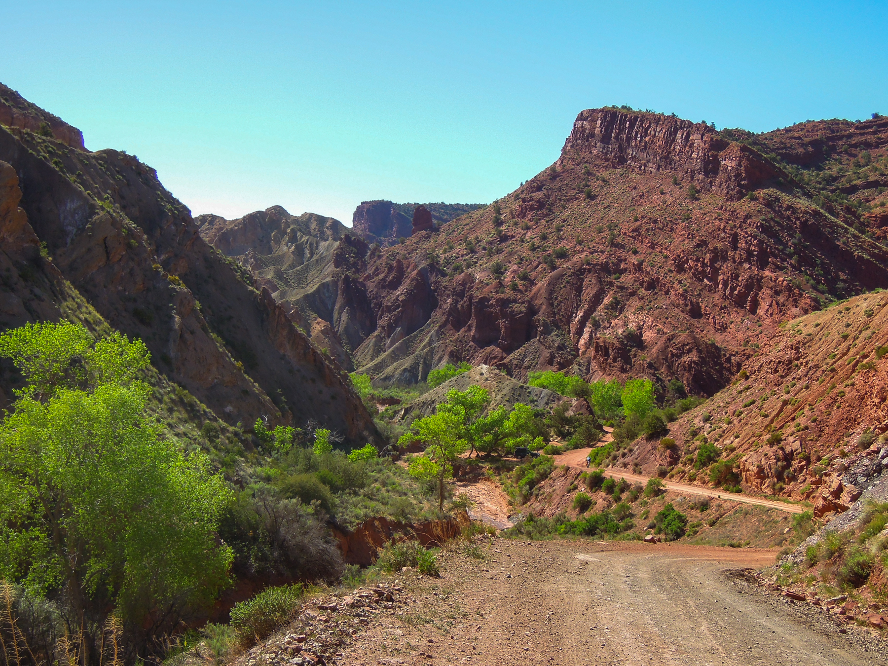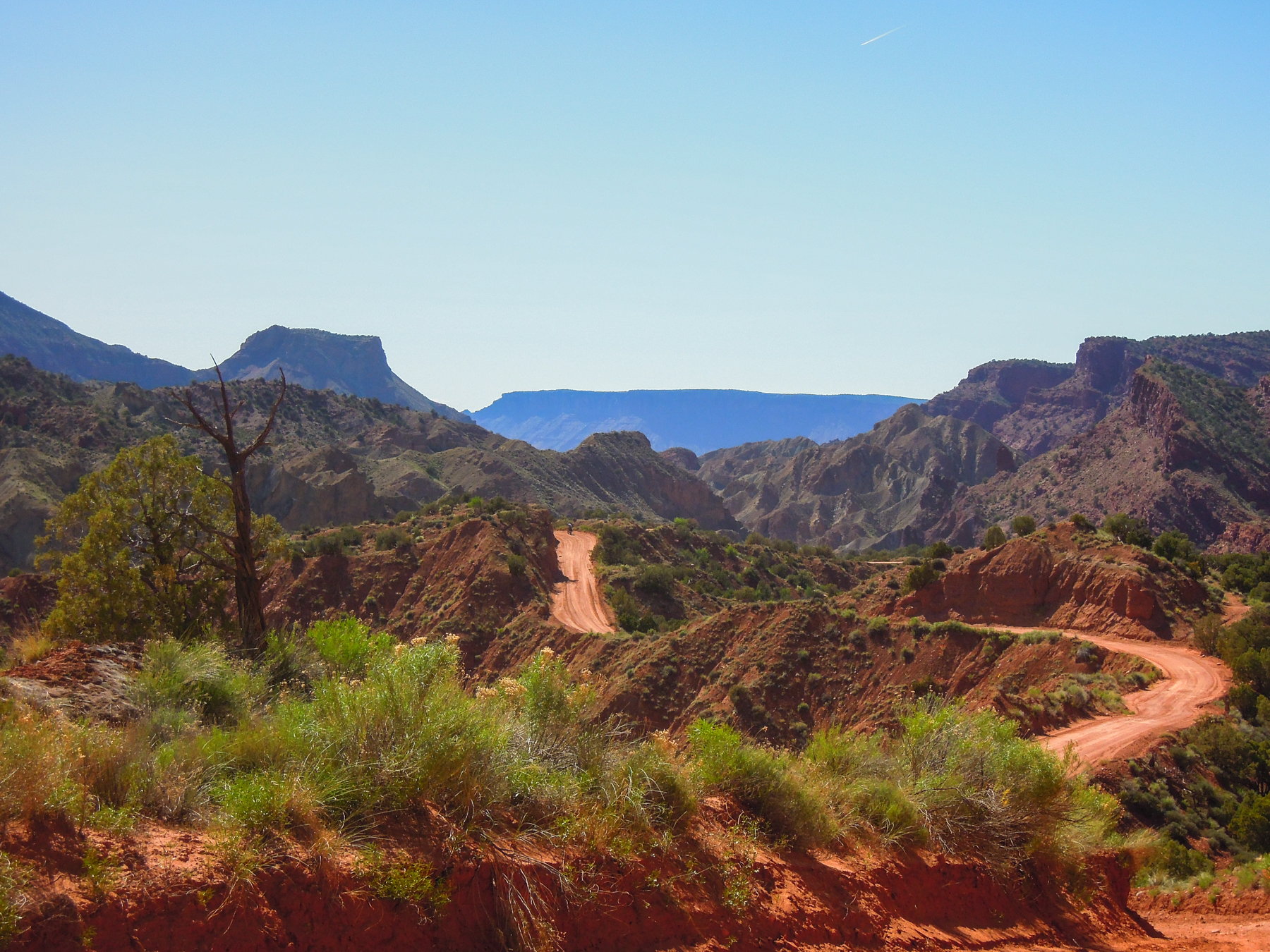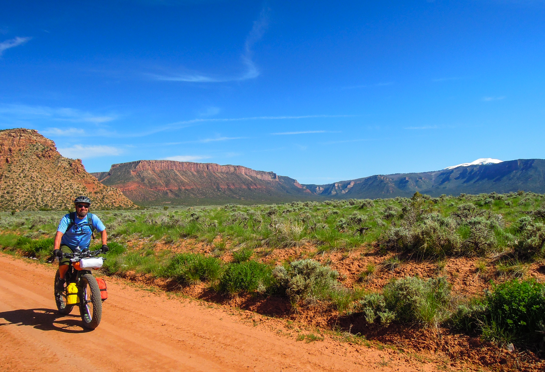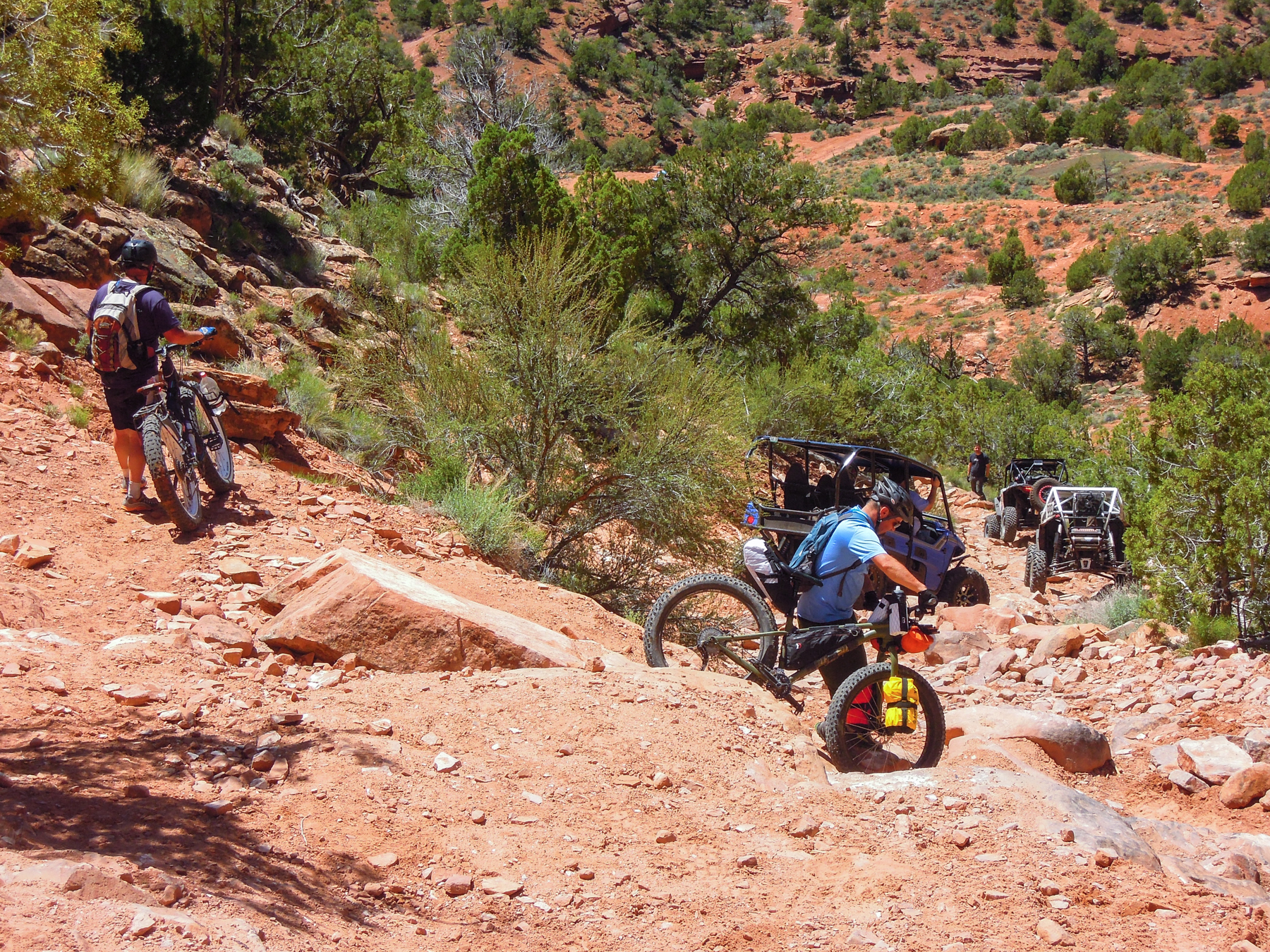 Once into the valley, we pulled out the maps and discussed our situation. We were only 18 miles into our day and had planned an additional 22 to get to where we planned to camp, at Rock Castle Campground in Castle Valley. The problem was that is was already midafternoon, it was pretty warm, and we still had considerable climbing to get there. In fact, this is where the real climbing begins on Kokopelli’s Trail. We had already climbed about 3000′ that day, and still had a couple thousand feet more to go. And we were tired. We were down to three riders. We aren’t much on quitting what we set out to do, but we also know our limits. After some discussion, we decided to push on to Hideout Campround, only 3-4 miles further on, and camp there for the night. This would leave us with quite a lot of steep miles to finish which meant that we would probably have to take a fifth day. We rode through the tranquil valley on a wide, red dirt road. The road curved around a bluff then began climbing up Thompson Creek Road. After a steepish climb we topped out on a saddle and could see down into the narrow valley below. Boyd and Doc had gone on ahead to the campground. At this point, we weren’t too keen on dropping down this steep road into the unknown below. Our thinking was that if we were going to bail, which was a real possibility at this point, we didn’t want to descend into the next canyon only to have to turn around and climb back out (it turned out to be a 1000′ descent). None of us wanted to ride down there to find Boyd and Doc, so when a woman came along on an ATV, Jess convinced her to let him borrow the ATV to ride down and find the guys in the jeep.