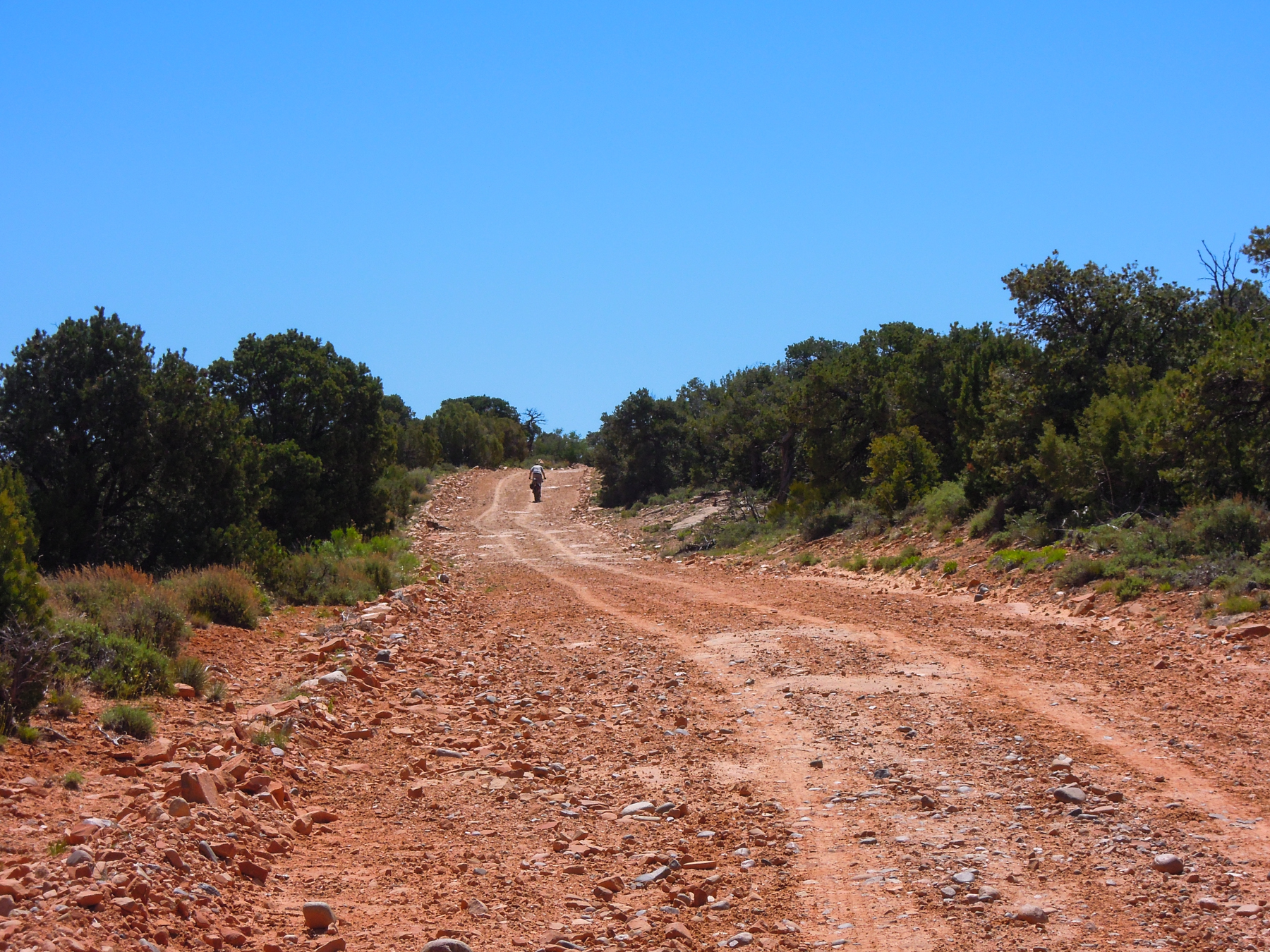 After topping out on one of these ridges we had a nice descent deep into the shaded red rock Cottonwood Canyon. Near the bottom of the canyon, our trail turned off and ascended a very steep, rocky, chunky track back up to the rim. This made for some stiff hike-a-bike.