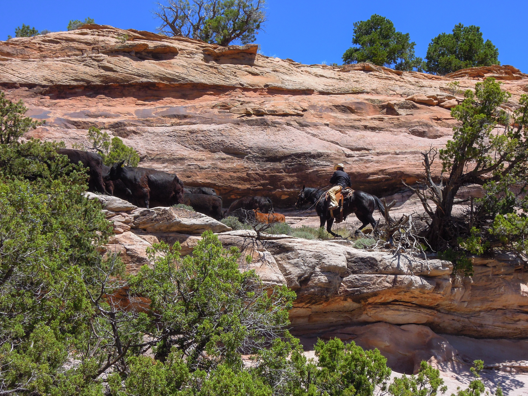 Once on top we traversed around a bluff then began a rugged descent down a blocky, rocky track that eventually led to the top of Rose Garden Hill, a well known 4 wheeler climb. Along the way, we ran into a lone cowboy herding a group of about 50 head of cattle off a cliffy peninsula. Watching him work in the heat, on horseback, in this remote and rugged terrain reminded us that we were wimpy city guys. At the top of Rose Garden Hill we took a break and chatted with a group of 4 wheelers from Southern California.