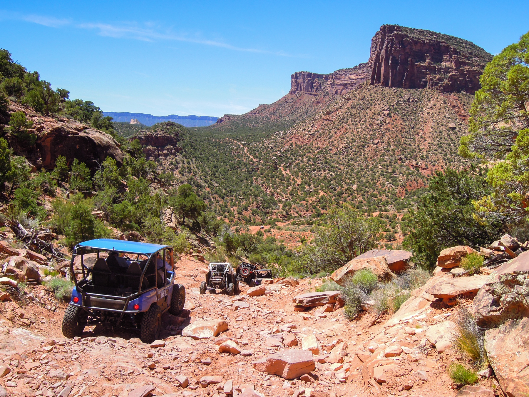 Four wheelers heading down Rose Garden Hill, with our route climbing up the other side of the valley