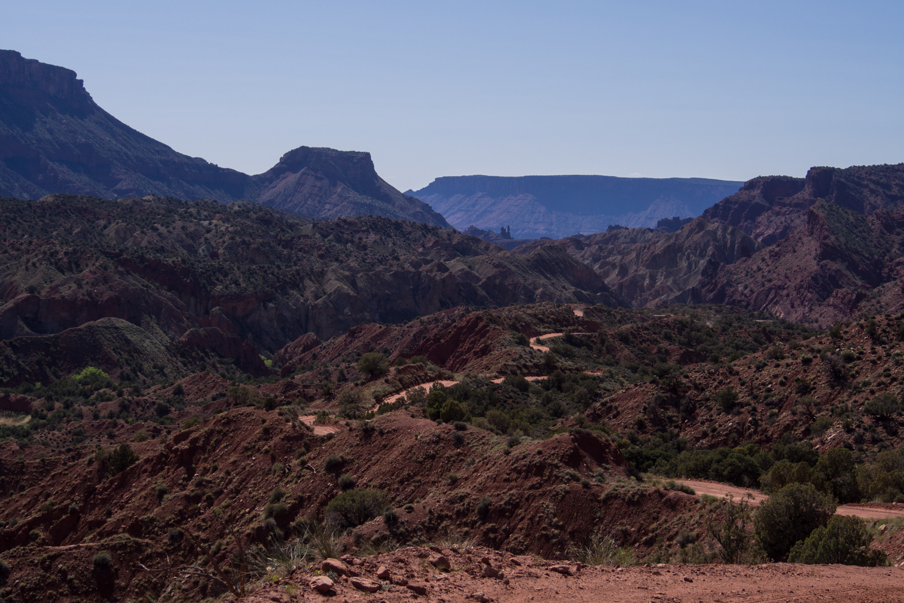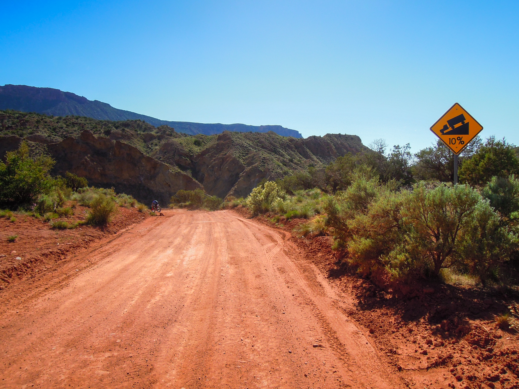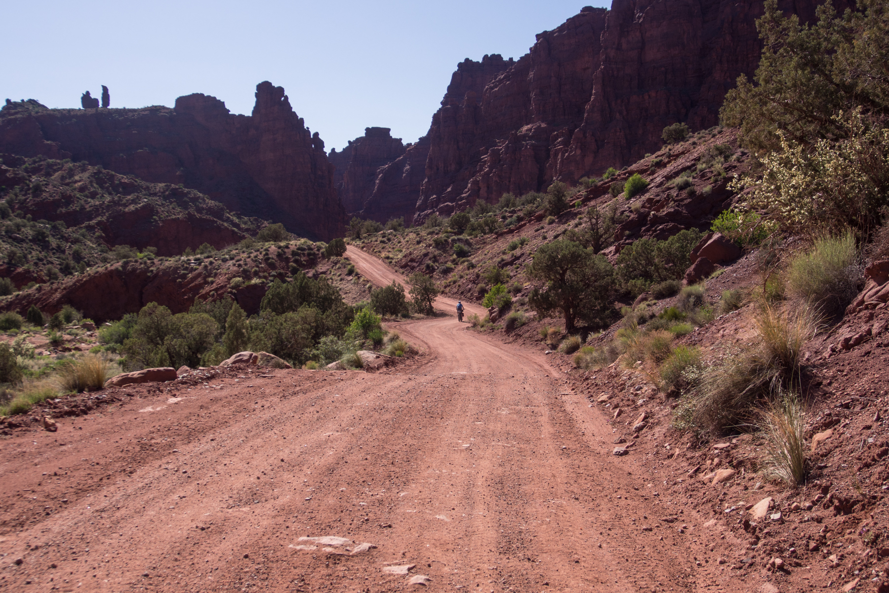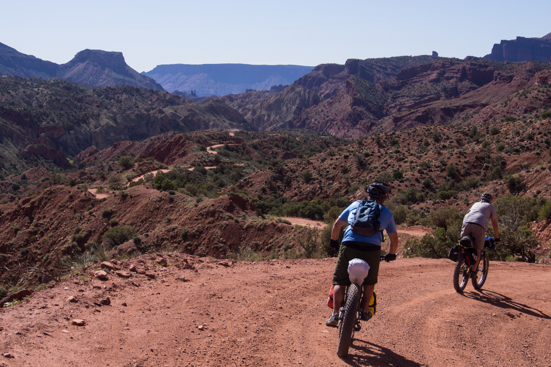 We were tired and running out of day, and had finally admitted that maybe this was a little too much. With thousands of feet still to climb, we were not confident we had it in us, even if we did take an extra day. We discussed several options, but the one that appealed most was to bail here and ride down Fisher Valley to the highway. We thought about spending the night in Moab, then riding Porcupine Ridge the next day with unencumbered bikes. We felt rather than limping along and finishing the ride in poor style would not be as good as bailing, and it would be better to come back another time to do it right, when we were better conditioned.