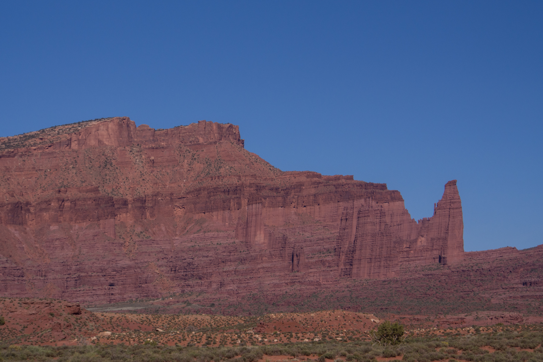 Foreground: the bottom of Rose Garden Hill; the route heads up to the saddle to the left before dropping into Fisher Valley. The ridge in the distance separates Fisher and Castle Valleys.