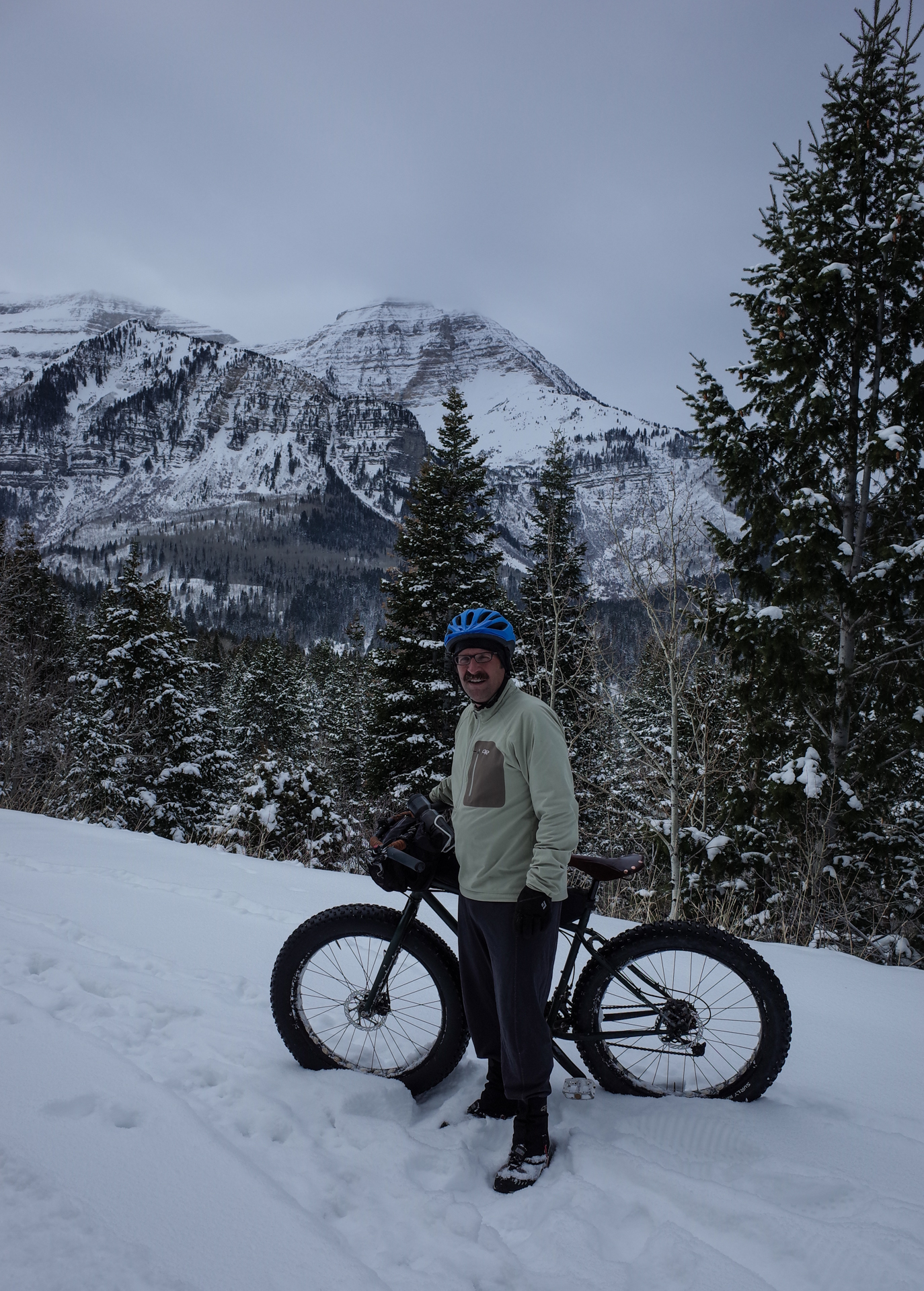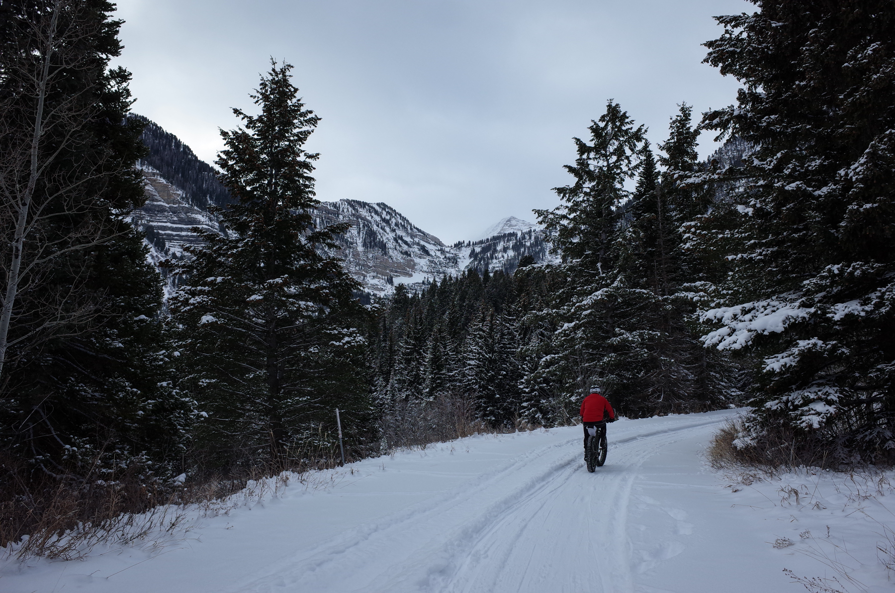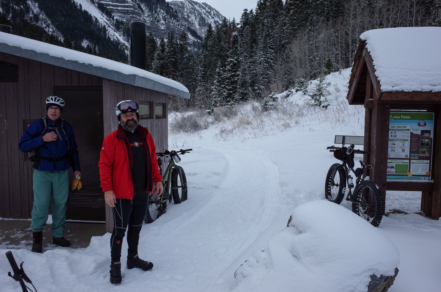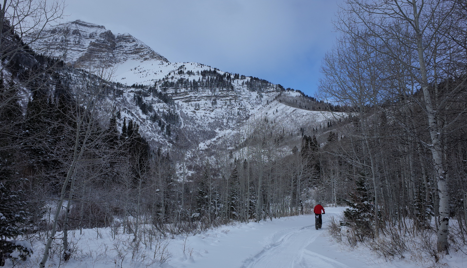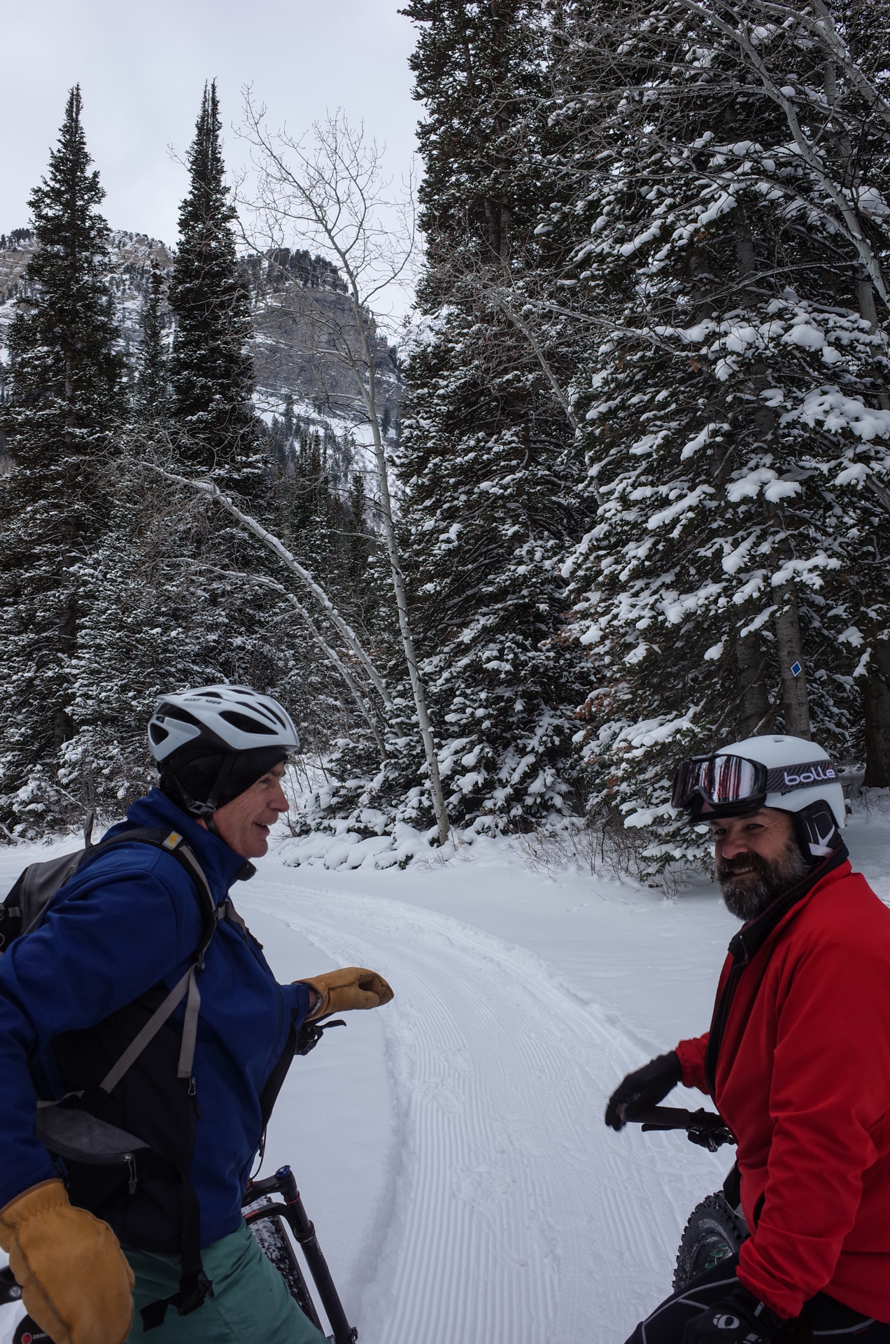 We had hoped to ride Trail 150 out of Timpooneke but unfortunately it was not packed out. We got about 40 yards before we were wiping out in the soft, deep snow. But the Forest Service had groomed a nice trail through and the around the campground, though it was only about 1.5 miles or so. The trail was in excellent condition and the views of the North summit of Mt. Timpanogos were pretty spectacular.